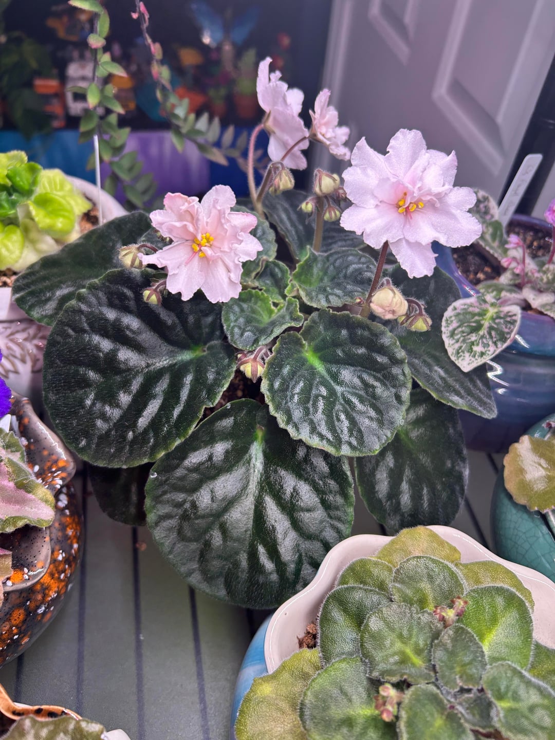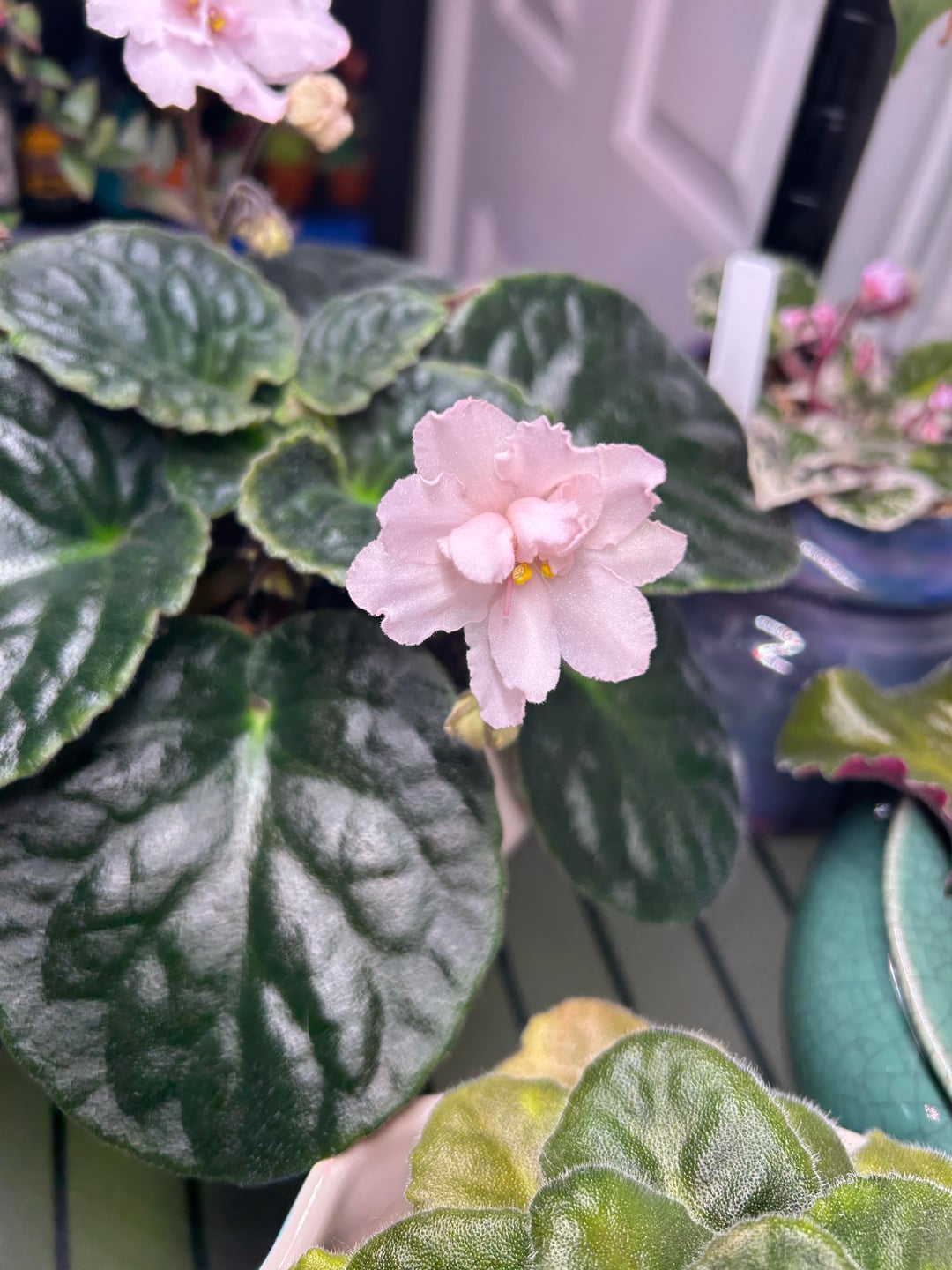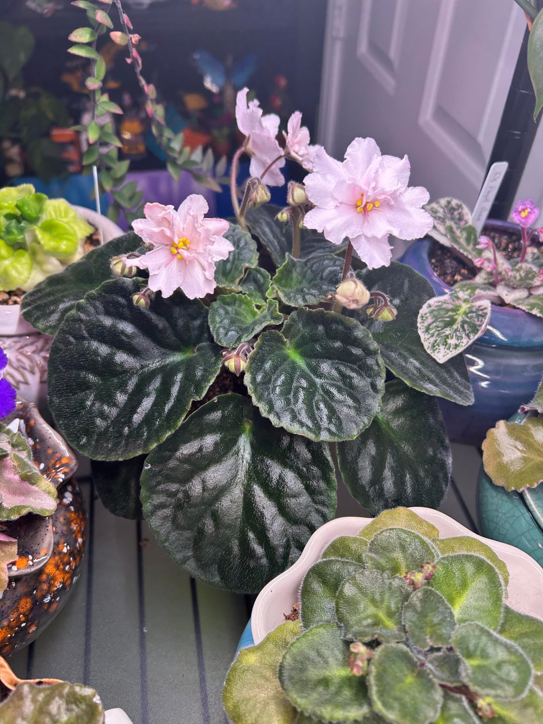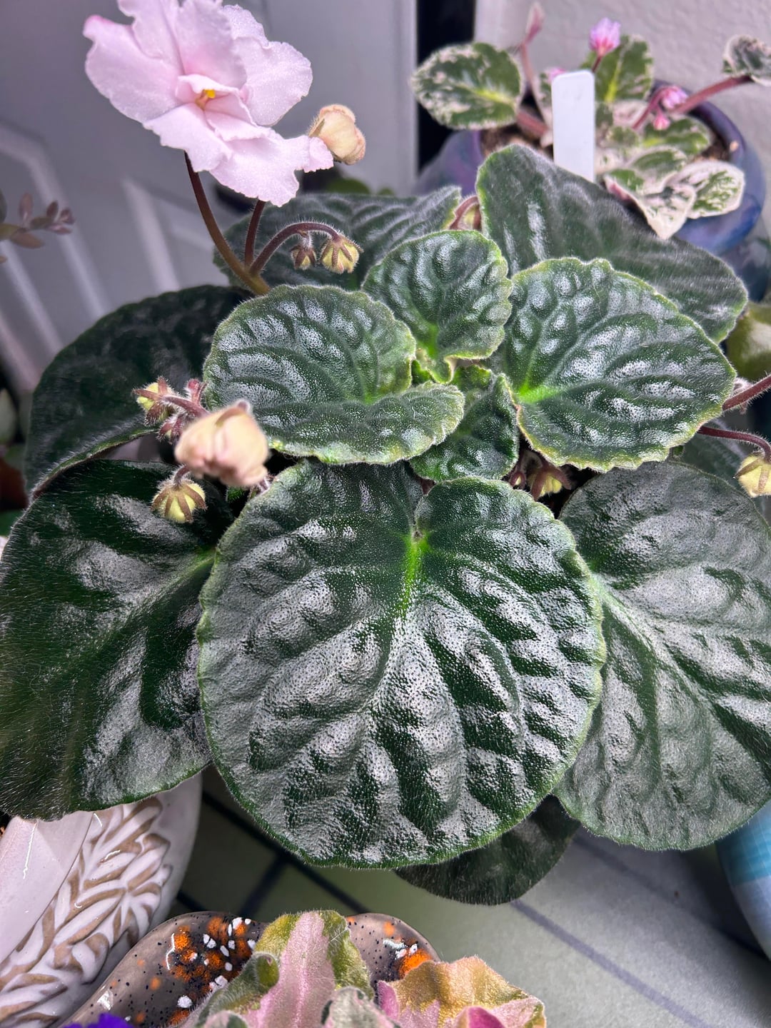 Usambaraveilchen: NoID: Hoffman White Usambaraveilchen: perlweiße halbgefüllte/gefüllte Blüte, eiförmige mittelgrüne Oberseite mit hellgrünen/violetten Blättern auf der Unterseite, gleichmäßiges Rosettenmuster, Standard.