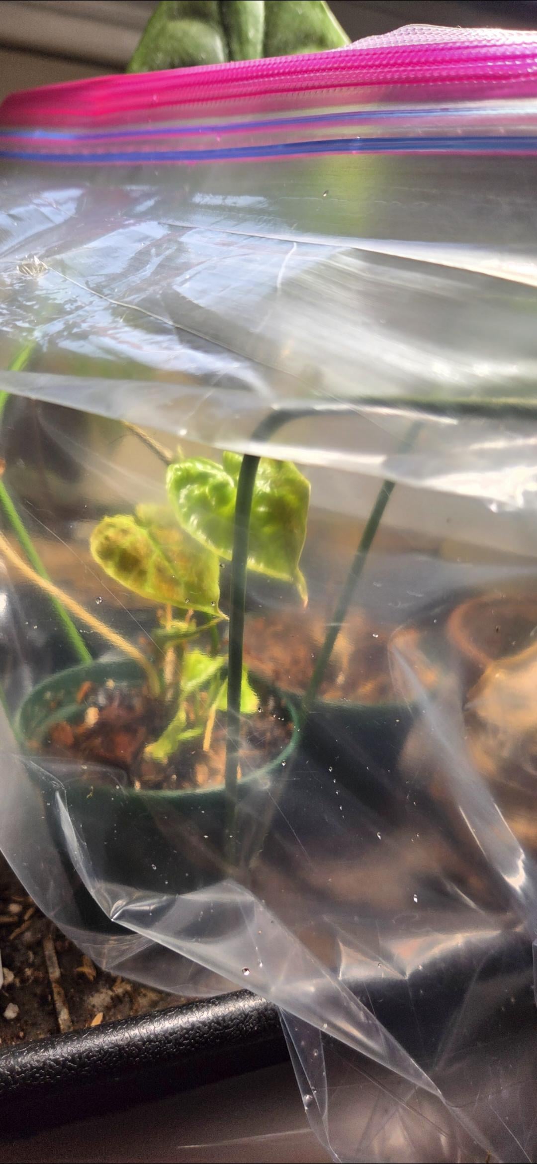 Ich habe eine Gruppe von 4 Pflanzen von thegreenescape bekommen (nicht wahr, ich weiß. Ich hatte vor langer Zeit eine Gratisbestellung, und sie haben sie angenommen) und sie gingen wie alle meine Pflanzen direkt in die Quarantäne. Ich war noch nicht dazu gekommen, sie umzutopfen oder zu behandeln, und was weißt du … Spinnmilben. Ich bin irgendwie froh, dass ich darauf gewartet habe, dass sie sich zeigen, denn sie benötigen eine längere Behandlungszeit und regelmäßiges Aufsprühen, bevor sie systemische Mittel hinzufügen. Ich hasse sie auch am meisten, weil sie einen längeren Behandlungszeitraum und streng gleichmäßige Sprühvorgänge erfordern! Wie dem auch sei, diese kleine Verrucosum mini kommt irgendwann ins Terrarium, aber bis dahin habe ich keine Behälter mehr, um sie unter Quarantäne zu stellen und zu akklimatisieren. Außerdem stieß er ständig gegen die Tasche und ließ die Blätter schmelzen, also nahm ich ein paar flexible Pfähle und baute ihn zu einem umgekehrten Tipi. Für euch, die Beutel für verschiedene Zwecke verwenden: Wie oft und wie lange entlüftet ihr den Beutel, da es offensichtlich keinen Ventilator gibt?