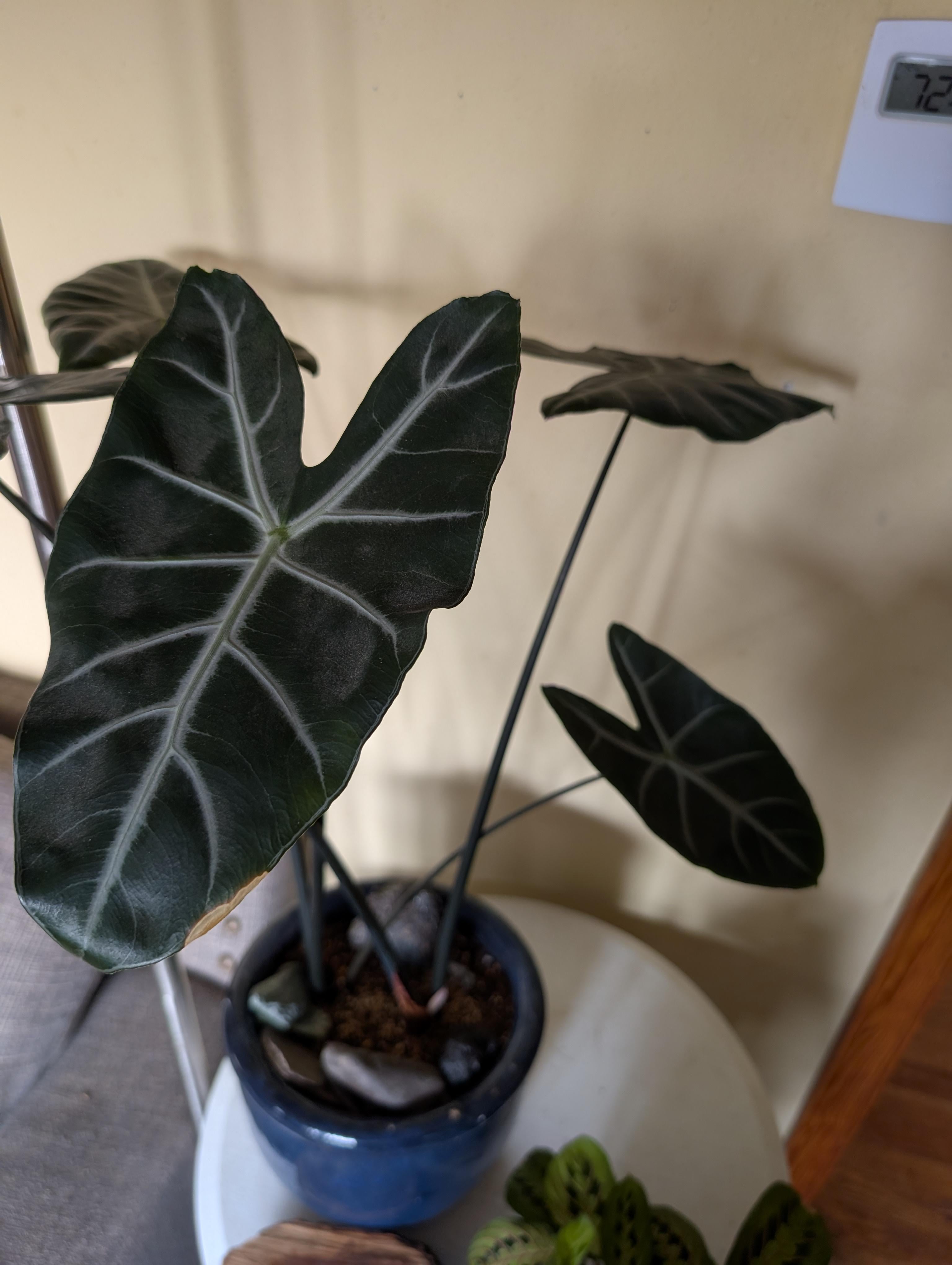 Kann mir jemand einen echten Ausweis dieser Alocasia geben? Es ist mehrere Jahre alt und ich habe mehrere Male damit angefangen. Ich erhalte jedes Mal ein anderes Ergebnis, wenn ich nach einem Bild davon suche, aber keines der Beispiele sieht diesem so ähnlich, dass ich es problemlos identifizieren könnte. Die Stängel haben eine ähnliche Farbe wie die Blätter und die Blattunterseiten haben einen violetten/burgunderroten Farbton. Danke!