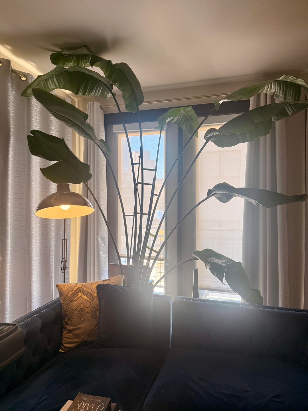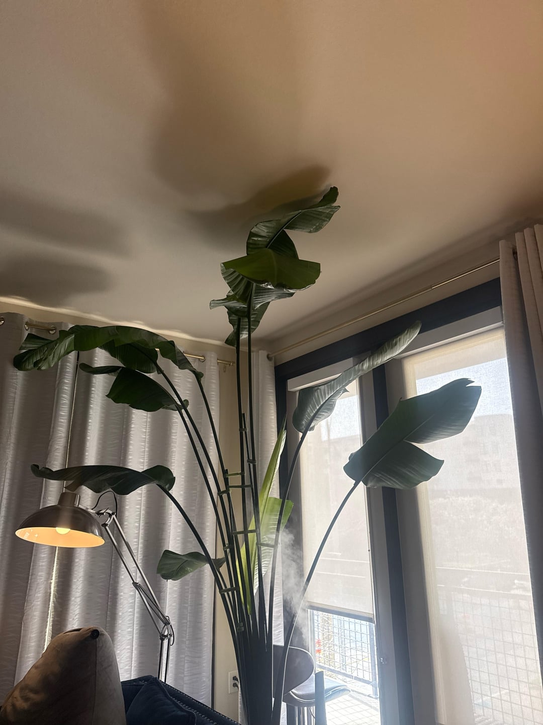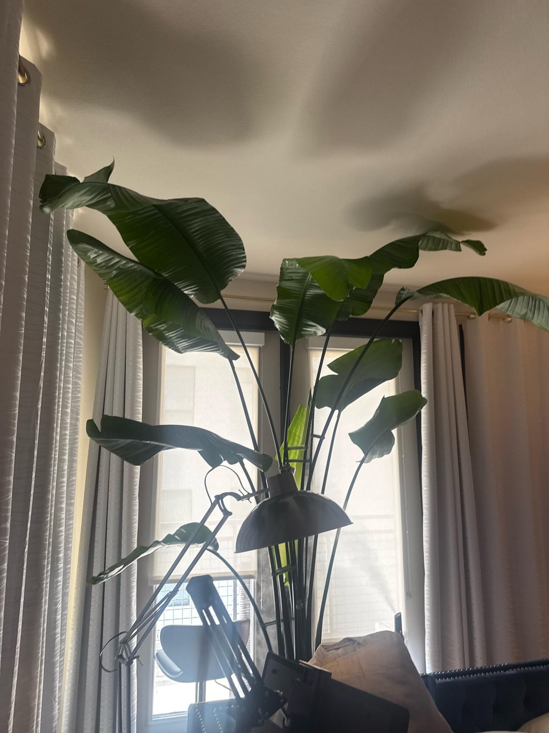 Mein Paradiesvogel Fiona ist ungefähr 5 Jahre alt und ist vor ein oder zwei Jahren über meine 9 Fuß hohen Decken hinausgewachsen, aber sie wächst einfach weiter (wie Sie an ihrem neuen Blatt sehen können). Da sie jedoch fast 3 m groß ist, ist sie unglaublich kopflastig, also habe ich sie stark abgesteckt. Außerdem begann sie, sich mehr zur Seite zu neigen, und selbst wenn ich den Topf ein paar Monate lang drehe, scheint es, als ob die Sonne dem Gewicht nicht gewachsen ist. Ich muss sie umtopfen, aber ehrlich gesagt sieht es nicht wirklich so aus, als ob sie über die Breite des Topfes hinauswächst, wenn ich den Stiel so ausrichten würde, dass er zentrierter ist.