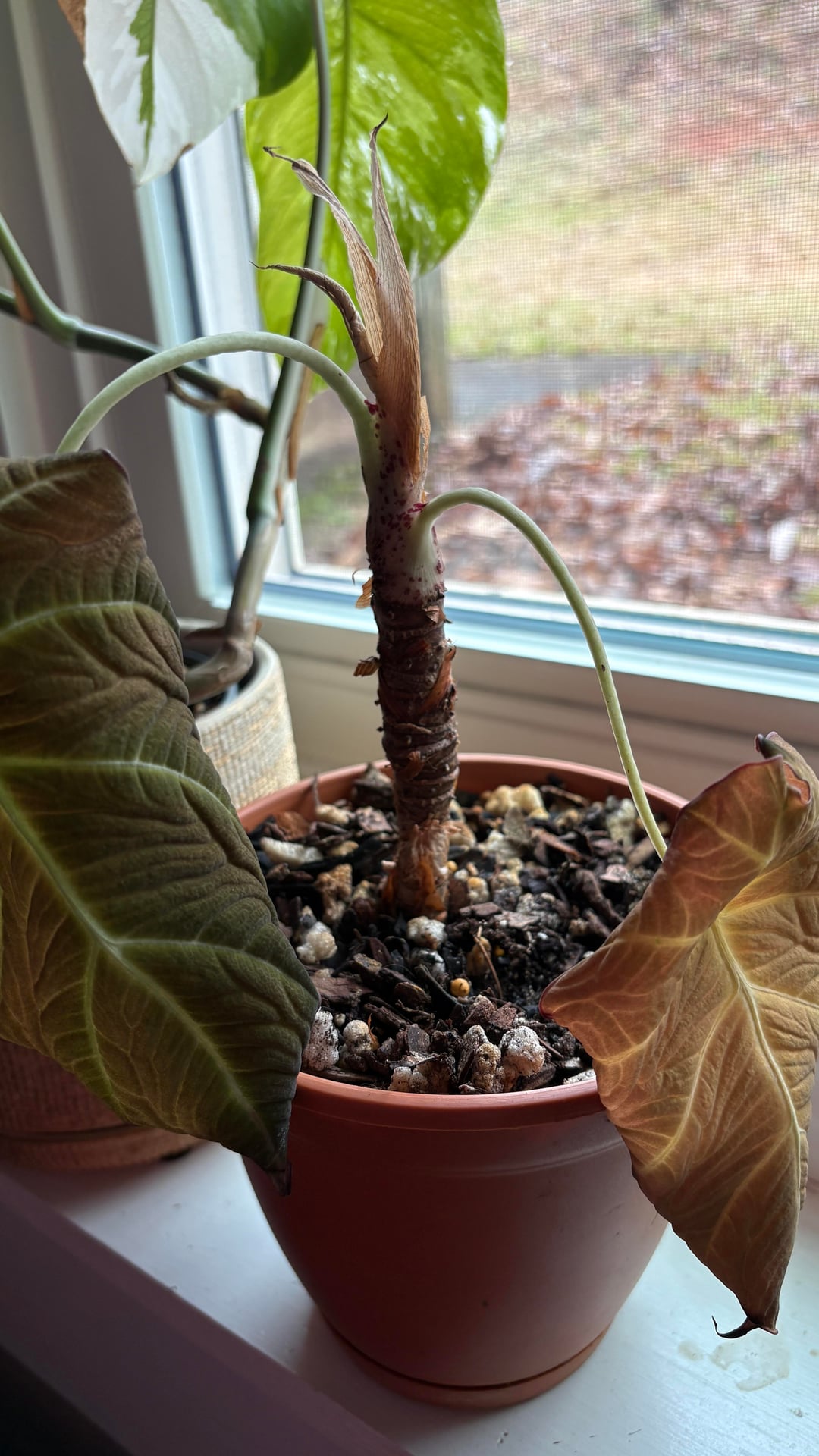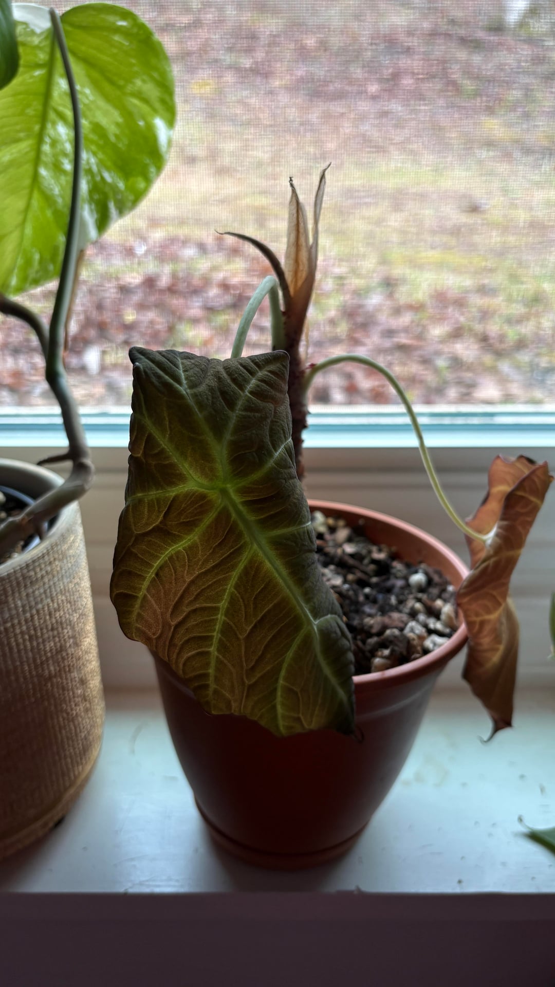 Ich habe kürzlich viele Pflanzen von jemandem auf dem Marktplatz gekauft. Die meisten Pflanzen waren in ziemlich gutem Zustand, aber diese (ich glaube, eine Art Alocasia) hat eine Art Wehwehchen hinter sich.