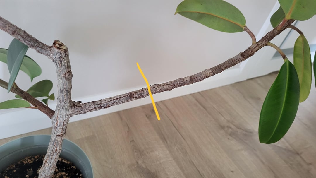 Ich habe die Stelle, an der ich schneiden möchte, etwas vom Hauptstamm entfernt markiert. Ich hoffe, dass dort nach dem Schnitt auch irgendwo ein neuer Zweig sprießt.