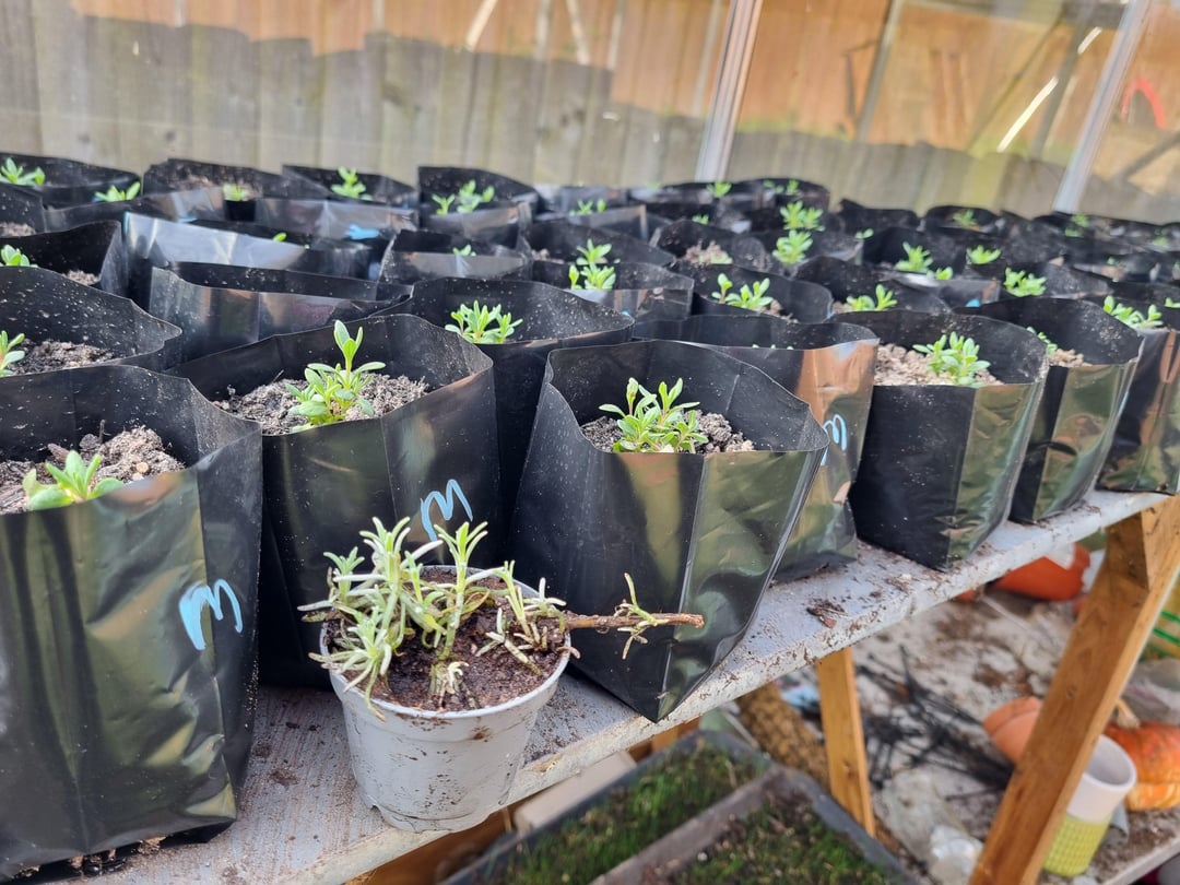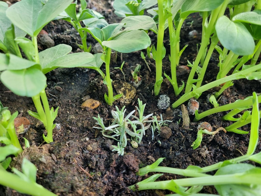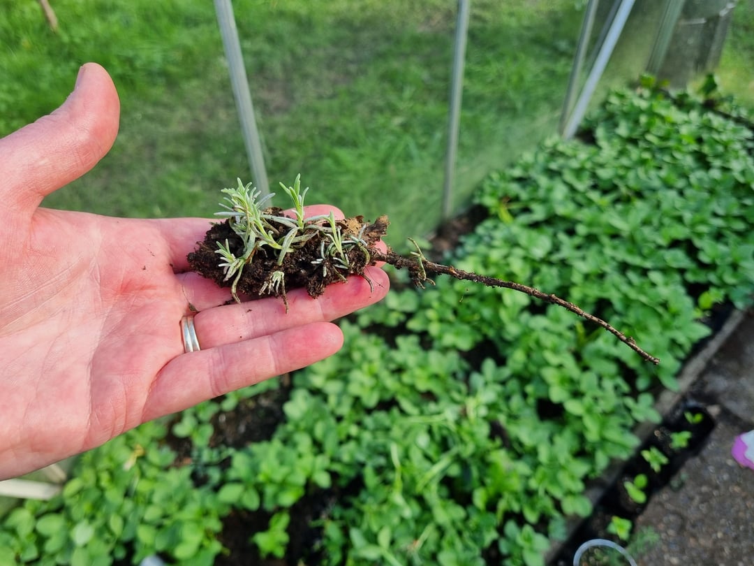 Dieser Steckling hat keine Wurzeln geschlagen. Es war ein knuspriger Zweig. Ein ehemaliger Lavendel. Ich habe es irgendwann letztes Jahr ins Gewächshausbeet geworfen. Ich habe die Gründüngung früher aufgegeben und das gesehen. Ich habe ihn zu seinen Freunden gebracht.