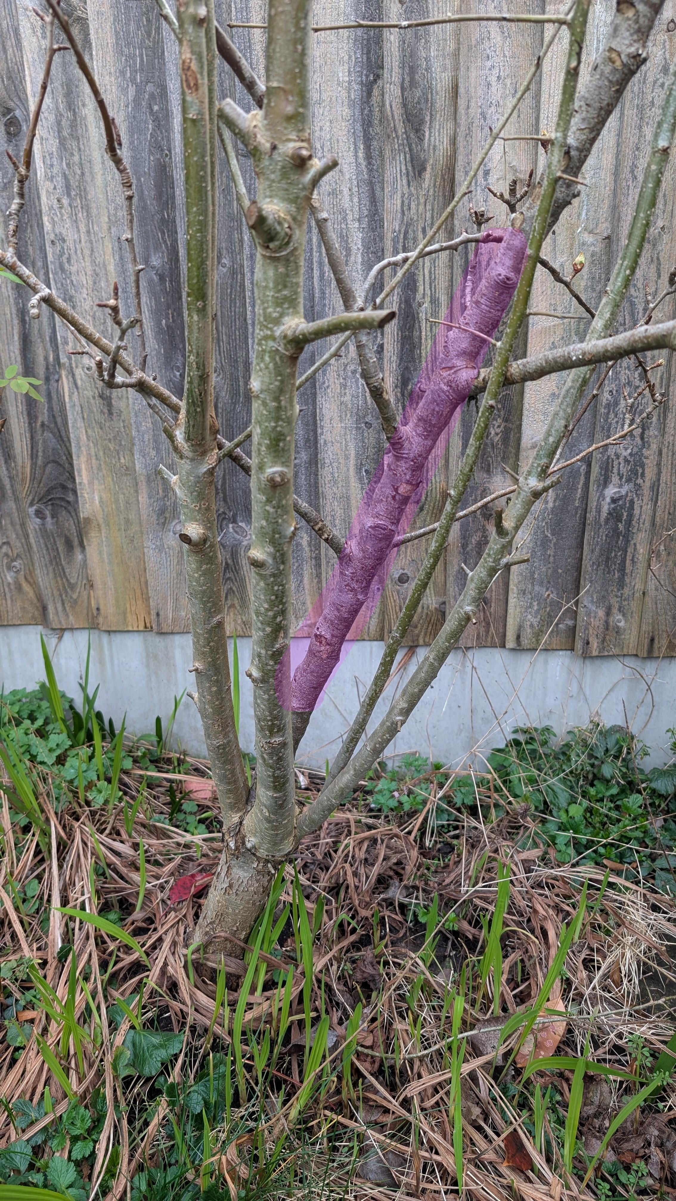 Ich bin kürzlich in ein neues Haus gezogen und dieser Birnbaum steht im Garten. Es sieht so aus, als wäre es aus einem Wurzelstock entstanden, der seit einiger Zeit gewachsen ist. Wenn ich alle Wurzelstockstämme entferne, wird das den Baum töten? Es sind wahrscheinlich 60 % des gesamten Baums. (Foto-Stamm-Hervorhebung in Rosa zeigt, dass der transplantierte Stängel einige Früchte hervorbringt, der Rest ist stachelig und wächst schnell)