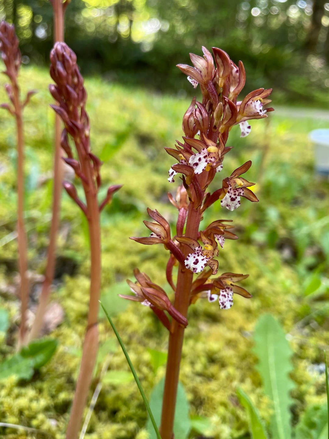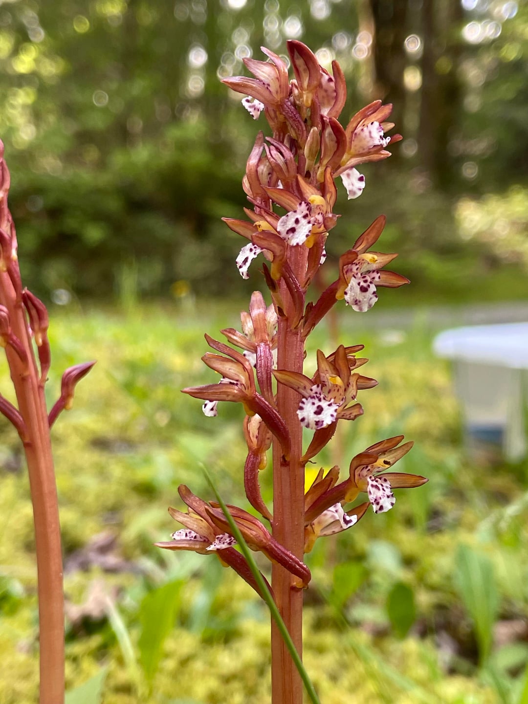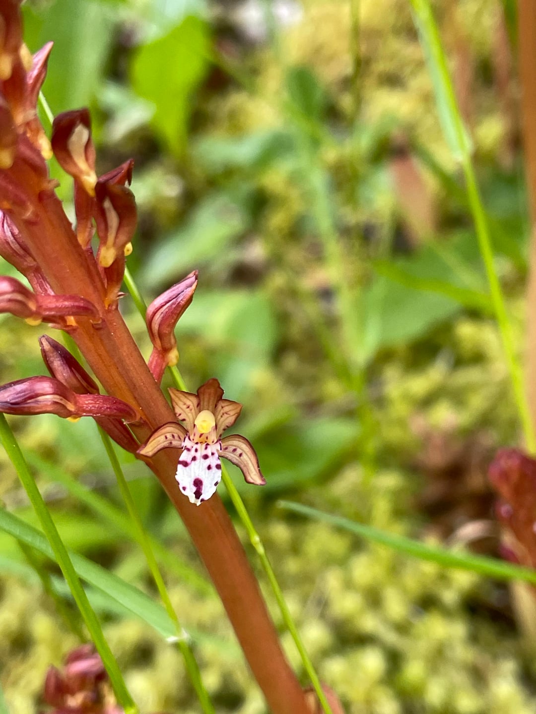 Gefleckte Korallenwurzel (Corallorhiza maculata) ist eine mykoheterotrophe Pflanze, was bedeutet, dass sie Nährstoffe von anderen benachbarten Pflanzen bezieht, indem sie das Myzel, das sie verbindet, parasitiert. Ich liebe diese Pflanze so sehr.