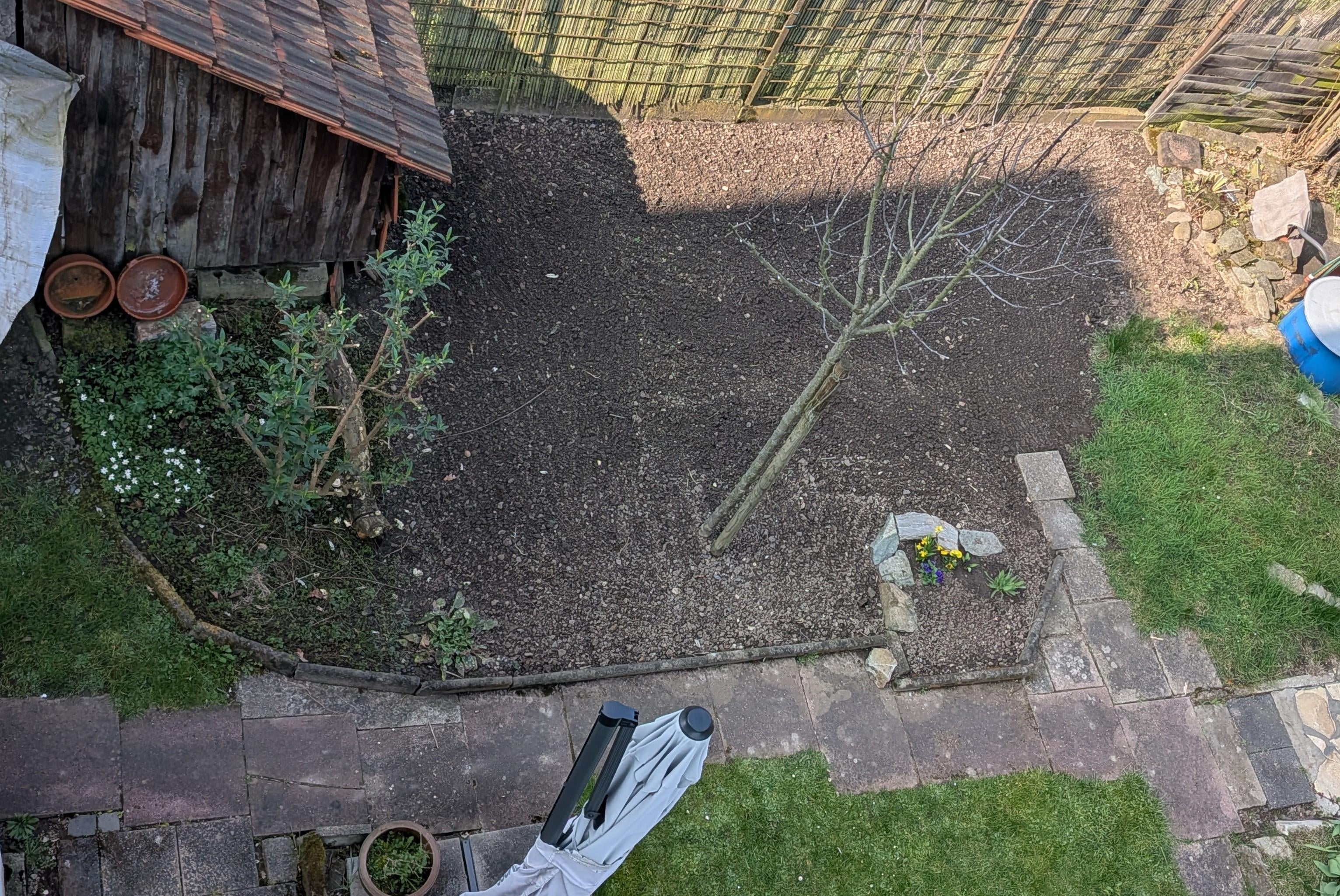 Das Teilstück liegt in Richtung Westen, ist durch das Nachbarhaus und Zaun aber auch öfter im Schatten.