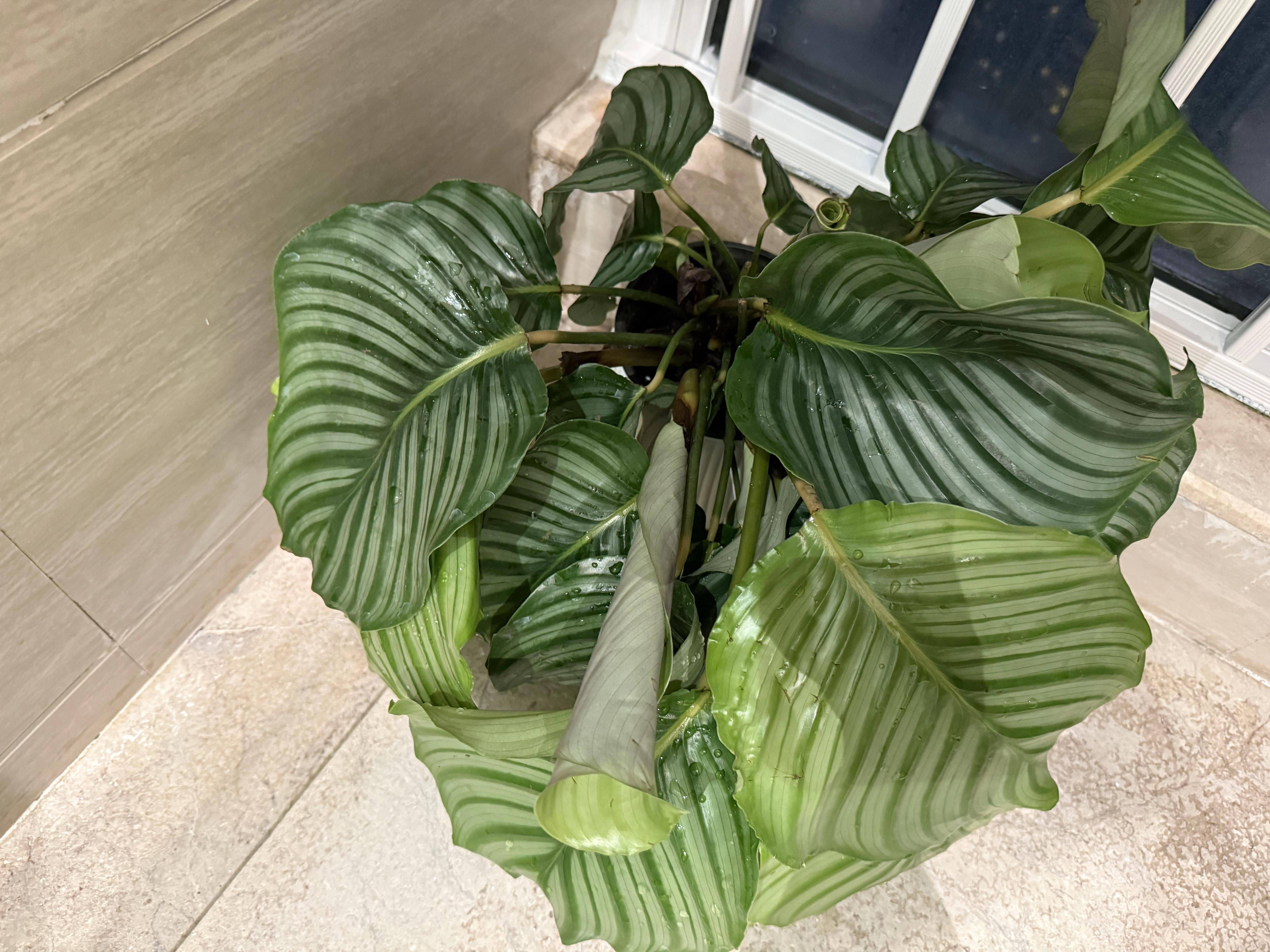 Ich habe gerade diese Calathea gekauft und zur Akklimatisierung auf den Balkon gestellt, aber während ich tagsüber weg war, wurde sie innerhalb von zwei Tagen zweimal vom Wind umgeweht.