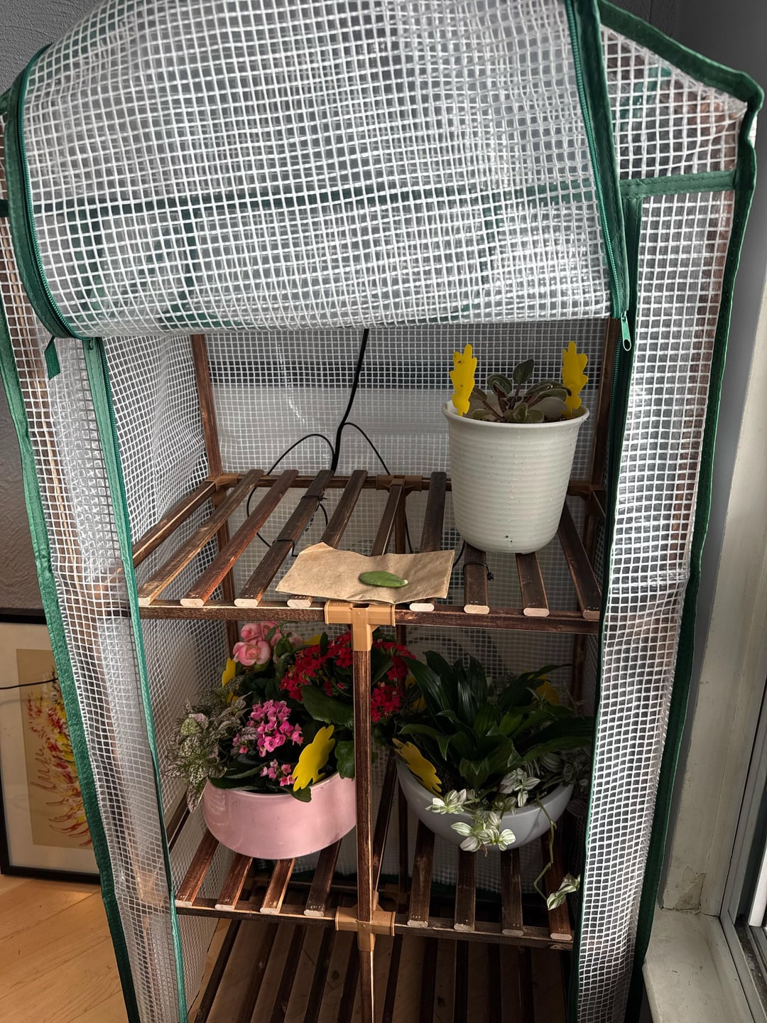 Alle Pflanzen leben in einem überdachten Pflanzenschutz vor einem Südfenster mit 6 Stunden Wachstumslicht am Abend.