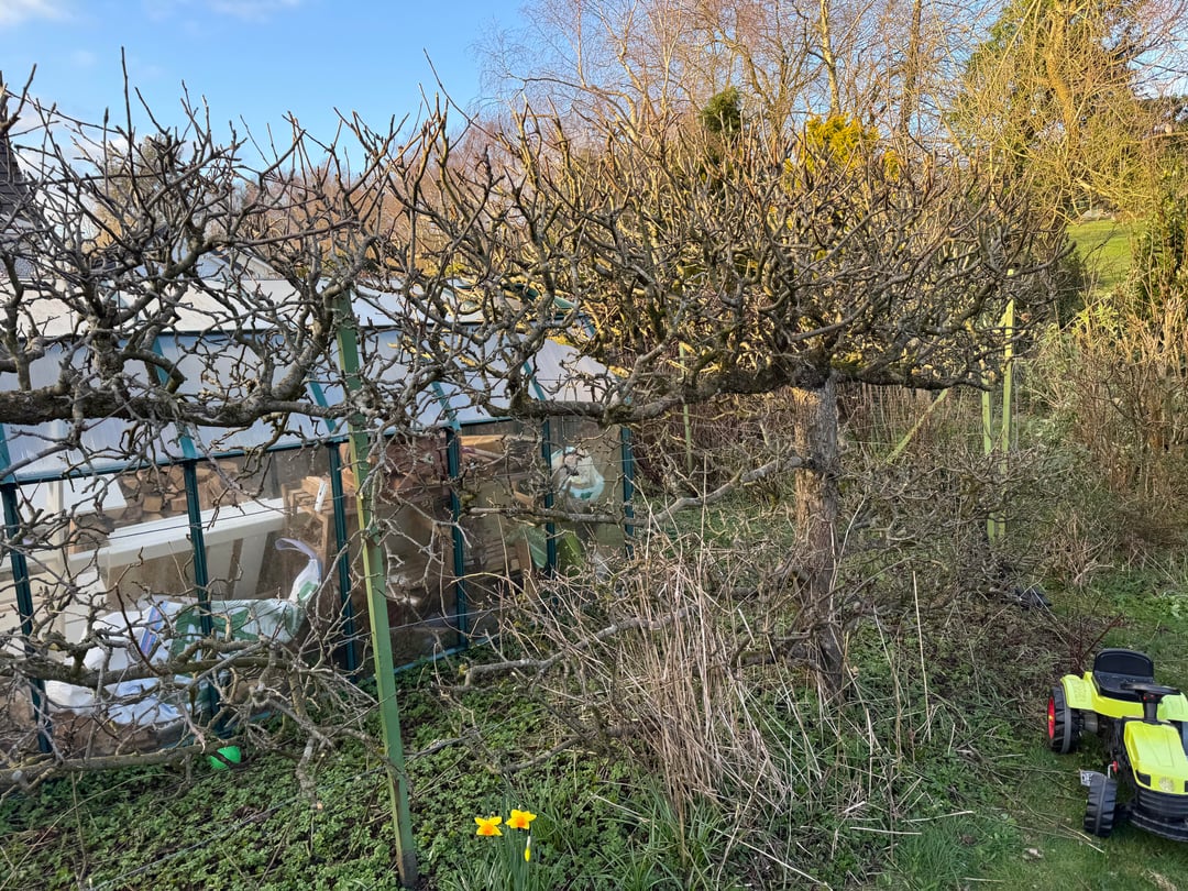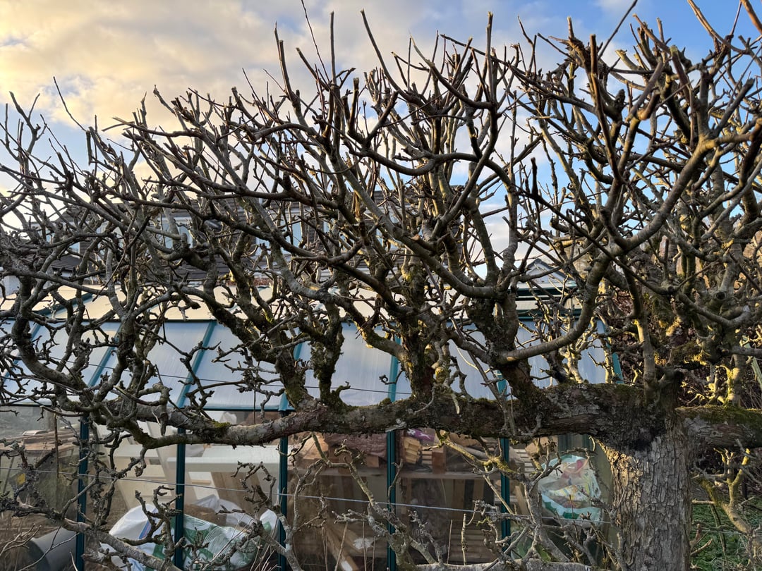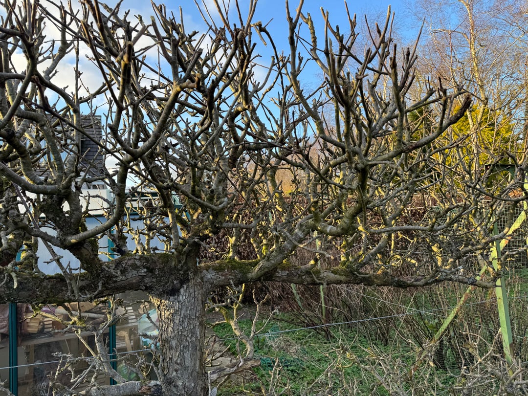 Ich frage mich, wie weit ich den Apfelbaum beschneiden soll. Die Zweige scheinen eng zusammenzustehen und sich zu bündeln. Wie soll ich das beschneiden? Es stammt aus dem Jahr 1975, also möchte ich mein Bestes tun, um es am Leben zu erhalten.