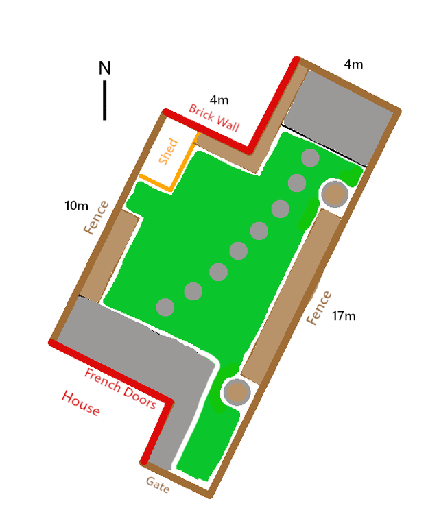Das Einzige, worüber ich mir sicher bin, ist, dass ich ein paar Acer-Pflanzen in schöne Töpfe pflanzen, etwas Sternjasmin auf die hintere Mauer pflanzen und ein bisschen Kleesamen passend zum Rasen säen möchte. Wir sind im Südosten und das Wichtigste, worüber wir uns Sorgen machen, ist, dass der Garten größtenteils aus Lehmboden besteht und nach Nordosten ausgerichtet ist.
