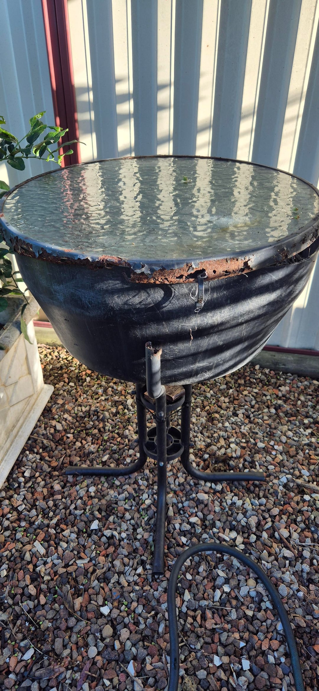 Ich hatte einen alten Gartentisch aus Glas, der völlig verrostet und unbrauchbar war. Auch ein altes Fass, das ich als Wasserspeicher benutzte. Ich schnitt das Fass ab und stellte es auf den Tisch, wobei ich die Glasplatte als Gewächshausabdeckung nutzte, um die Luftfeuchtigkeit aufrechtzuerhalten. Ich hoffe, dass die erhöhte Position die Schnecken fernhält!