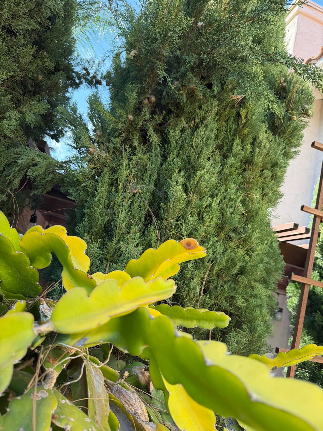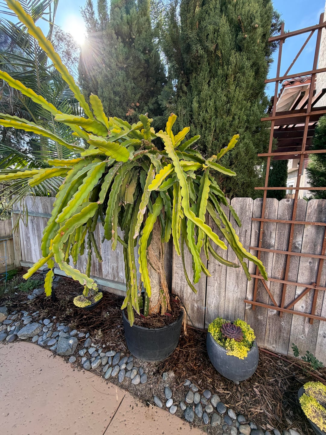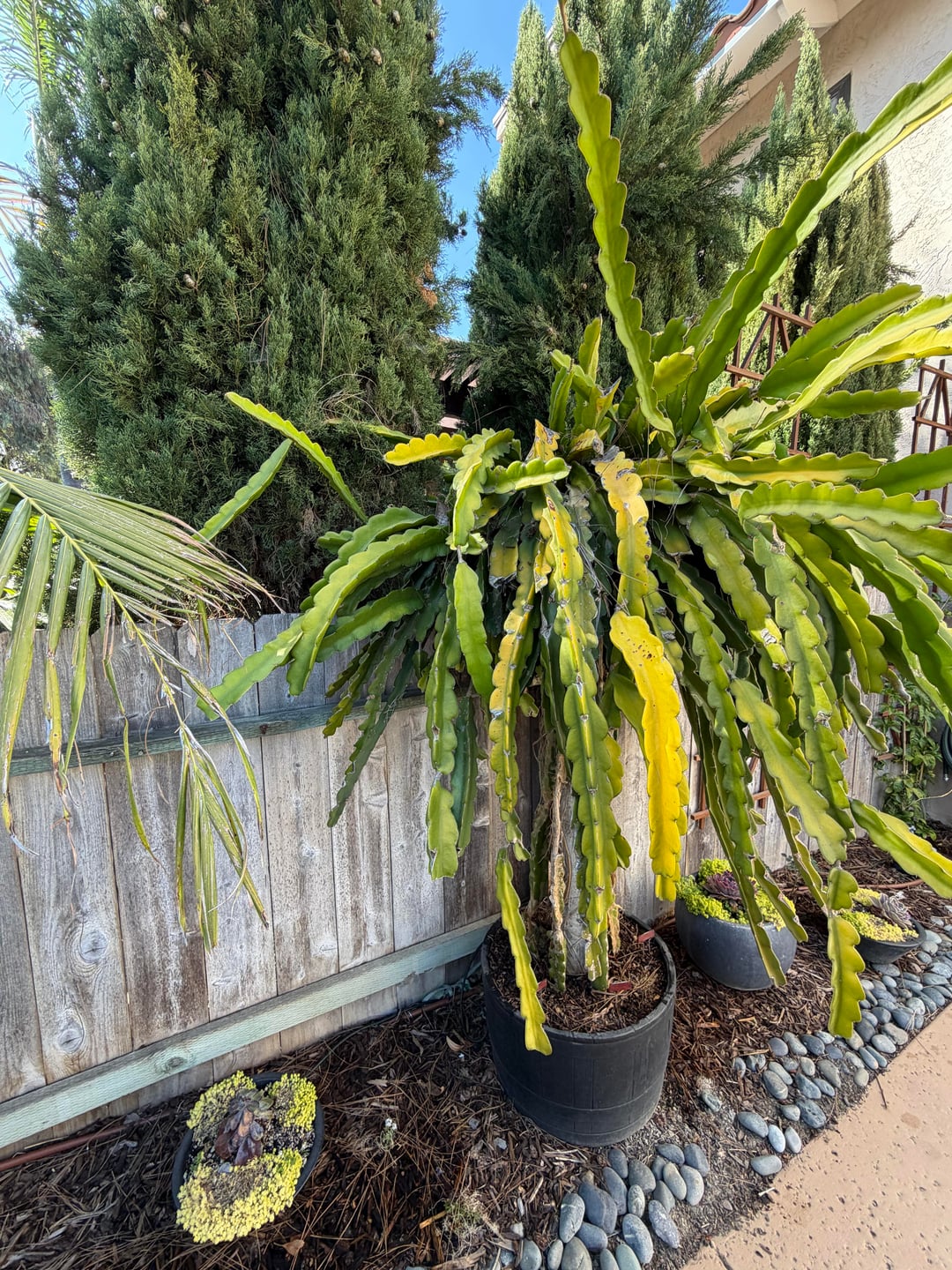 Wir haben vor kurzem ein Haus gekauft, in dem diese schöne Drachenfruchtpflanze stand, aber wir haben keine Ahnung, wie wir sie pflegen sollen. Kürzlich sind uns ein paar Schwachstellen aufgefallen (siehe Bilder) und wir haben versucht, sie abzuschneiden, aber es scheint, als ob sie immer wieder zurückkommen. Wir haben auch versucht, nach dem Schneiden Zimt hinzuzufügen, aber auch das hat nicht so gut funktioniert. Außerdem ist es, seit wir es besitzen, etwas vergilbt. Im südkalifornischen Klima gießen wir ca. 1x pro Woche tief. Irgendwelche Vorschläge?