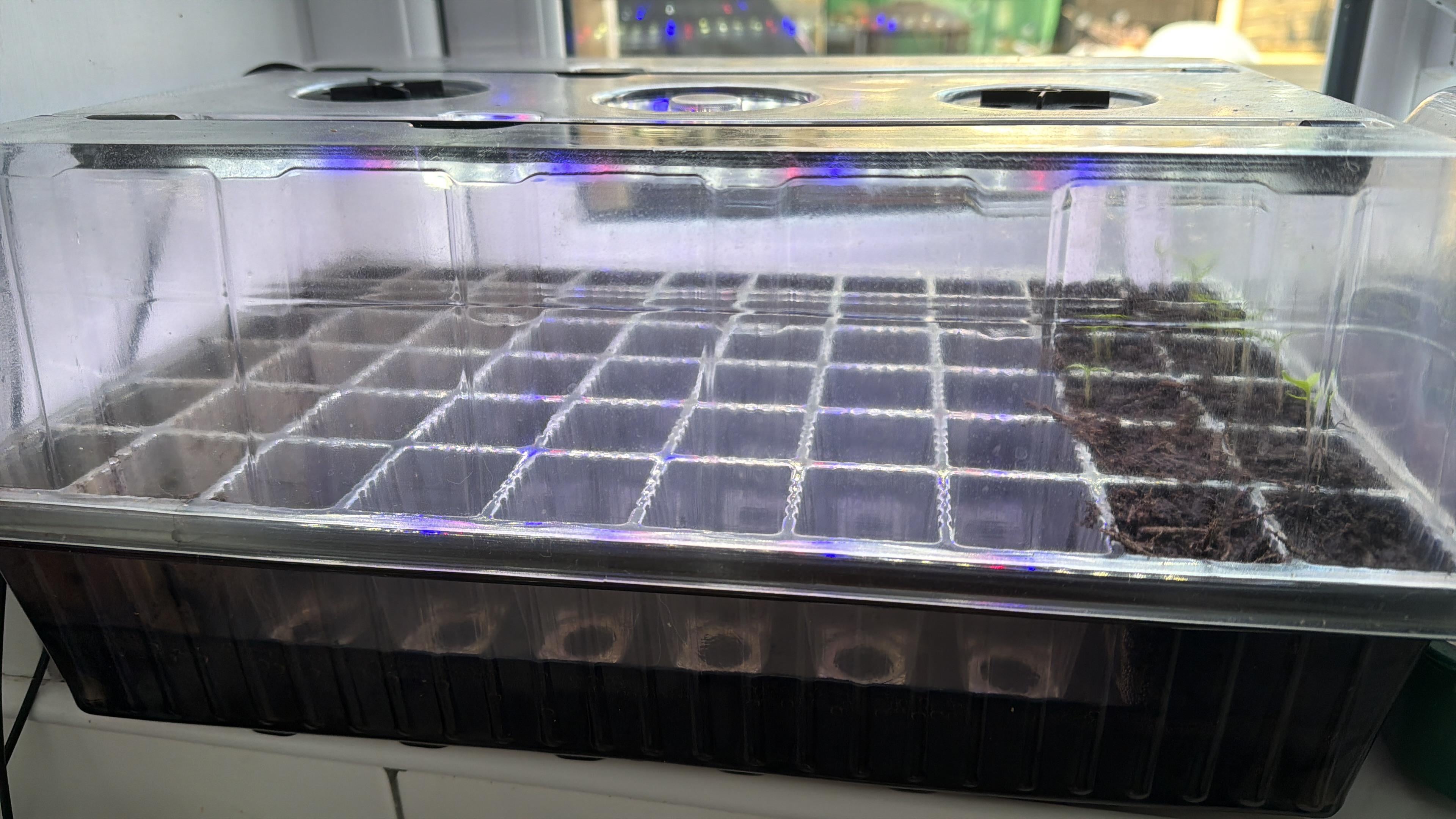 Ich habe meine Tomaten heute in ihre eigenen größeren Töpfe gepflanzt, mit 53 leeren Zellen im Propagator und Lichtern oben. Ich habe zwei Arten von Chilis, die gerade wachsen.
