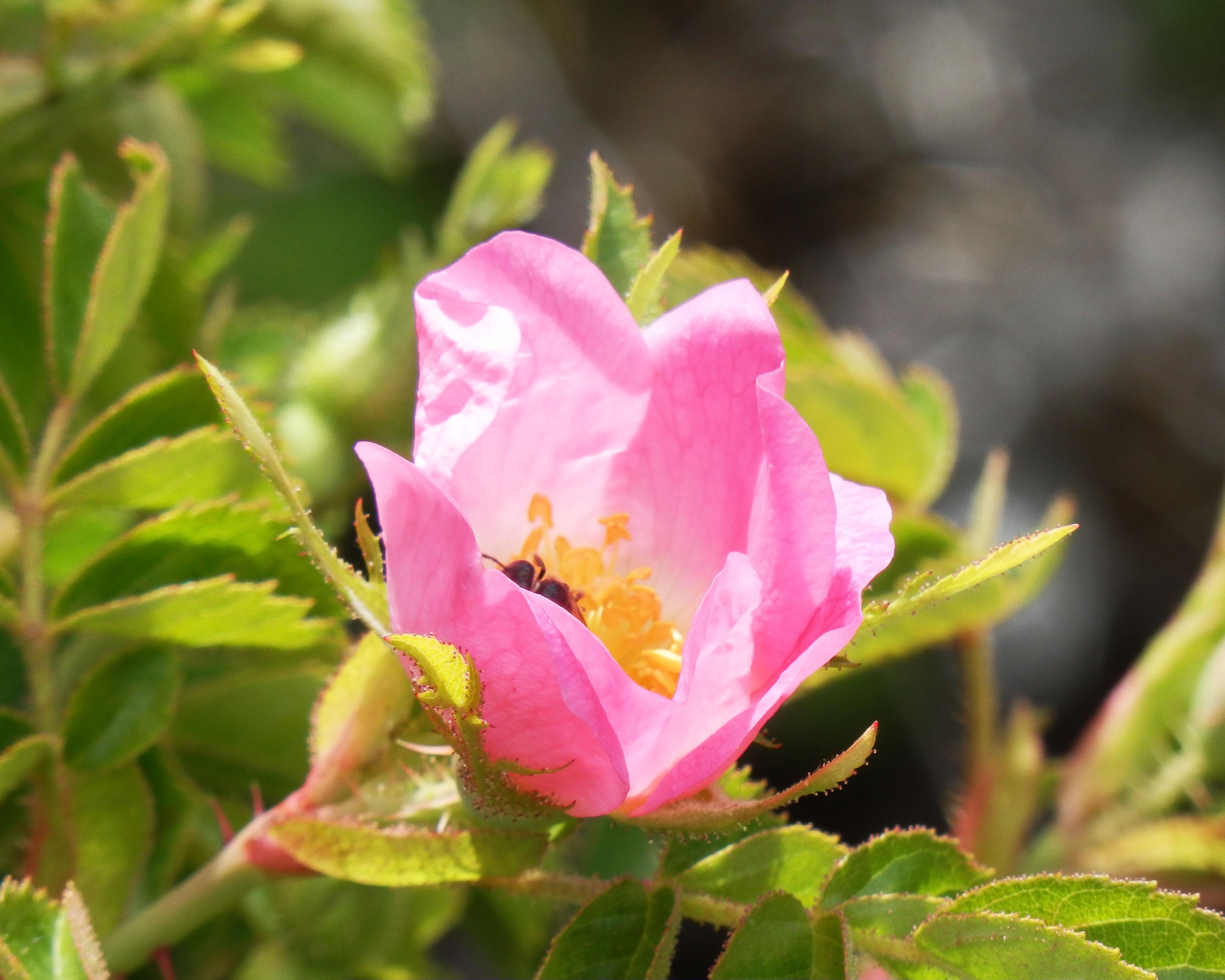 Ich habe dieses Foto heute in meinem Garten aufgenommen und es zeigt eine wunderschöne rosa Wildrose. Tief im Inneren verbirgt sich eine kleine Biene und ich bin so froh, dass ich diesen kleinen natürlichen Moment einfangen konnte. 🌸✨
