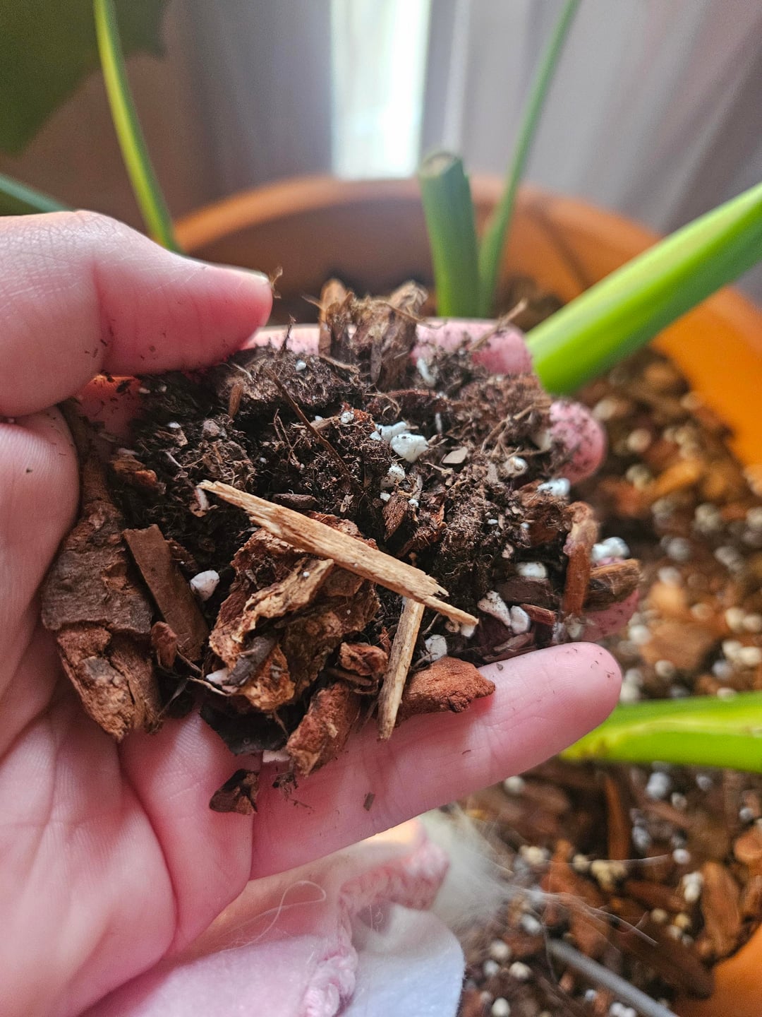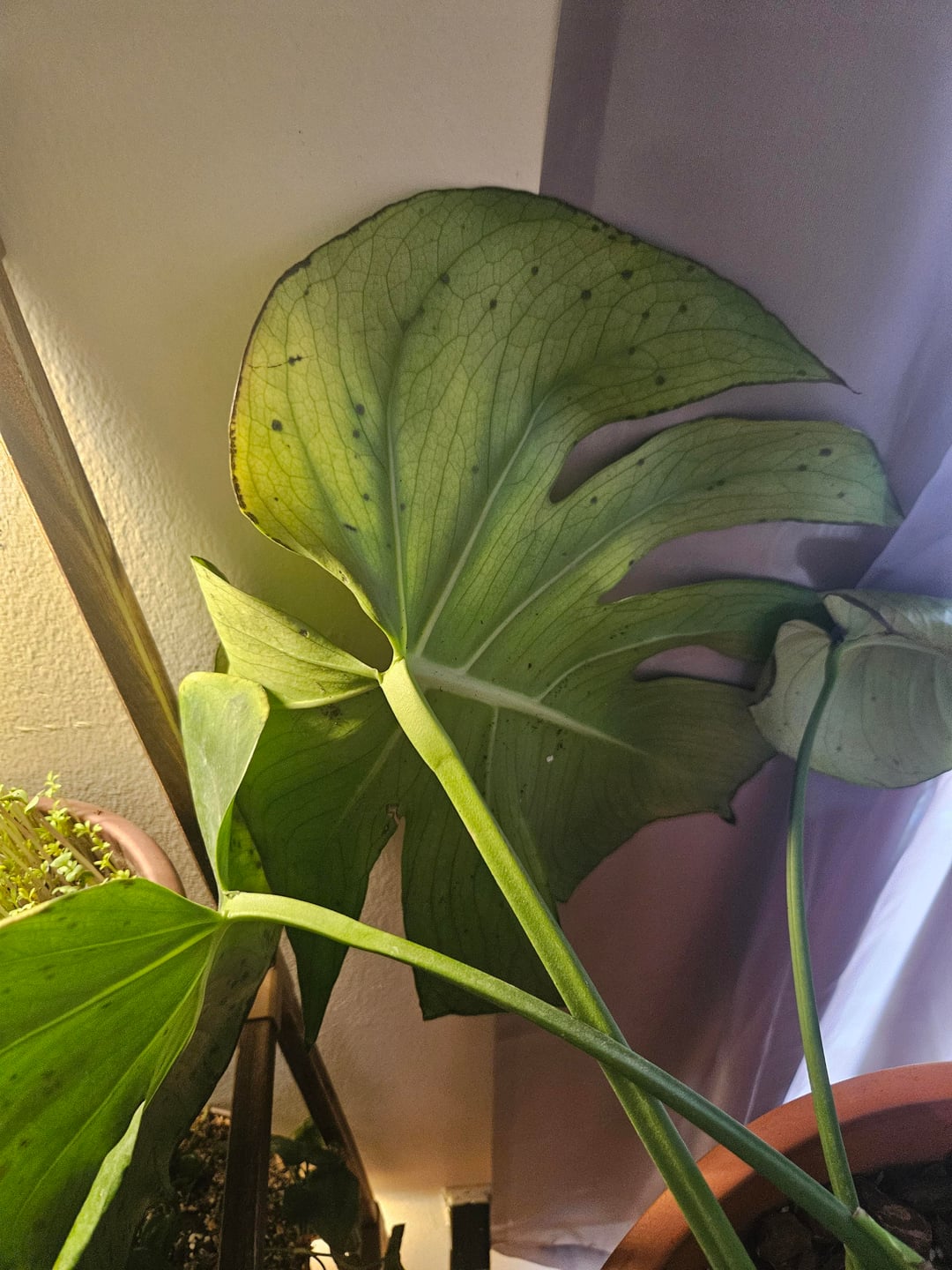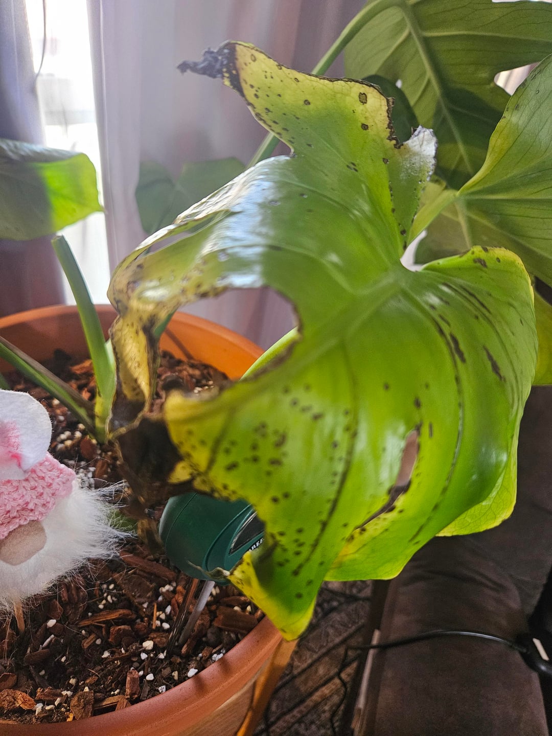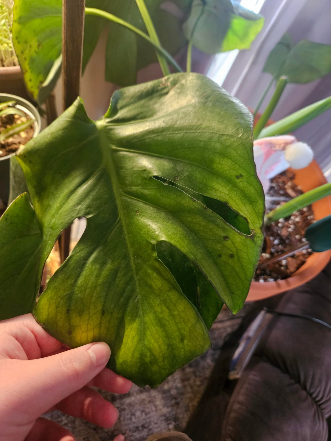 Meine Monstera bekommt braune Flecken und fängt an, gelb zu werden, und ich weiß nicht, warum, sie ist in einer selbstgemachten, klobigen Erdmischung, wird von einem Pflanzenständer daneben beleuchtet, ich bin ziemlich neu in Sachen Pflanzen, ich glaube, seit 1,5 Jahren