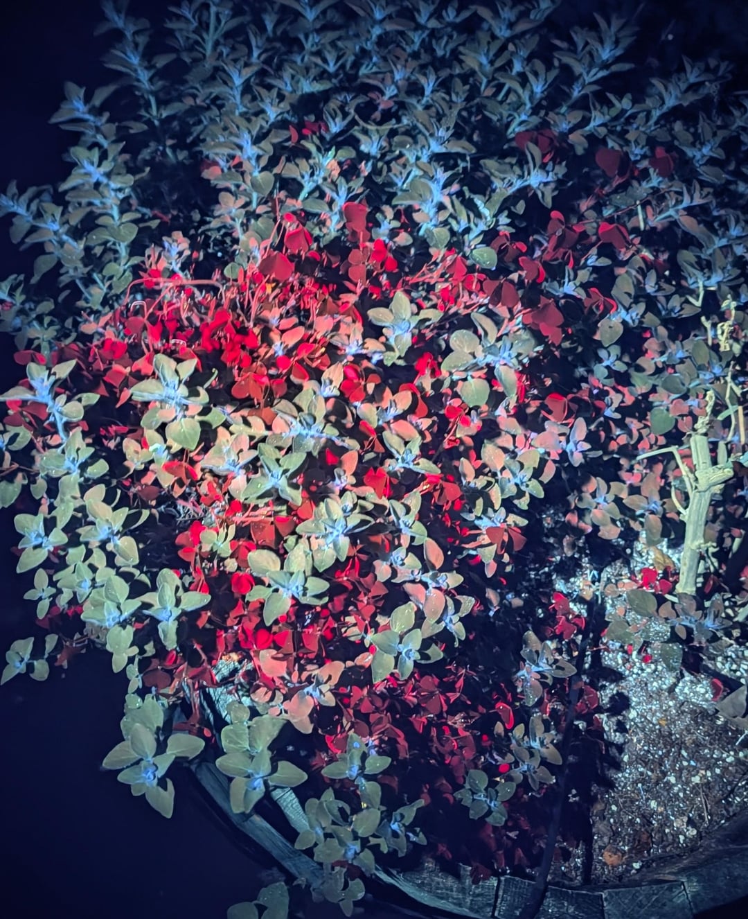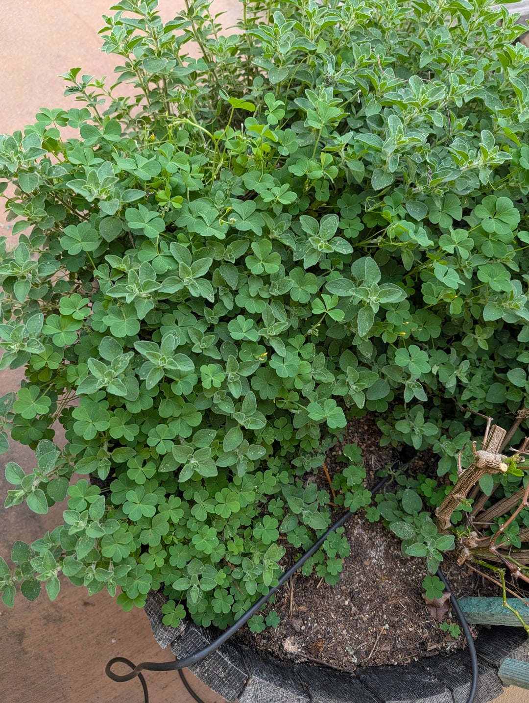 Dieses kleeartige Unkraut übernimmt meinen Oreganopflanzer. Es hat die gleiche Farbe wie der Oregano und macht es schwierig, es herauszuziehen, ohne etwas Oregano mitzureißen.