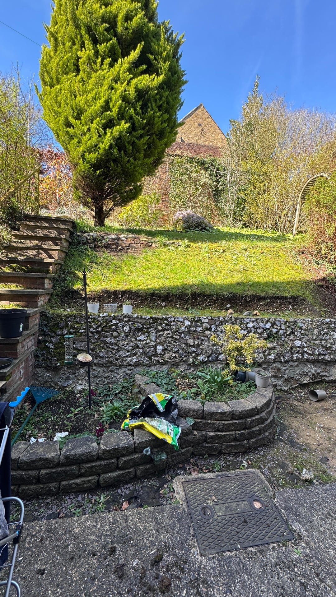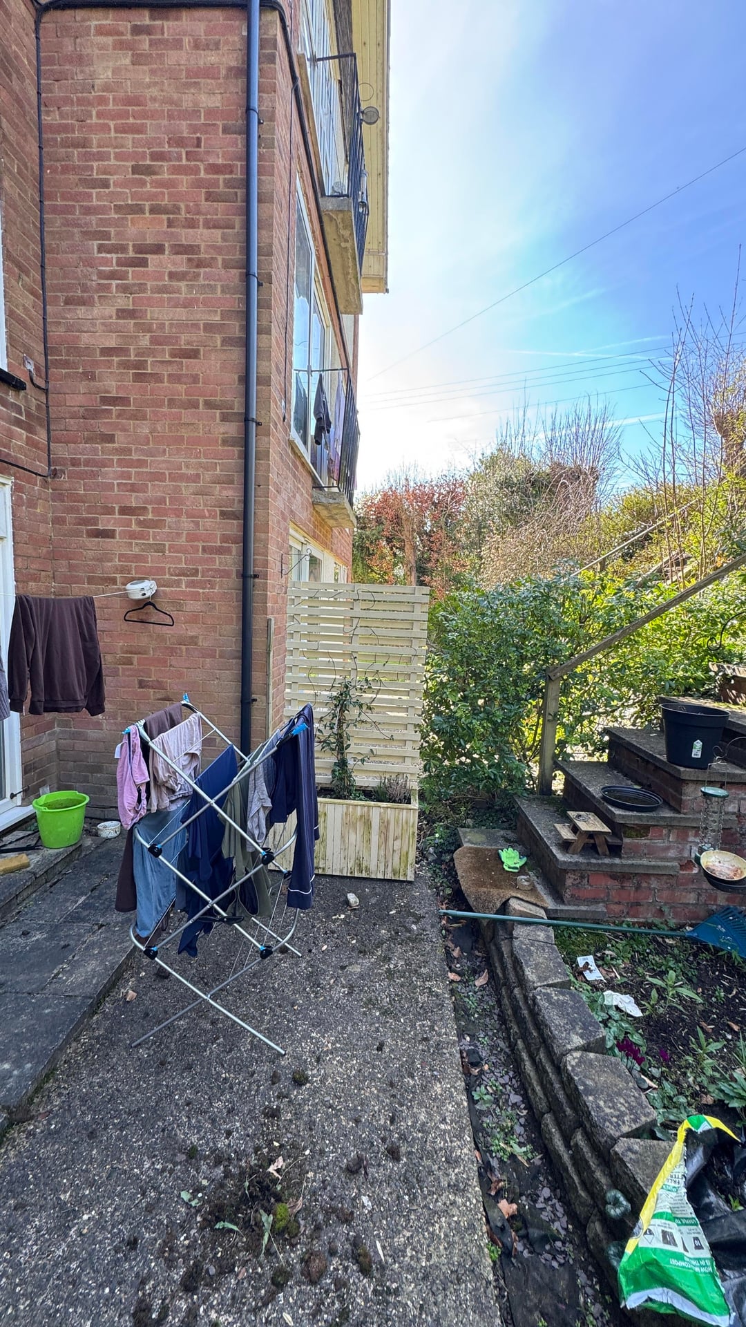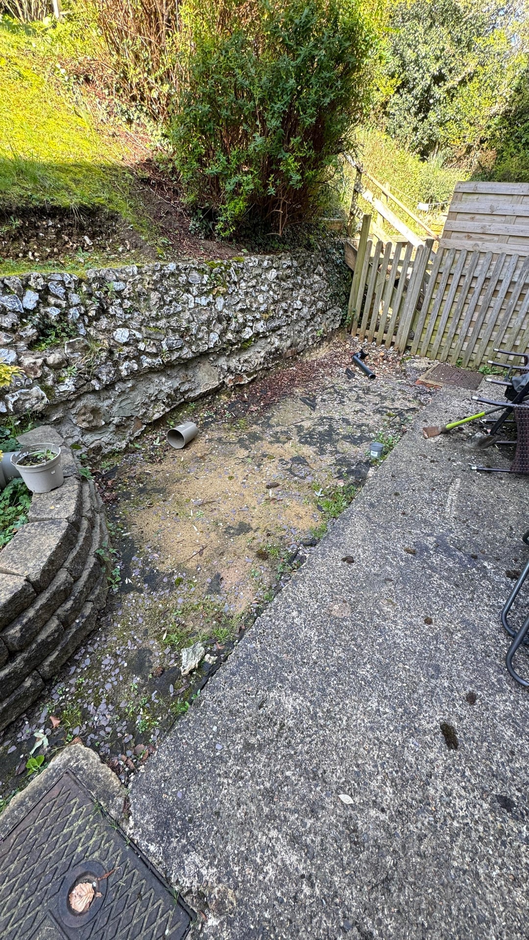 Ich habe eines der gemauerten Blumenbeete, den Kies und die Gehwegplatten entfernt. Das war harte Arbeit, wahrscheinlich 100 Kiessäcke, und ich bin ich. Eine Wohnung, die eine Treppe hinauf liegt.