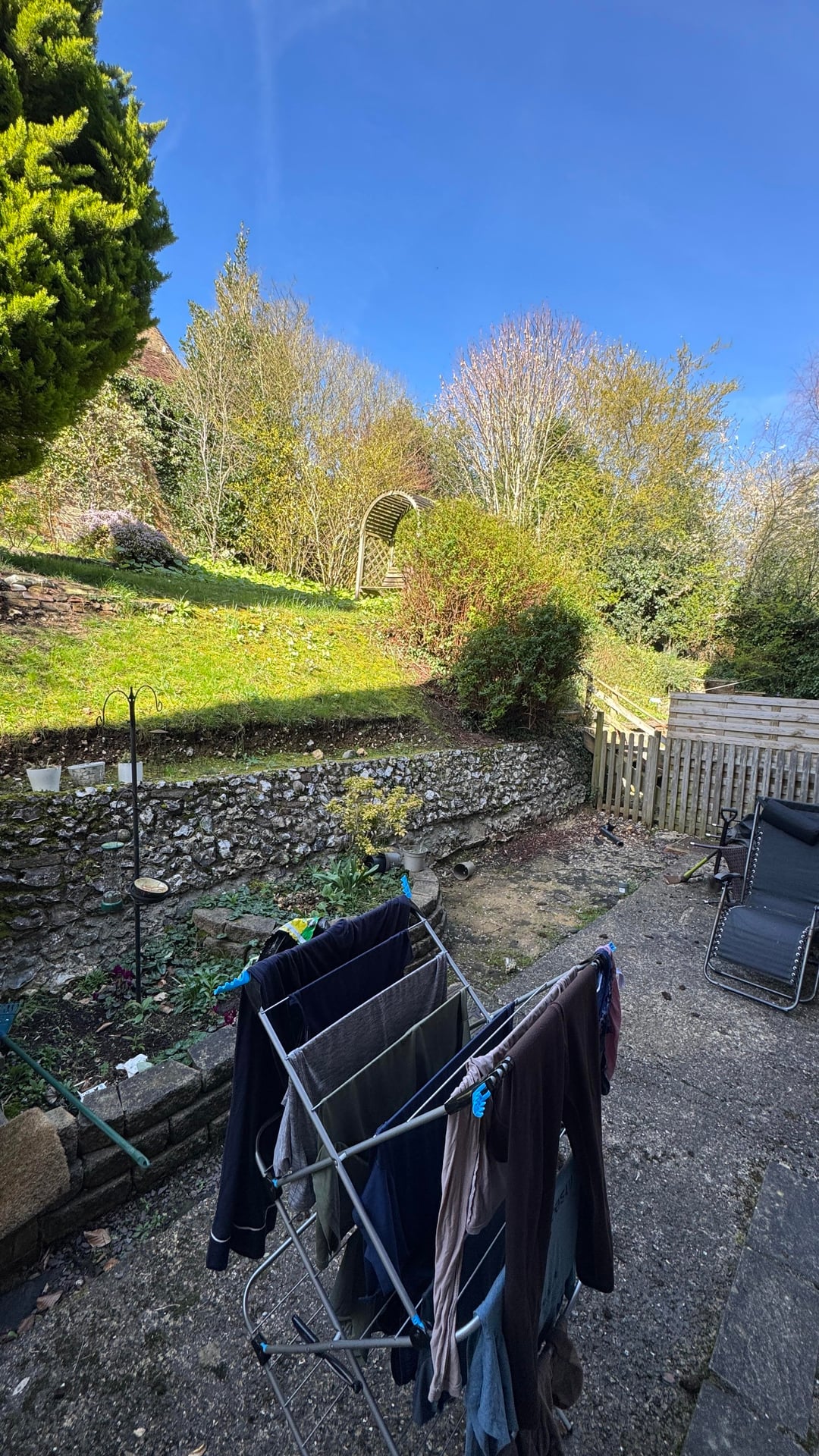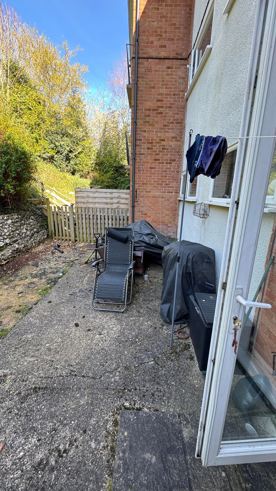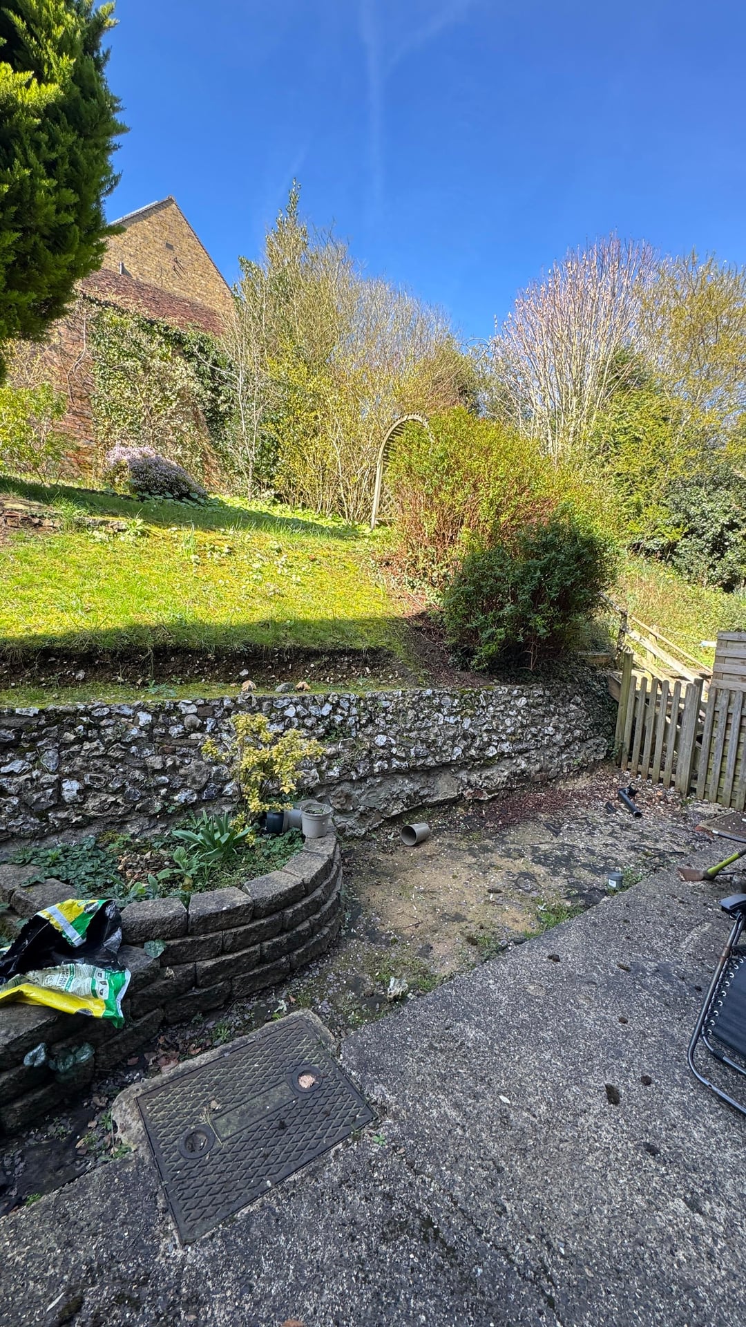 Ich habe eines der gemauerten Blumenbeete, den Kies und die Gehwegplatten entfernt. Das war harte Arbeit, wahrscheinlich 100 Kiessäcke, und ich bin ich. Eine Wohnung, die eine Treppe hinauf liegt.
