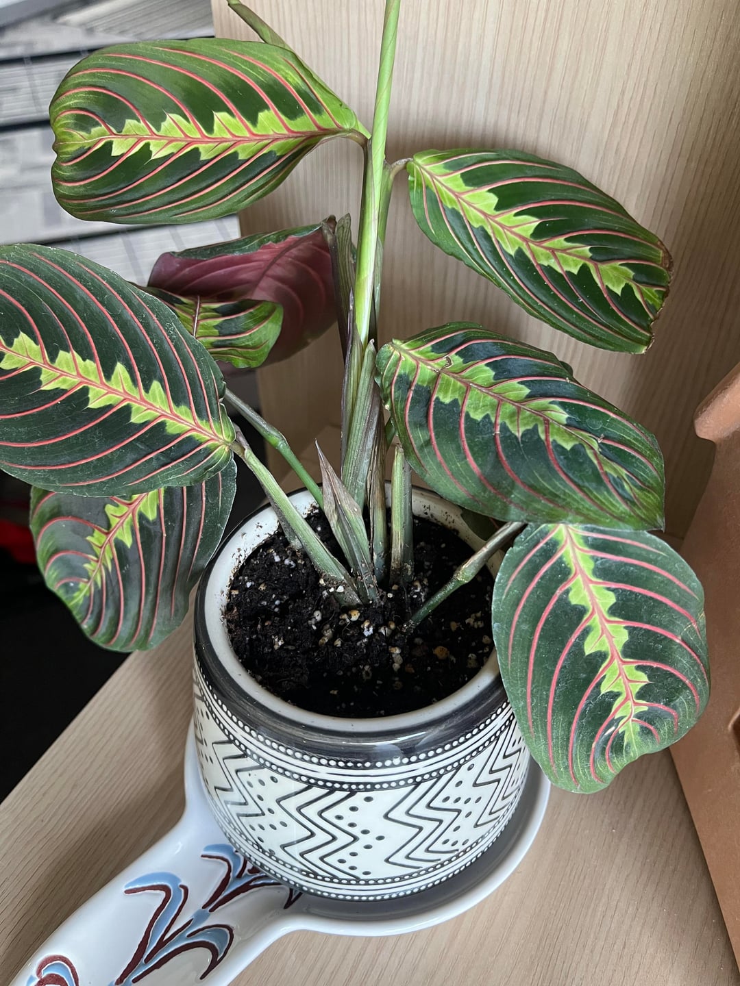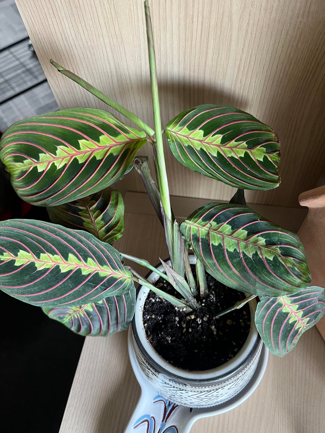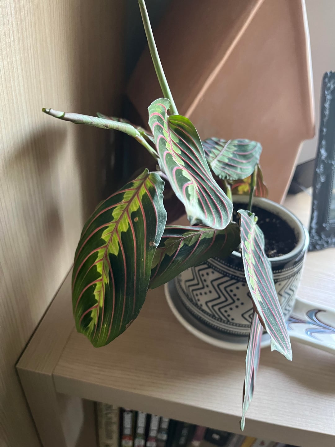 Hallo zusammen! Ich habe diese Gebetspflanze vor etwa drei Wochen in einem Geschäft in meiner Nähe gekauft. Ich bin ein neuer Pflanzenbesitzer und möchte wirklich, dass es gedeiht. Ich habe 1x pro Woche alle 2 Wochen gegossen. Ich sehe zwei weitere Blätter sprießen, also hoffe ich, dass ich etwas richtig mache. Ich überlege, ein Regal in meinem Badezimmer aufzustellen, da sie Feuchtigkeit mögen.