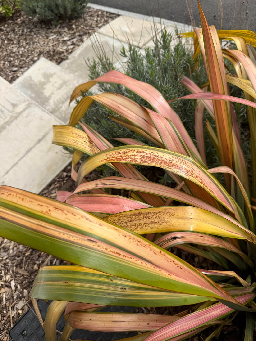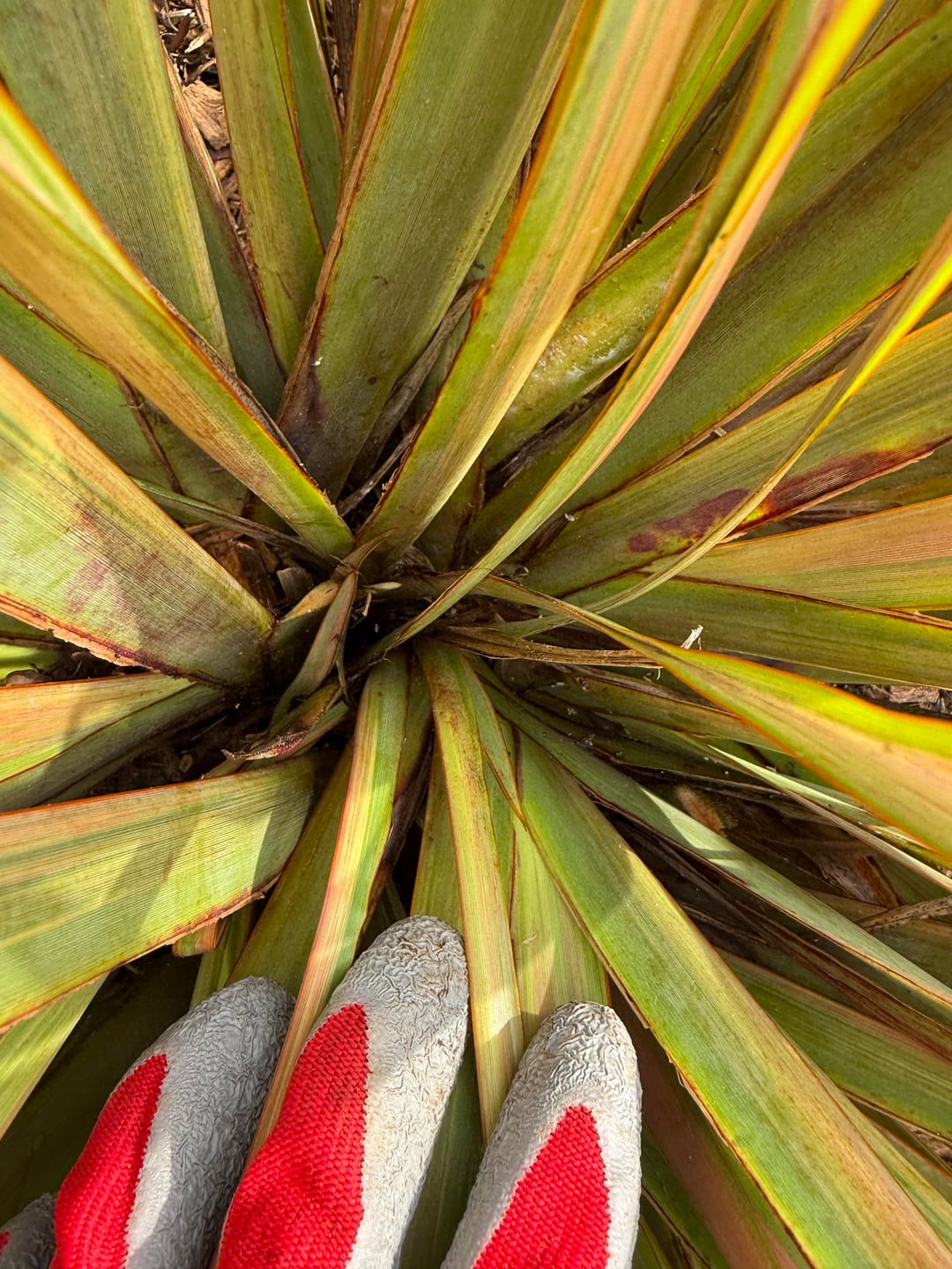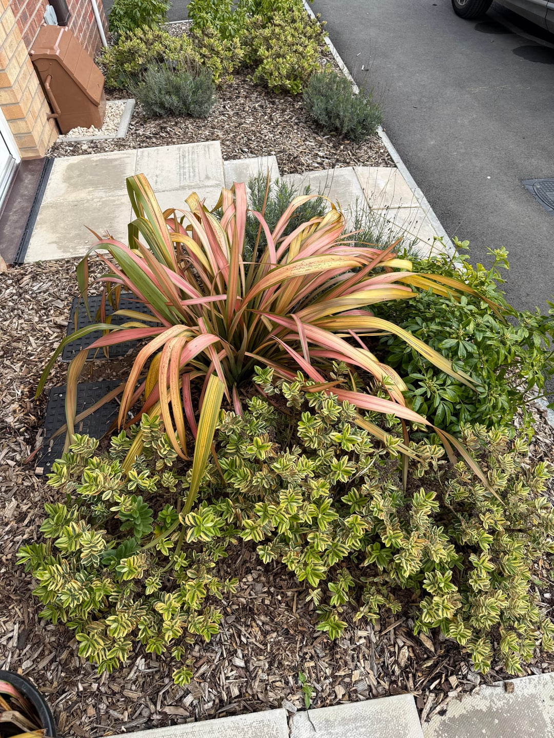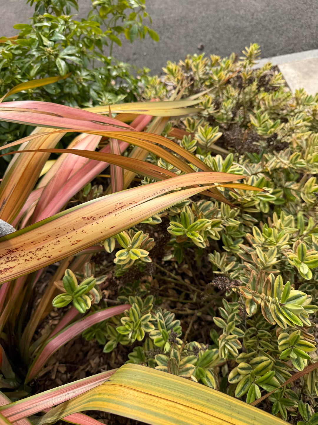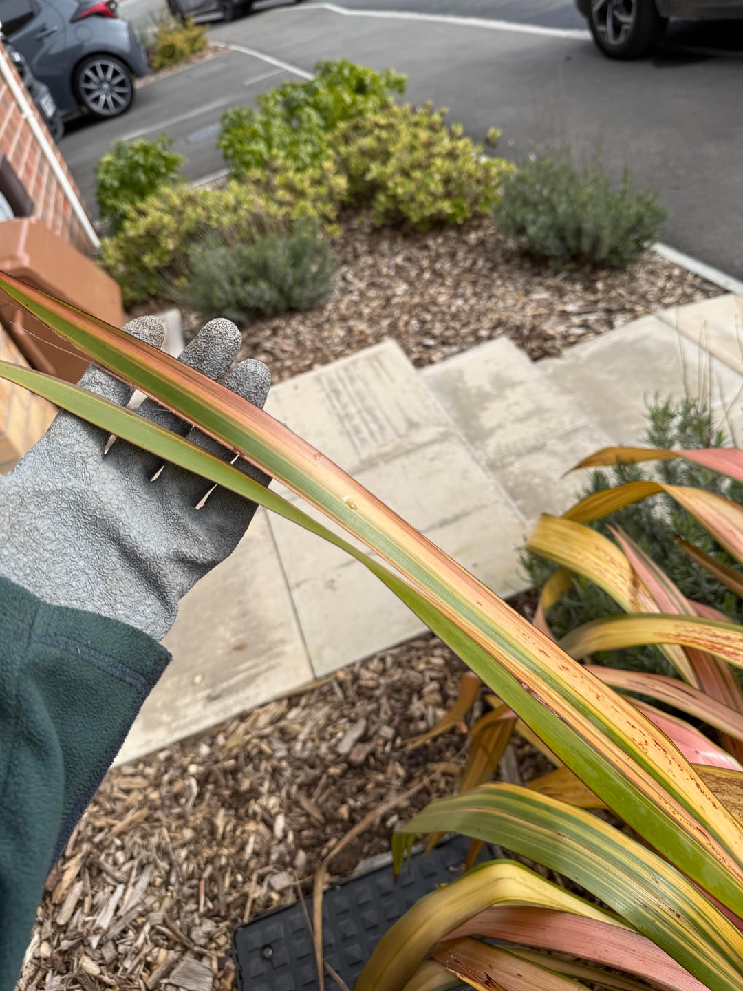 Das ist mein neuseeländischer Flachs vor meinem neu gebauten Haus. Es liegt jetzt etwa ein Jahr im Boden. Es gedeiht jedoch definitiv nicht. Es gibt braune Flecken auf den Blättern, die Blätter platzen an den Enden und es sieht allgemein schlaff aus.
