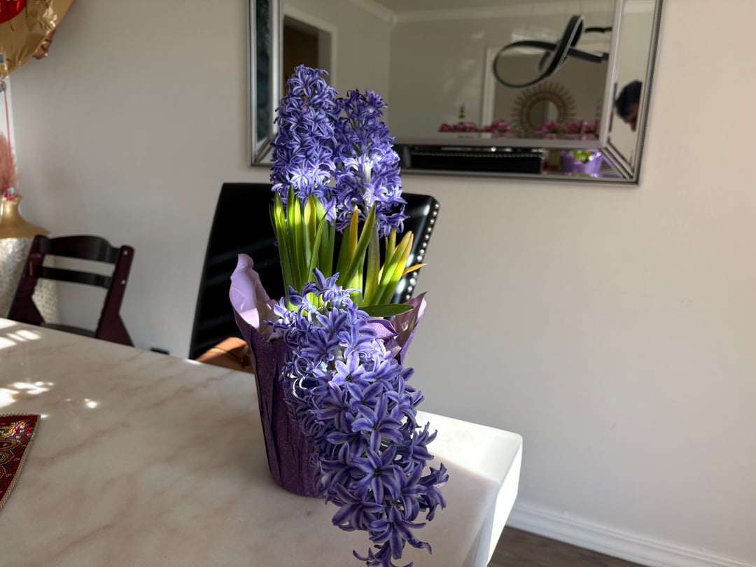 Hallo, wir haben diese lila Hyazinthe vor etwa einer Woche im Rahmen der persischen Nowruz-Ausstellung bekommen. Es war bis gestern glücklich und als ich heute aufwachte, war einer der Stängel völlig heruntergeknickt. Ich habe es neben einem Fenster, das viel Licht bekommt und der Boden fühlt sich noch feucht an. Kann mir bitte jemand einen Einblick geben, was ich tun sollte, um ihr zu helfen?