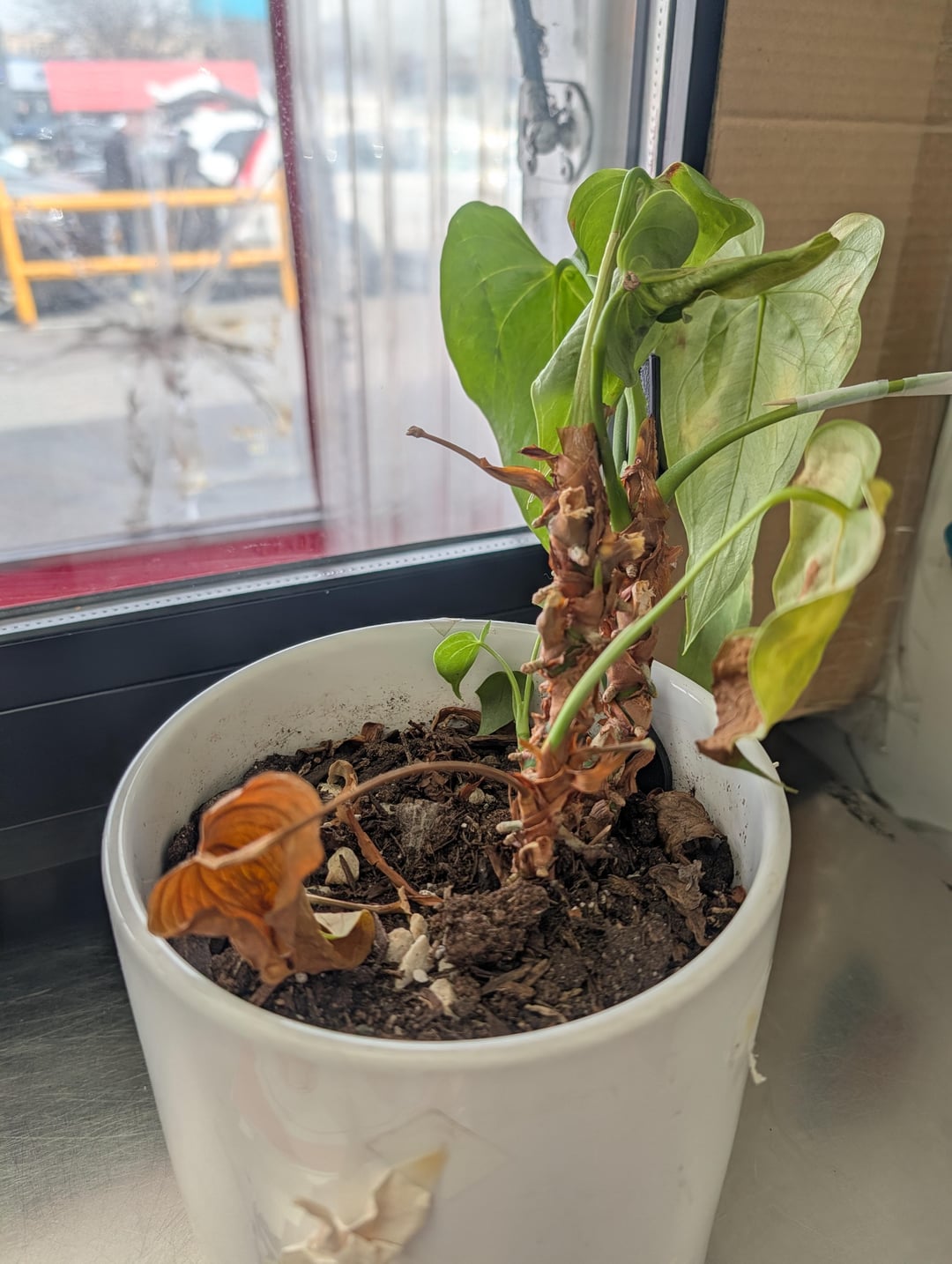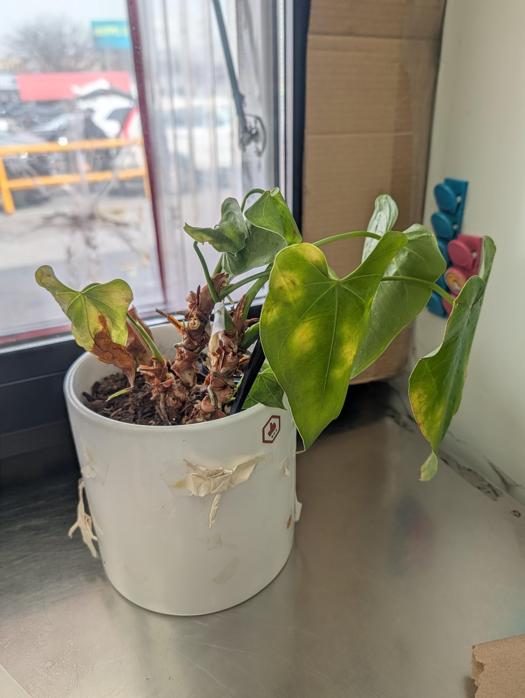 Wir haben diese Anthurie jetzt schon seit ein paar Jahren bei mir am Arbeitsplatz und sie hat sich sehr gut entwickelt … aber im vergangenen Winter war es ihr nicht zu heiß. Ich möchte sie bald zur Rehabilitation mit nach Hause nehmen (ich bin mir sicher, dass ein Austausch von Erde und Topf angebracht ist), aber ich dachte, ich frage sie, ob ich sonst noch etwas tun sollte, weil sie soooo verkrustet aussieht. Die einzigen Pflanzen, mit denen ich Erfahrung habe, sind Pothos und Sukkulenten.