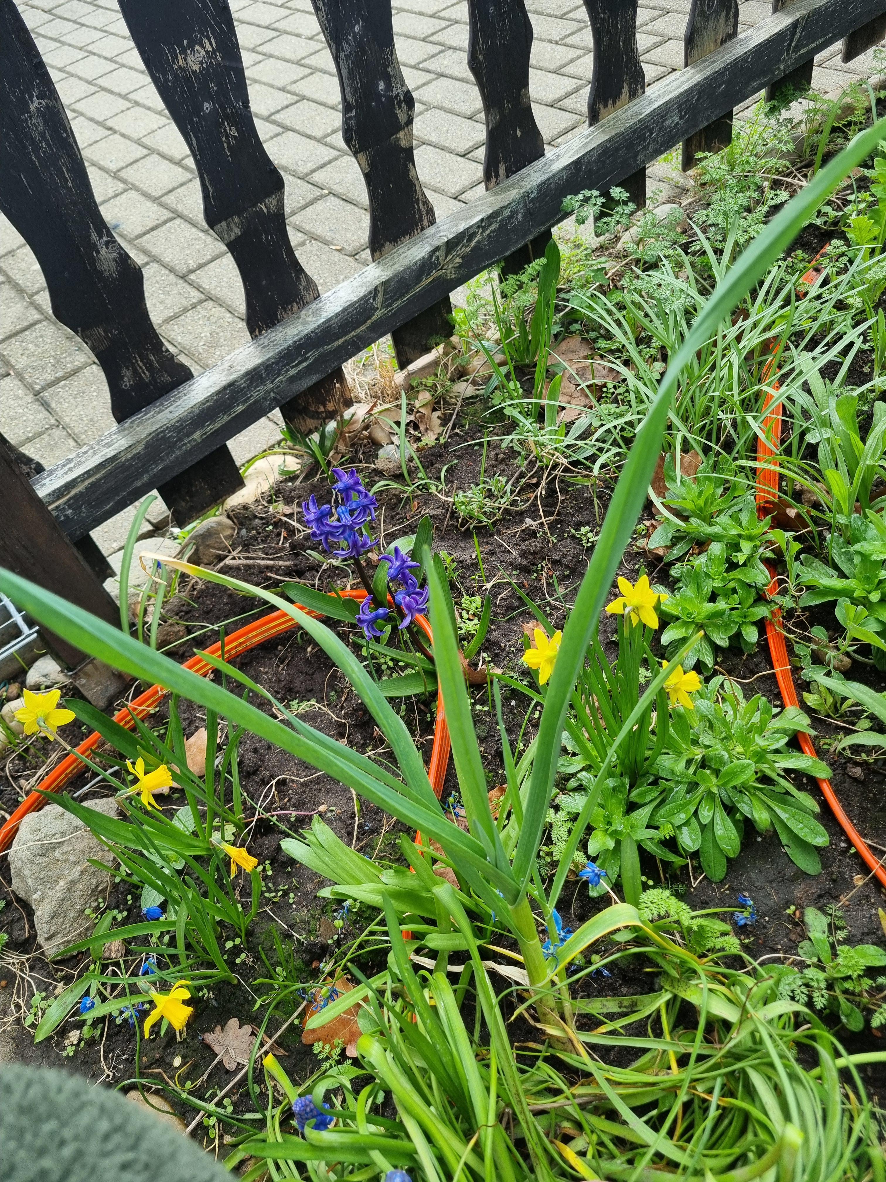 Zwischen den ganzen Frühblühern wächst diese längliche Pflanze mit den langen, schmalen Blättern. Sie ist ungefähr 40cm mittlerweile hoch und hat am Ansatz einen Durchmesser von ~2cm.