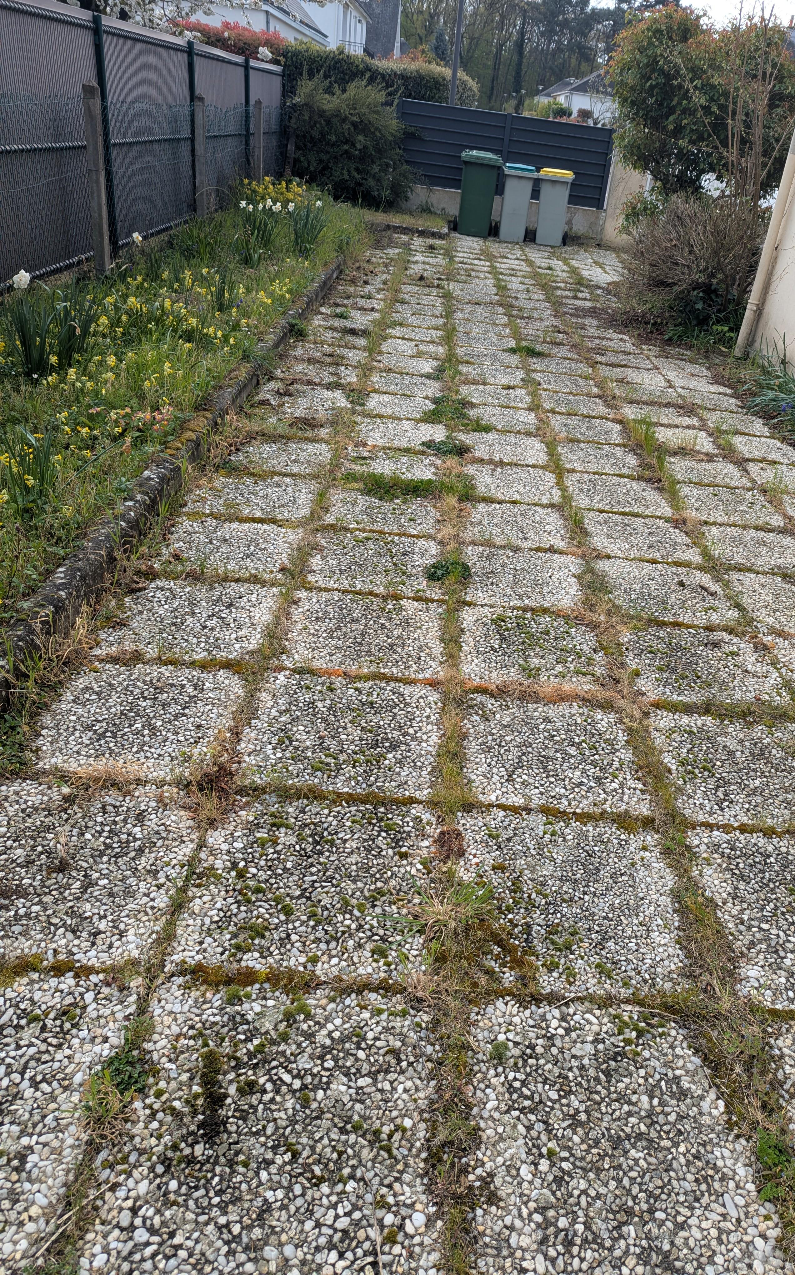 Ich möchte die Vegetation zwischen diesen Lücken in der Platte behalten (ich finde es rustikal), aber auf einem kontrollierbaren Niveau und ohne die Vermehrung bestimmter Unkräuter (ich akzeptiere alles, was den Bodenbelag nicht zerstört).