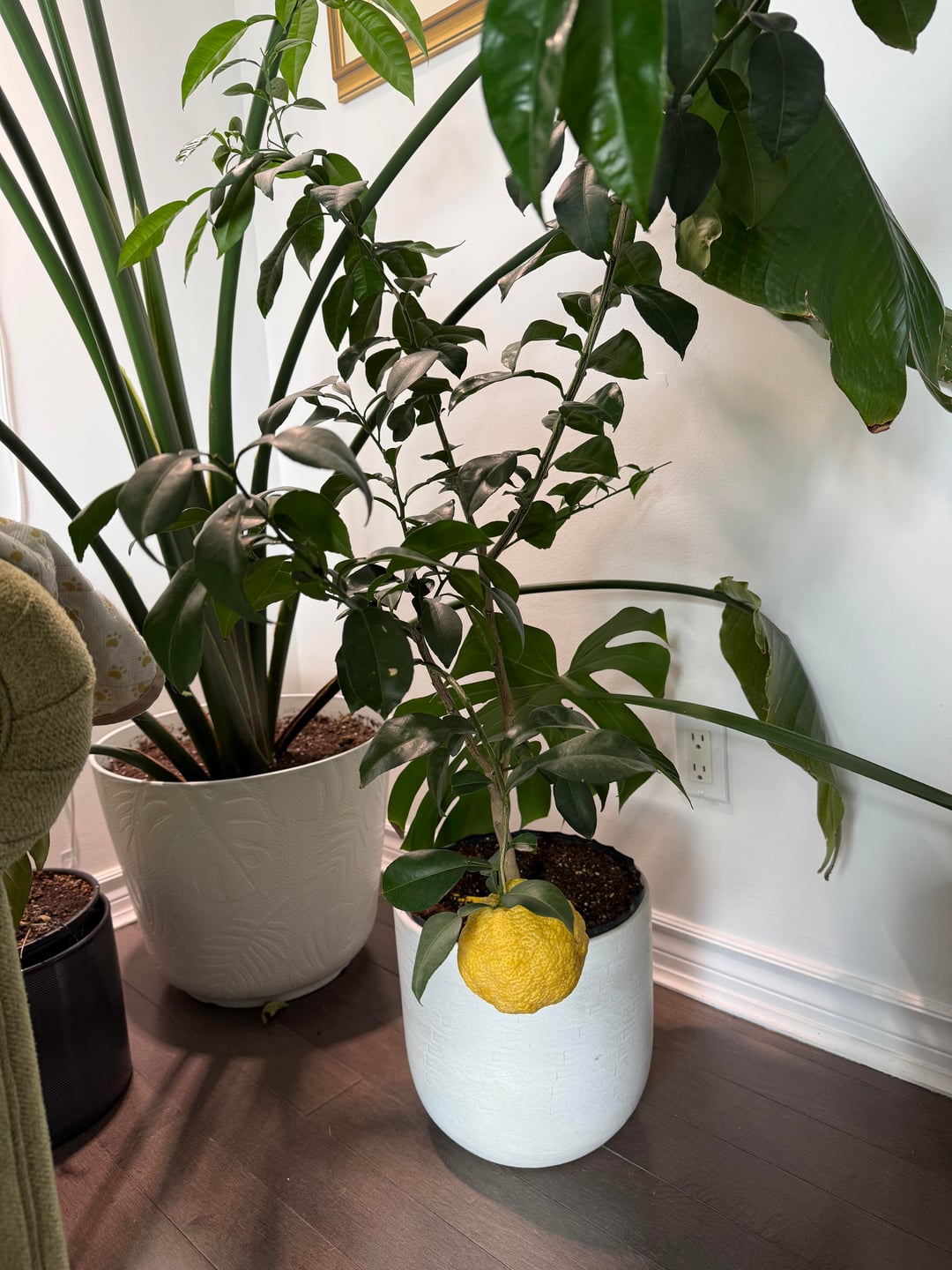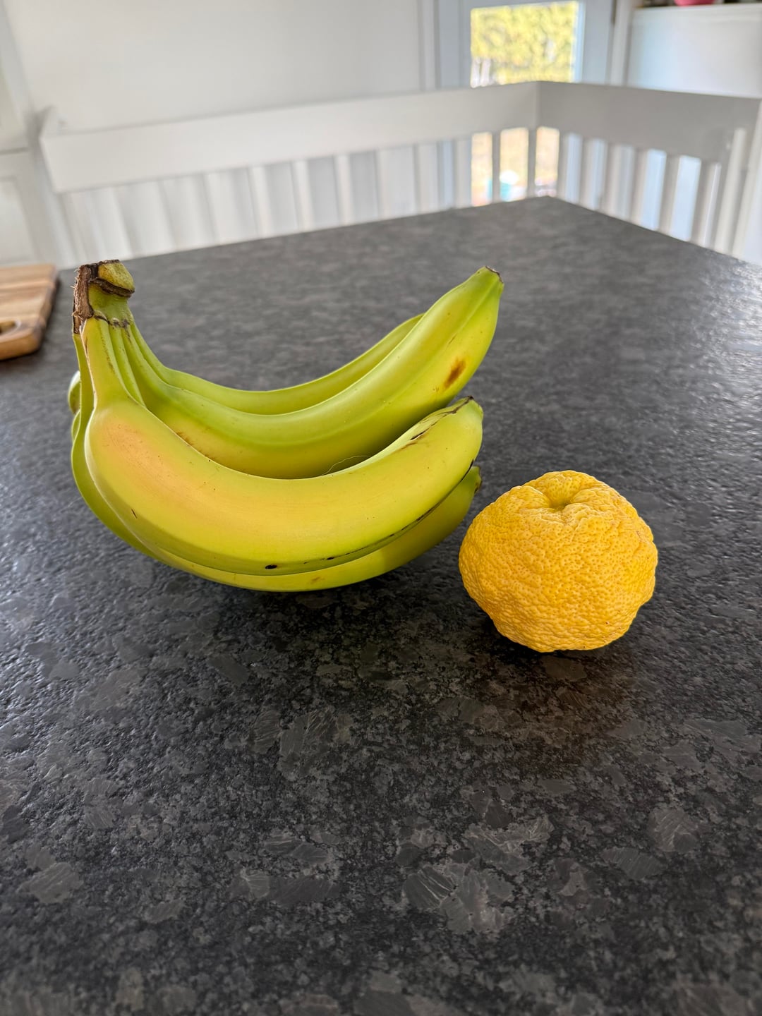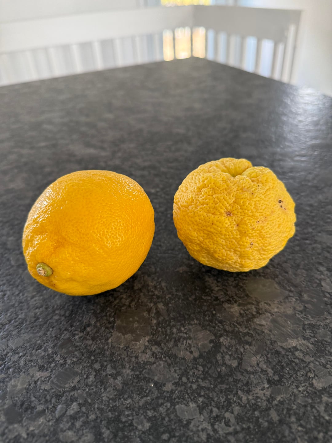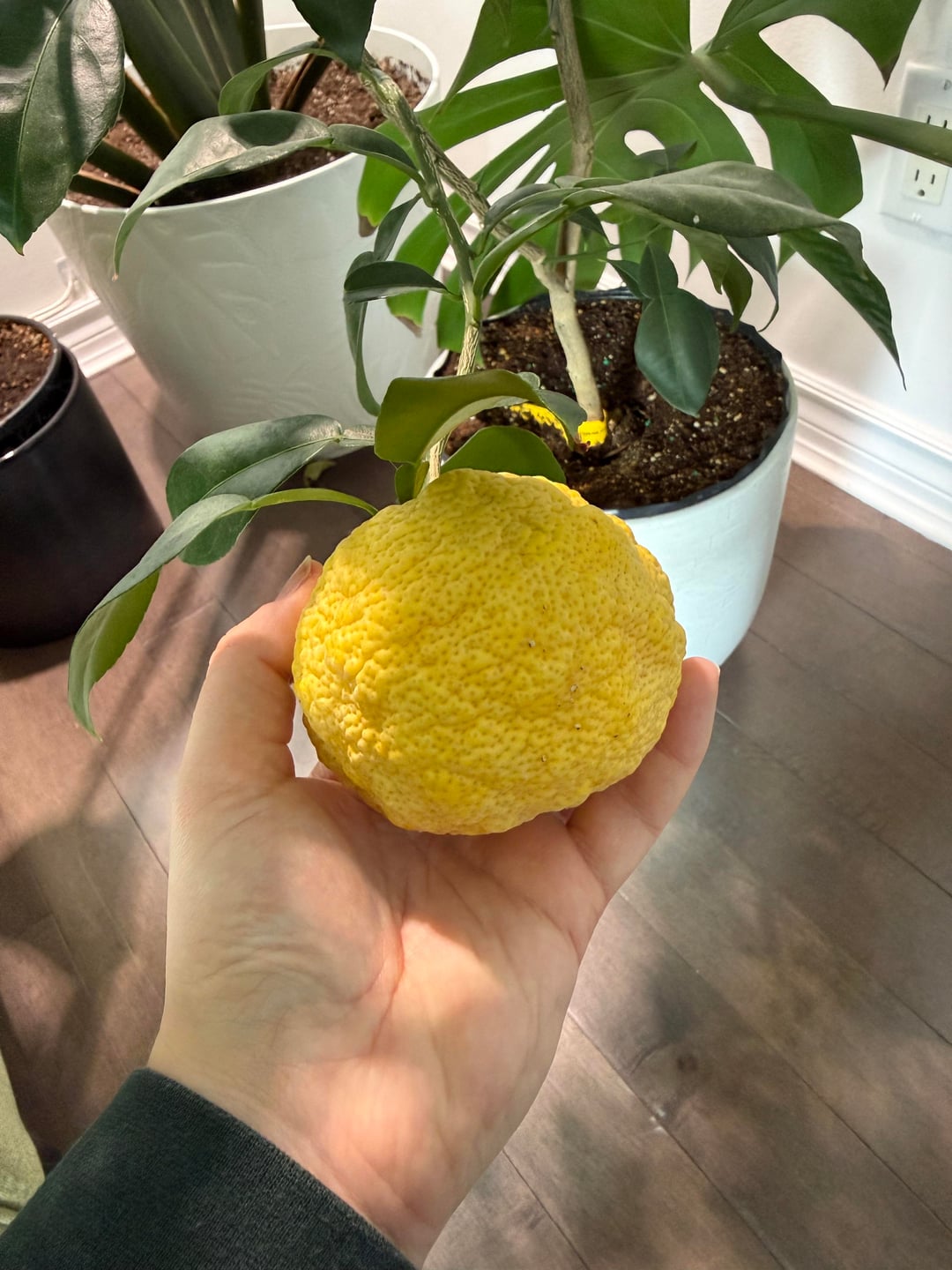 Ich wollte nur die erste Zitrone meines Yuzu-Baums zeigen! Ich habe sie letzten Sommer bekommen, hatte aber nicht damit gerechnet, so bald Früchte zu bekommen. Es duftet super und die Säure ist sehr mild! Banane und Zitrone als Maßstab.