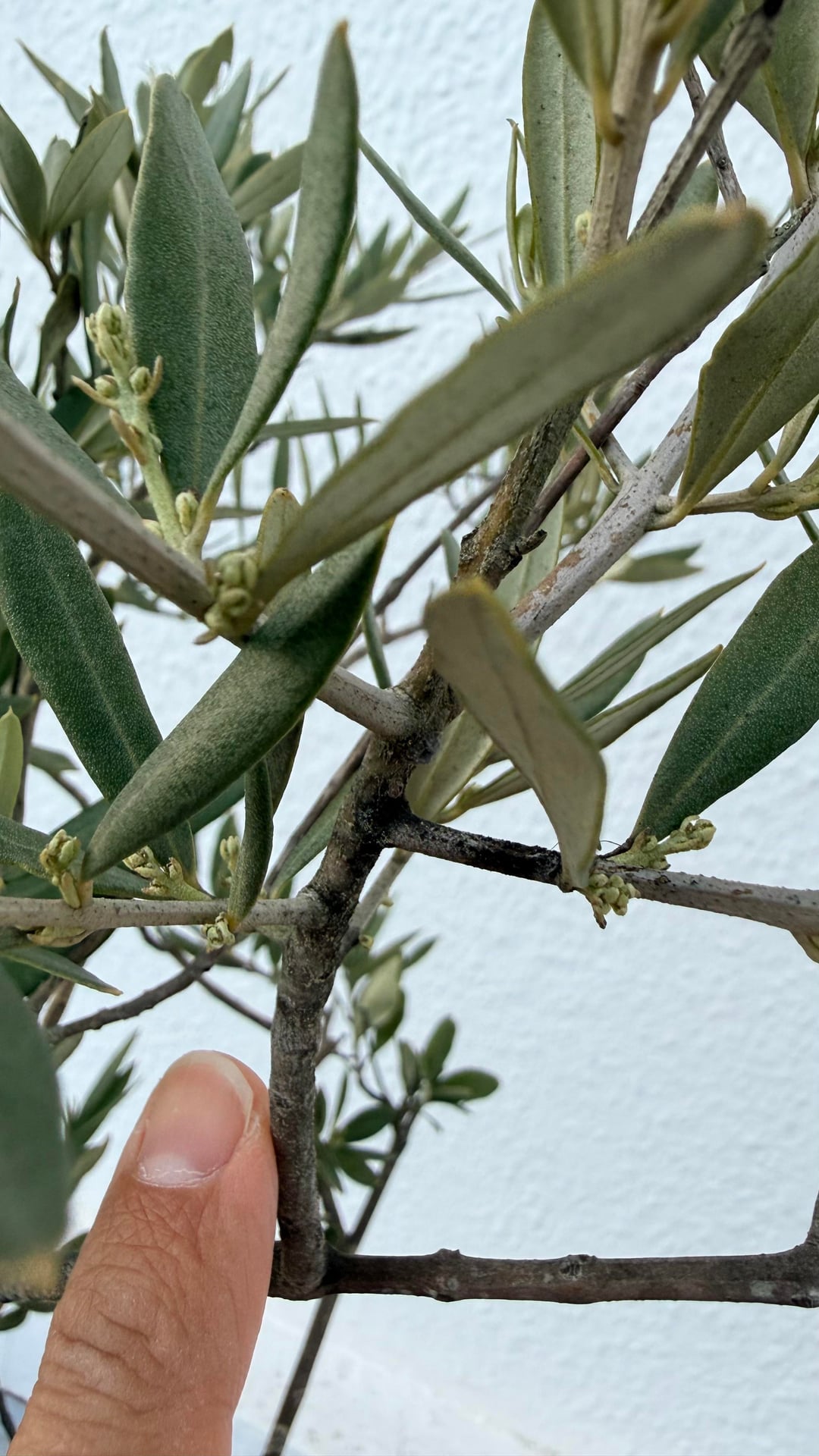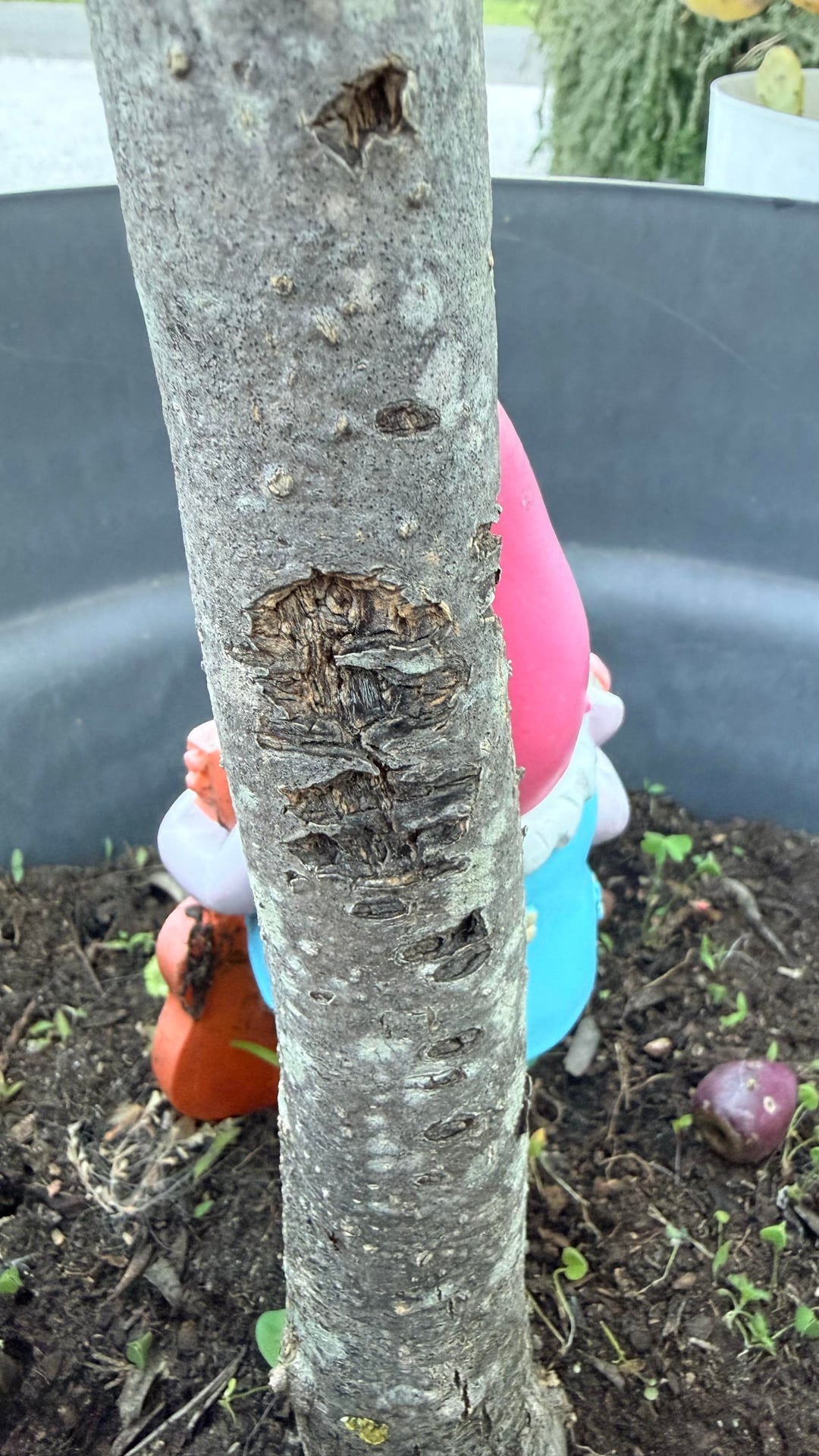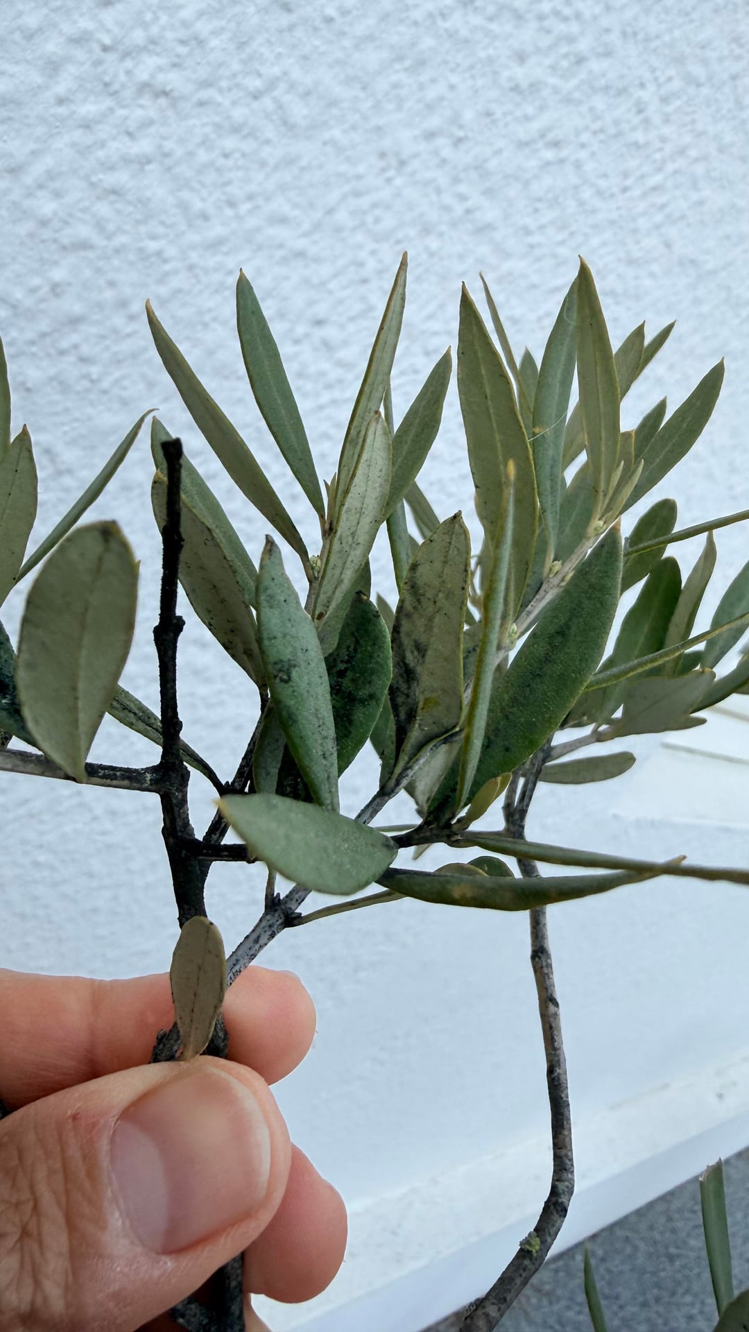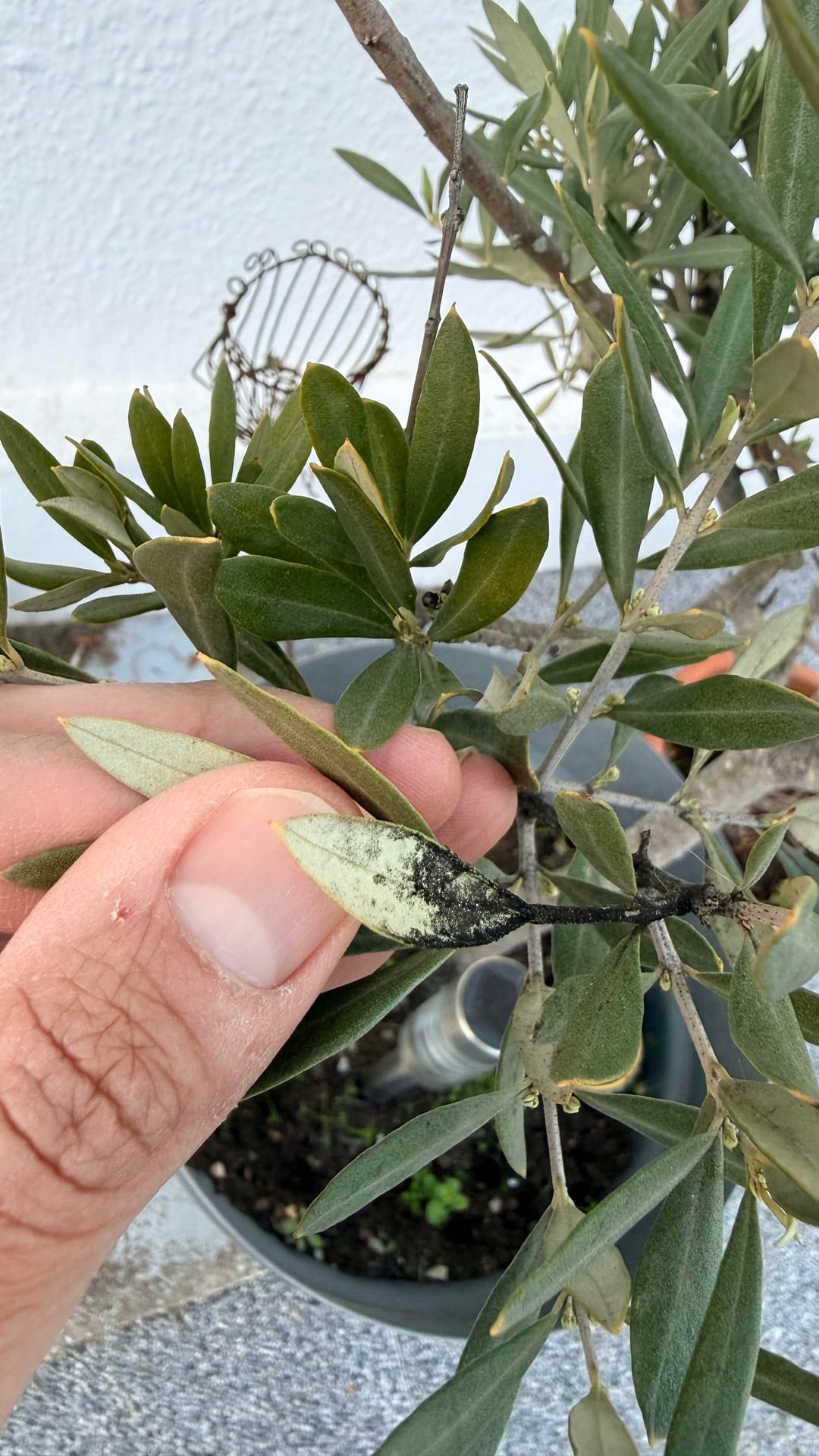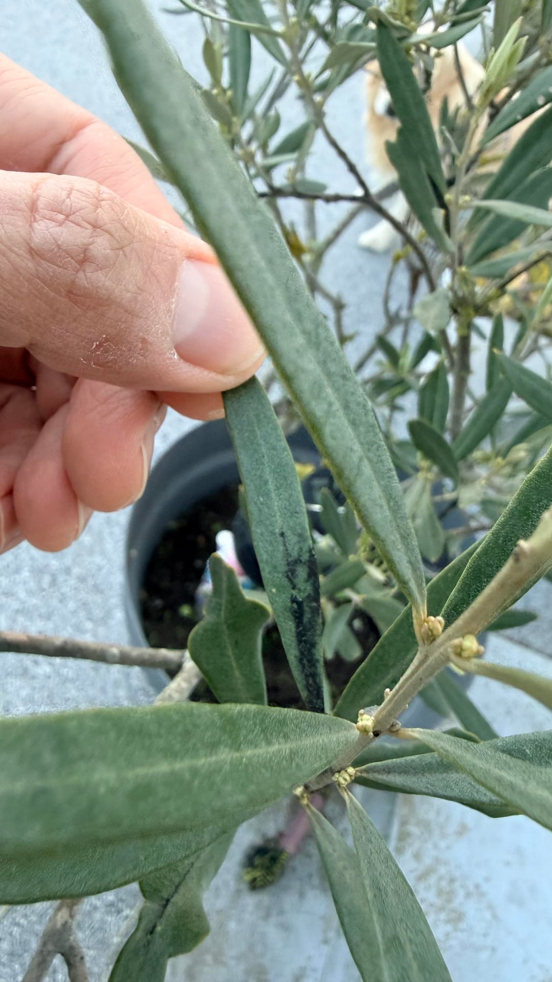 Meine hübschen Olivenbäume sehen seit ein paar Wochen schlecht aus. Als ich näher komme, bemerke ich schwarze Ablagerungen wie Ruß und Narben am Stamm (wahrscheinlich kein Zusammenhang).