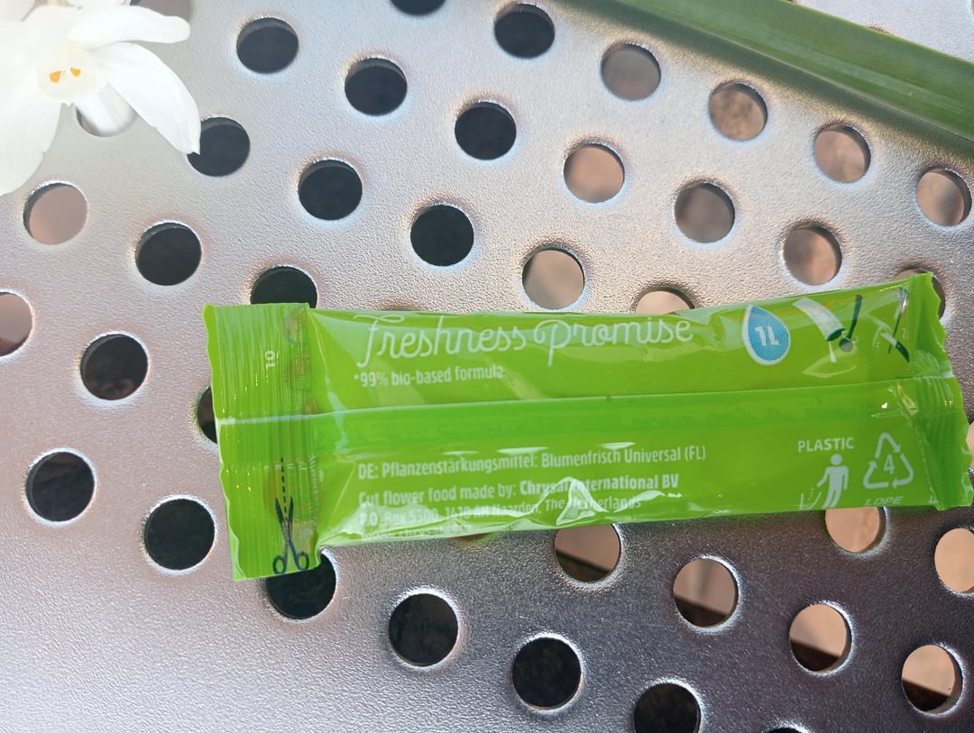 Ich habe diese hübsche Blume gefunden und möchte sie in einer kleinen Vase aufbewahren. Ich habe dieses Blumennahrungsmittel im Laden (Blumenabteilung) gekauft. Kann ich das übrig gebliebene Wasser irgendwie aufbewahren, um es in den nächsten Tagen zu verwenden, wenn das Wasser nicht mehr frisch ist, da ich dies zu einem vollen Liter Wasser hinzufügen muss (ich werde heute nicht alles brauchen)?
