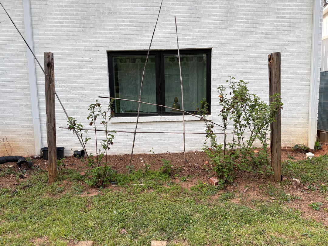 Hier ist mein Vorgartengrundstück. (Der Hinterhof ist zu schattig.) Mein Mann und ich haben das vor etwa 4-5 Jahren gebaut. Wir kauften damals guten Boden und füllten die gesamte Fläche auf. Ich hatte drei Reihen auf jeder Seite des Weges und hinten vor dem Fenster ein Brombeerspalier.