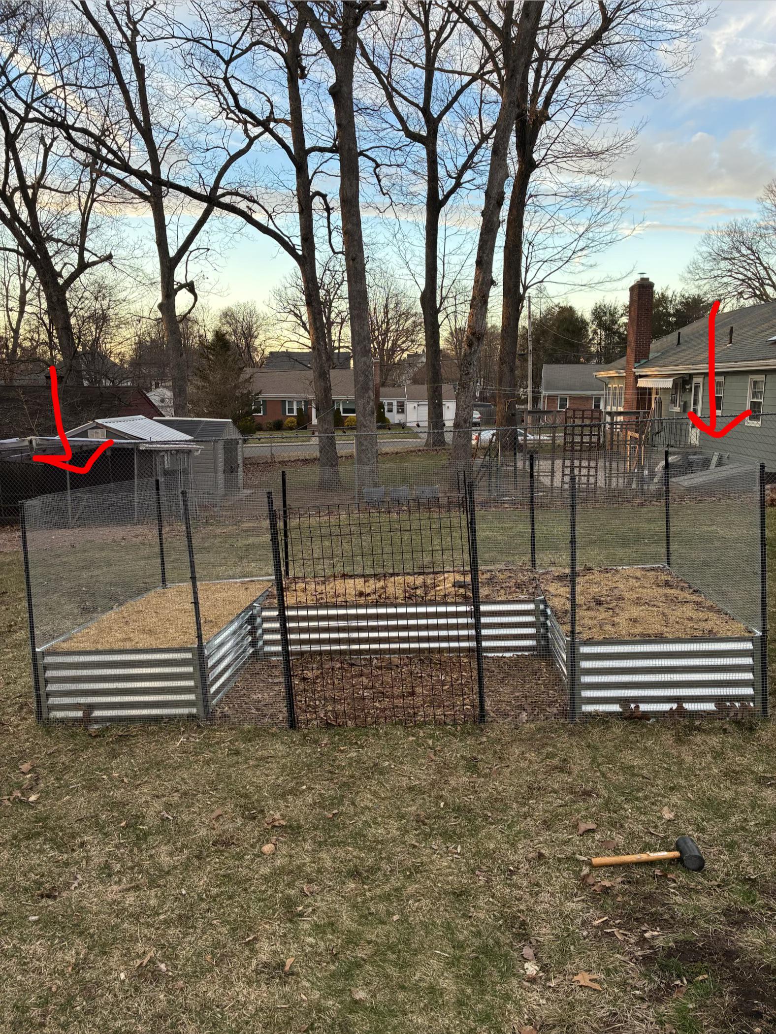 Ich dachte darüber nach, entweder eine Seite des Hühnerdrahts abzuschneiden und ihn an einen hölzernen Gartenpfahl zu heften, den ich herausnehmen und aufrollen kann, wenn ich an diese Seite muss, ODER den Draht möglicherweise ganz abzuschneiden und ihn wieder an zwei hölzernen Gartenpfählen zu befestigen, damit ich eine vollständig abnehmbare Platte herstellen kann.
