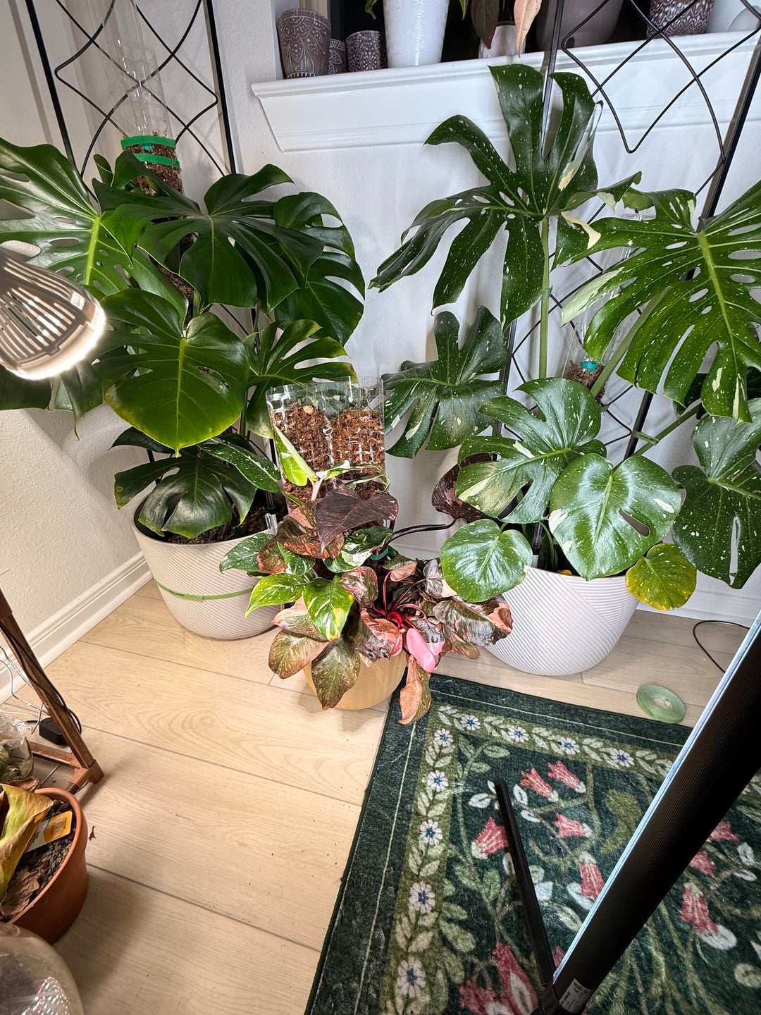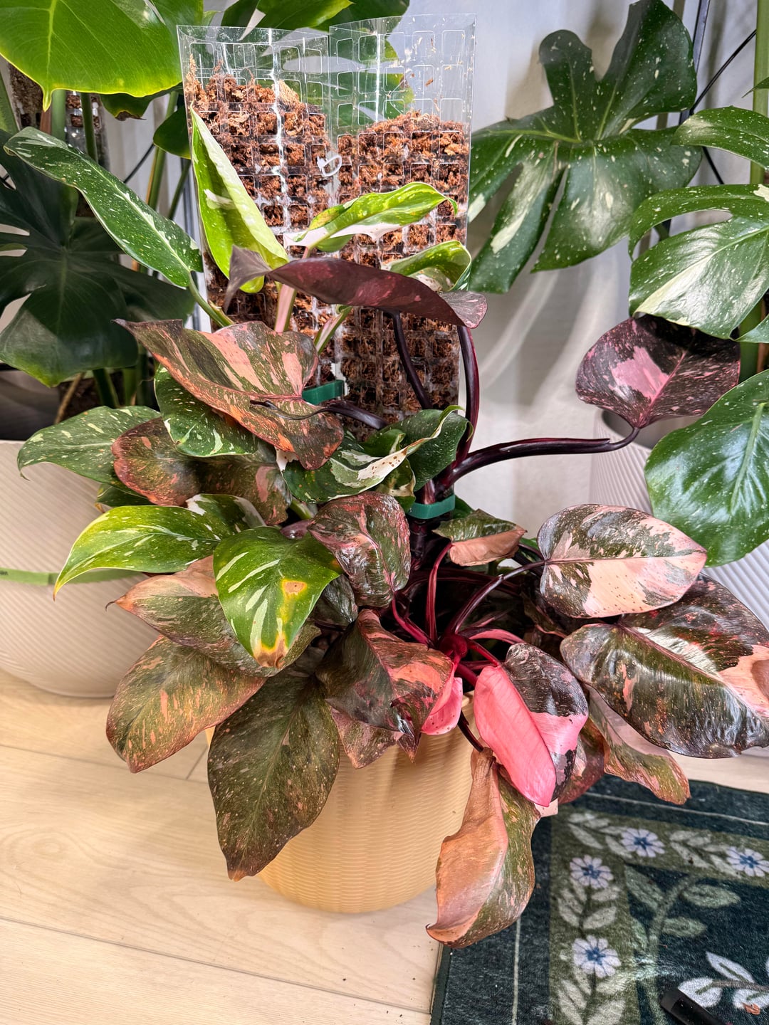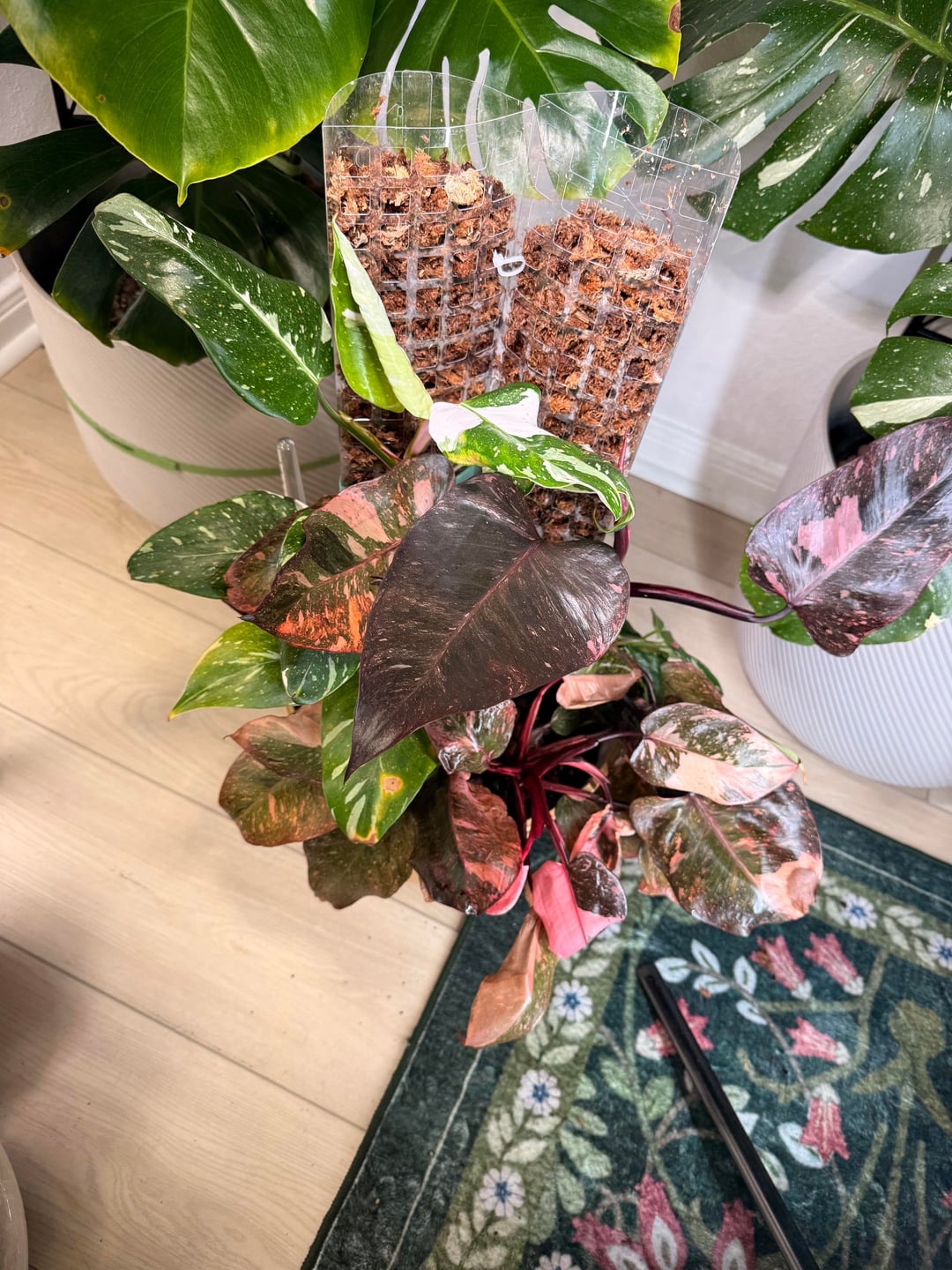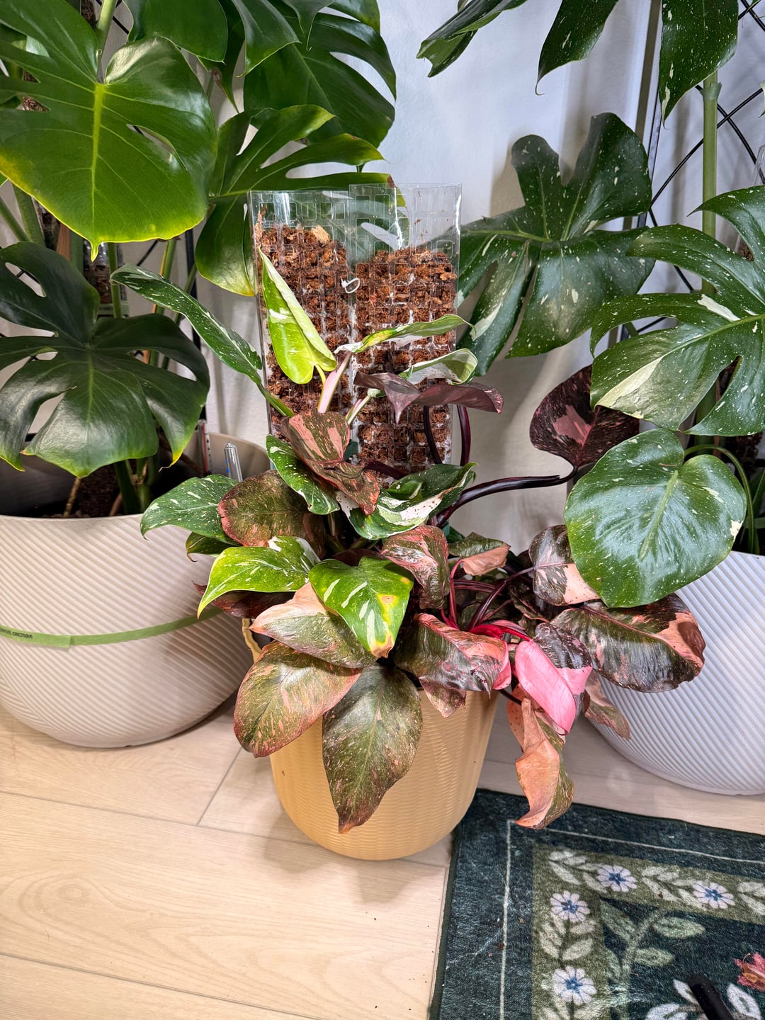 Ich habe einen sehr glücklichen rosa Prinzessinnenphilodendron und einen ziemlich schnell wachsenden weißen Prinzessinnenphilodendron. Sie sind unabhängig voneinander gewachsen, aber ich wollte sie auf Stangen stellen, damit sie größer werden und größere Blätter haben. Aber ich habe PPP auf Stangen gesehen und ich hasse den Knotenabstand. Obwohl bei meinem PPP die Knoten sehr dicht beieinander wachsen, habe ich beschlossen, sie zusammenzutopfen, und mit der Zeit habe ich vor, sie fast miteinander zu verflechten, damit zwei Pflanzen wie eine aussehen. Ich weiß nicht, ob es funktionieren wird, aber mir gefällt, wie es bisher aussieht. Mein WPP ist kleiner als mein PPP, also steht sie im Rampenlicht, aber hoffentlich gleichen sie sich ein wenig aus. Was meint ihr alle?