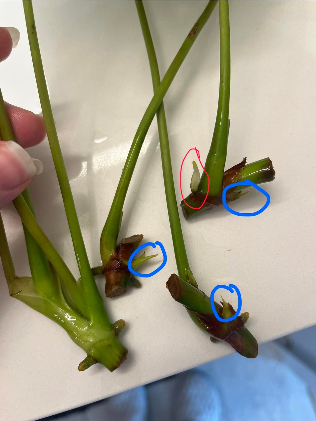 Ich habe vor zwei Wochen ein paar Stecklinge der ausgewachsenen Lilienpflanze meiner Eltern gemacht und sie zur Vermehrung in Wasser gesteckt. Ich habe es in ein nach Westen ausgerichtetes Fenster gestellt (das einzige, das ich habe), sodass es am späten Nachmittag etwa zwei Stunden lang direktem Sonnenlicht und ansonsten den ganzen Tag über helles indirektes Licht abbekommt. Ich habe das Wasser alle paar Tage gewechselt. Abgesehen von dem offensichtlichen rot eingekreisten Wurzelwachstum kann ich nicht sagen, ob die kleinen blau eingekreisten Dinge auch die Anfänge des Wurzelwachstums sind. Ich bin auch verwirrt darüber, warum der Stiel auf der linken Seite anscheinend überhaupt nicht gewachsen ist. irgendwelche Gedanken?