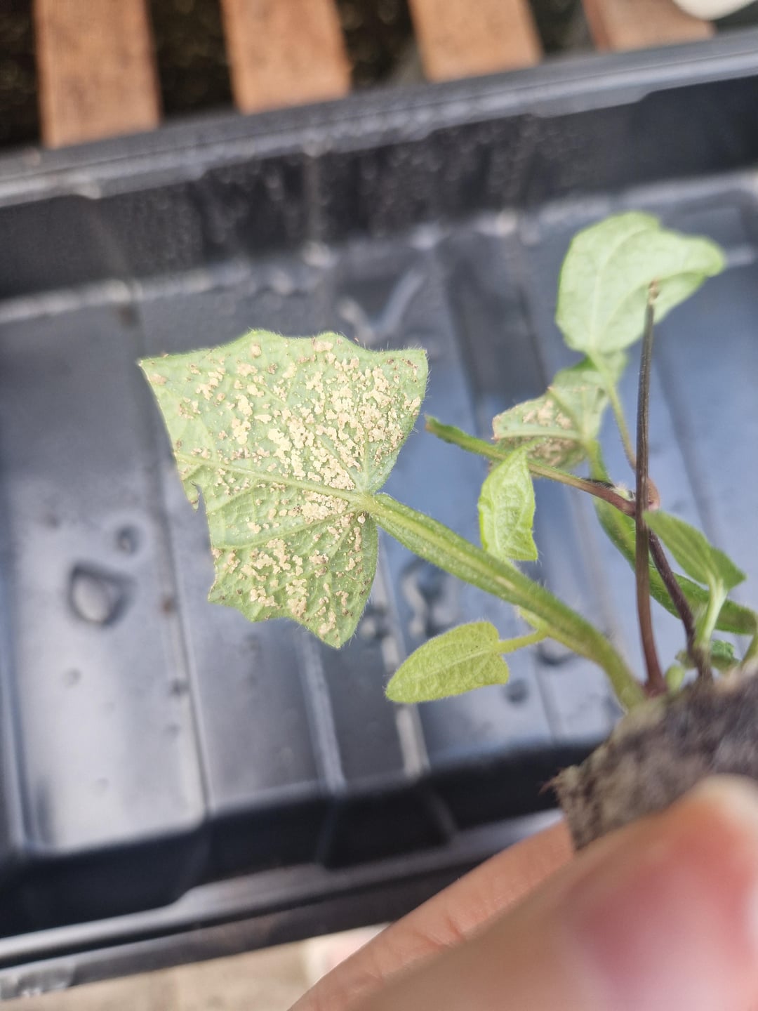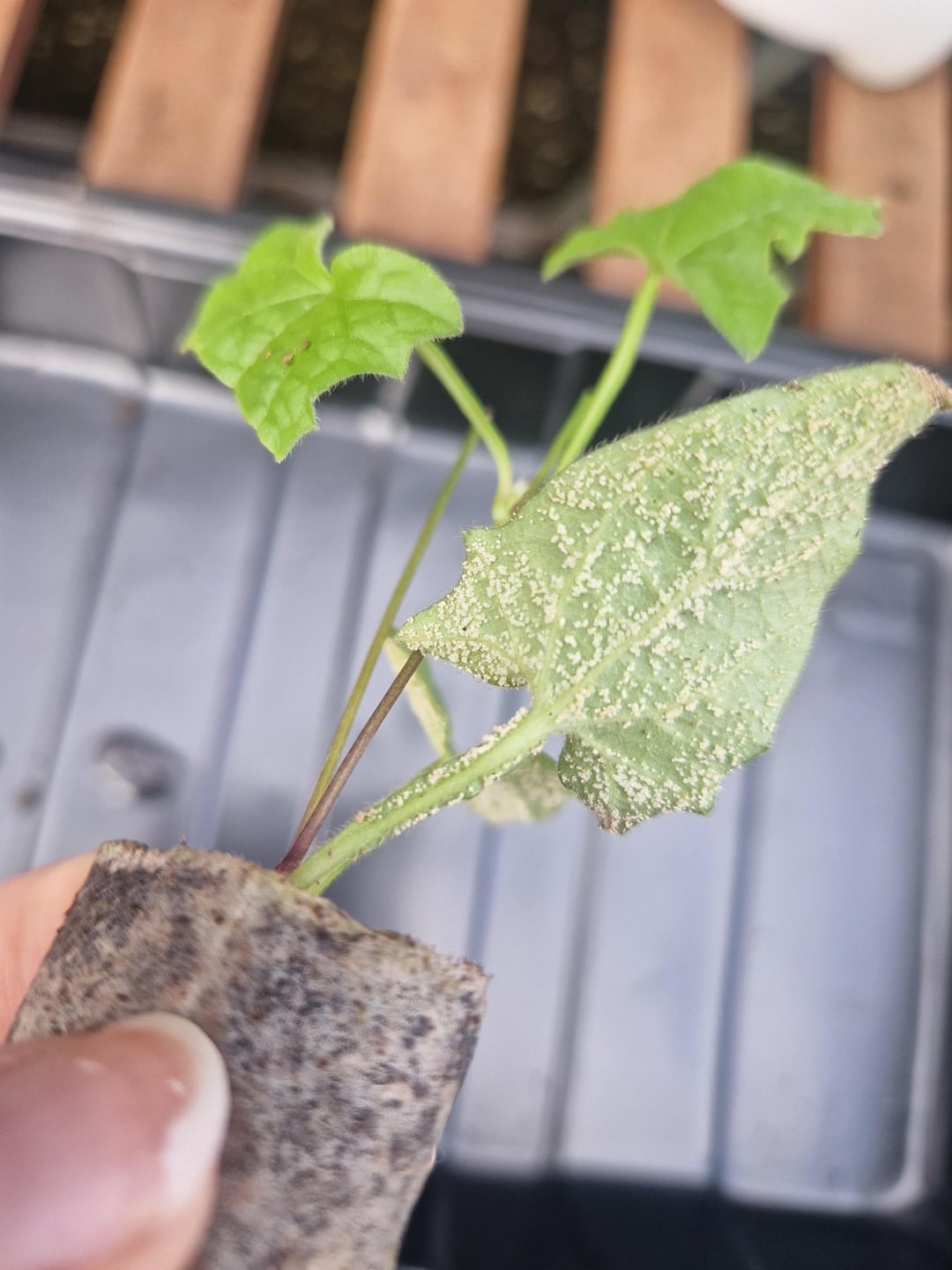 Von Suttons gelieferte Plug-Pflanzen, die auf der Unterseite mit diesem weißen Material bedeckt sind. Das kann doch sicher kein mehliger Befall sein, oder? Es ist nicht flauschig, eher wie kleine harte Kristalle, und die Blätter kräuseln sich nicht … eine Art Rückstand vom Sprühen in der Gärtnerei?