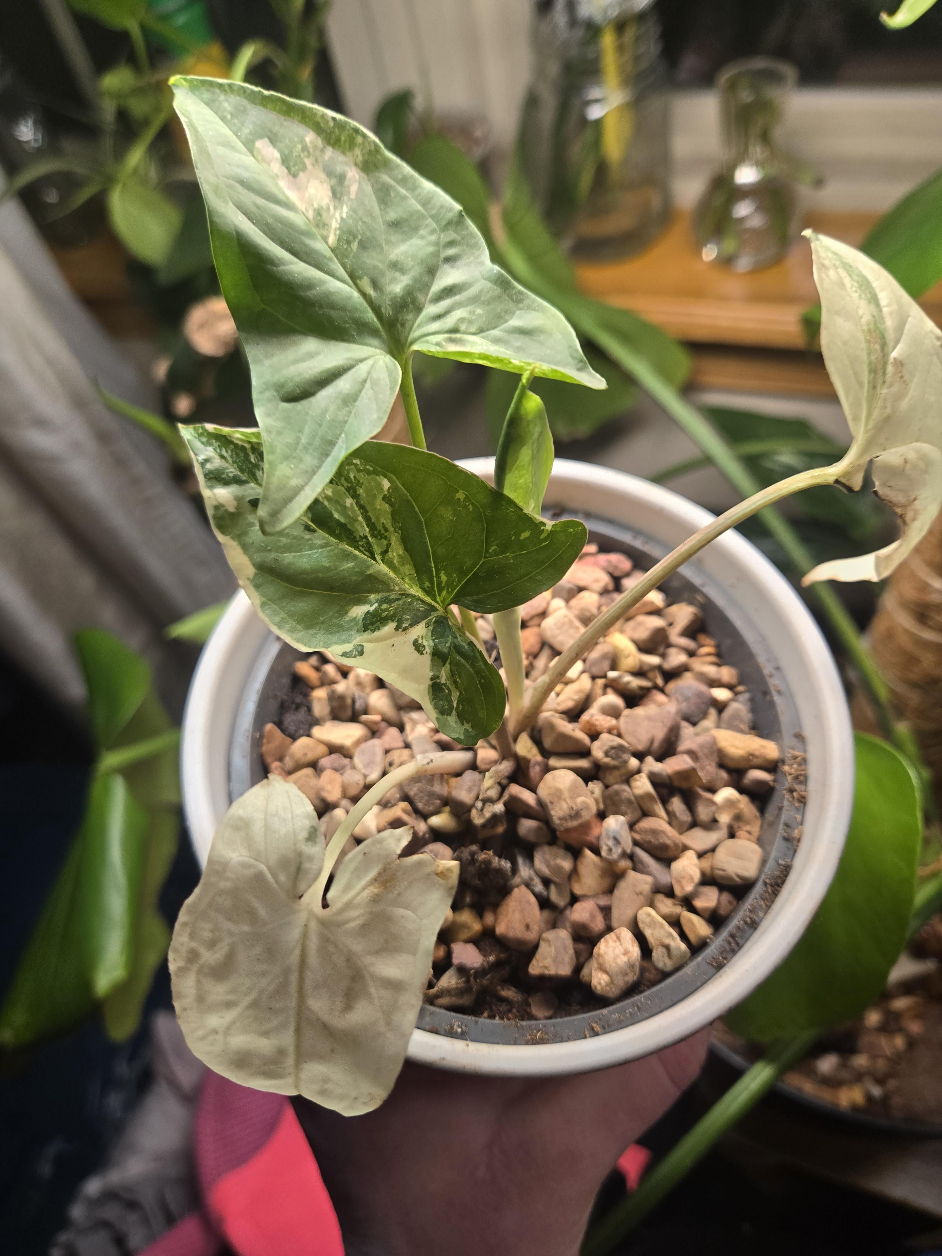 Dabei handelt es sich tatsächlich um zwei Stängel in einem Topf, sodass es sich um unterschiedliche Variationen handeln kann. die gesprenkelte ist eine eigene Pflanze. Als ich sie bekam, war ich mir nicht sicher, ob sie überleben würden. Es waren nur zwei fast abgestorbene kleine Blätter, und ich habe sie mit Wasser gestützt, und sie haben große Wurzeln gebildet, also habe ich sie gepflanzt, und seitdem werfen sie wunderschöne Blätter. Ich frage mich nur, um welchen Typ es sich handelt? Ich habe es von einer Tussi bekommen. Ich habe 20 für 10 Pflanzen bezahlt, die meisten waren in der Reha, aber ich habe durch den Deal ein paar wirklich schöne Pflanzen bekommen und nur eine davon verloren (wahrscheinlich wäre sie irgendwann gut gewachsen, aber ich verbrachte 2 Monate ohne Anzeichen von Überleben und die Unterseite des Stiels fing an, unruhig zu werden, ich habe das Ganze einfach weggeworfen)