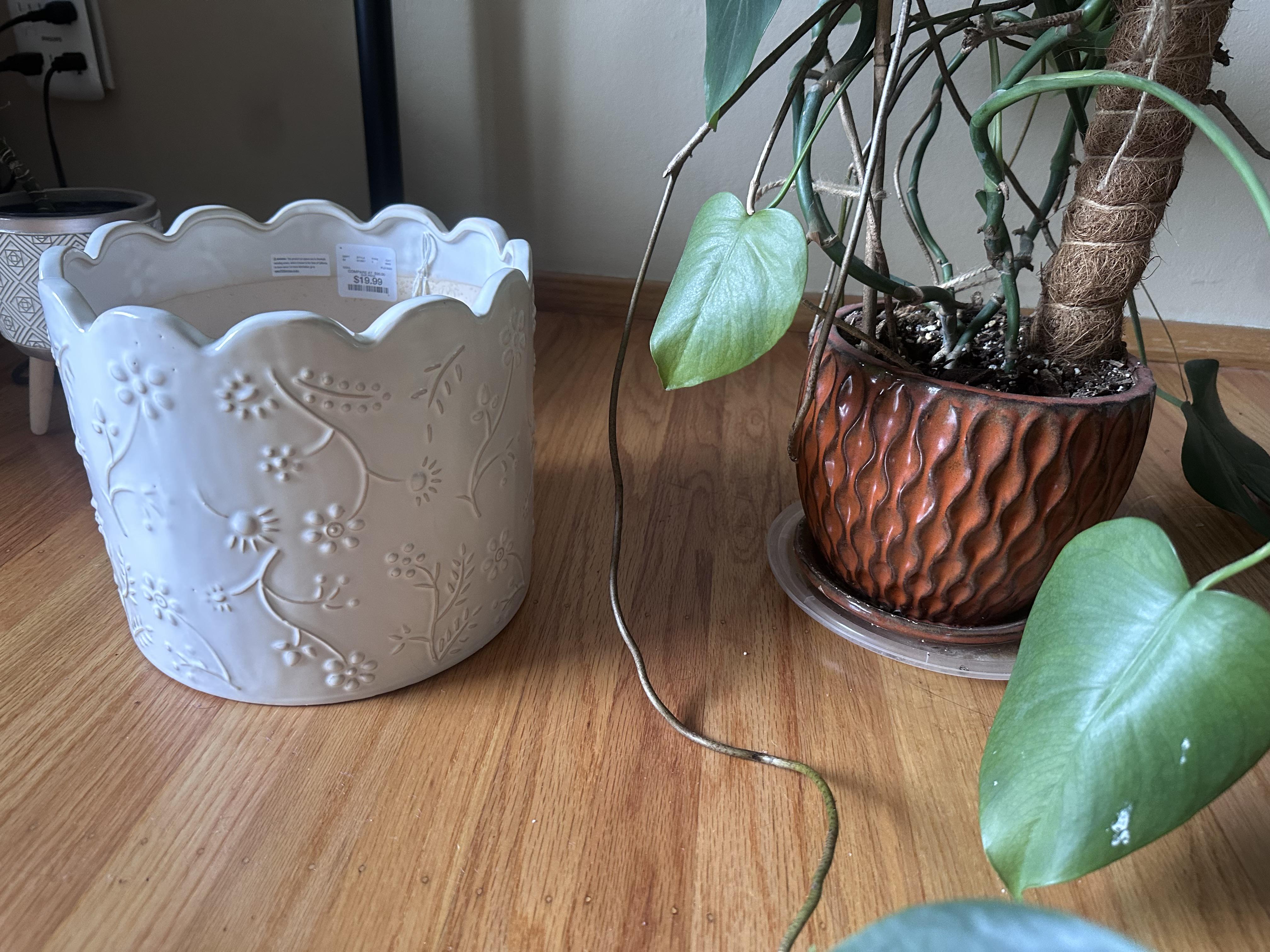 Facebook Twitter LinkedIn Pinterest Bluesky Threads Meine Monstera befindet sich gerade in einem 7,5-Zoll-Topf. Der weiße Topf links ist 9,5 Zoll groß. Ist das zum Umtopfen in Ordnung oder sollte ich mir etwas Kleineres zulegen? Von: Cultural-Slip-7142