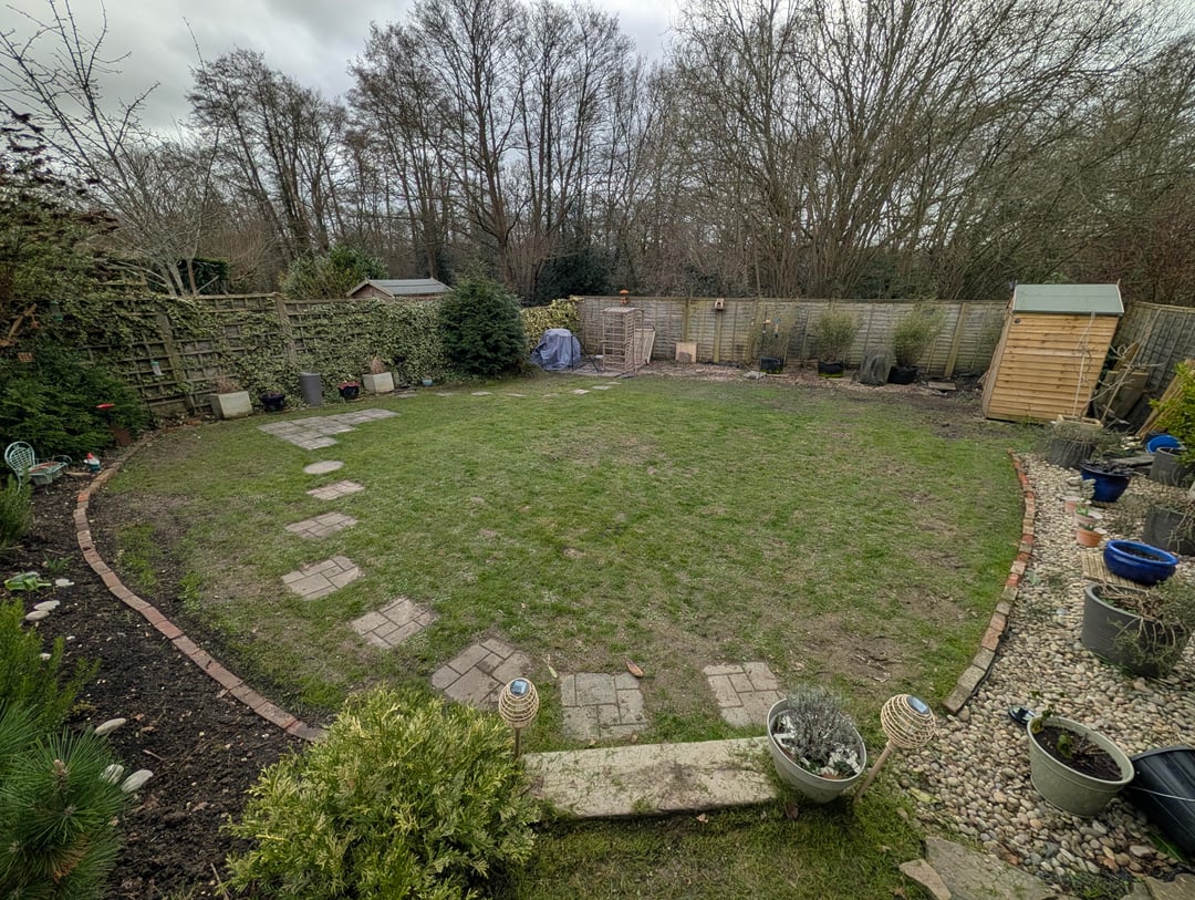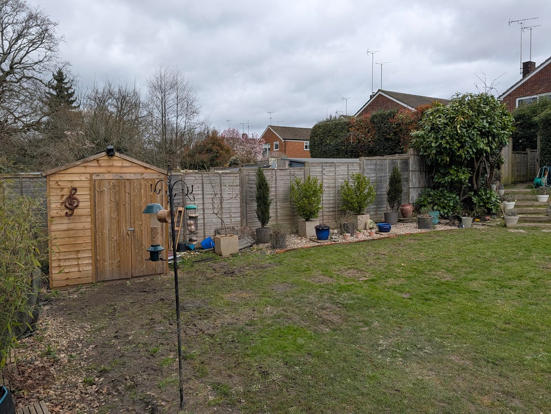 Was ich bisher weiß: Unser Boden besteht aus Lehm und ist daher sehr anfällig für Staunässe. Wir haben den Fehler gemacht, den Schuppen in der möglicherweise schlechtesten Position zu platzieren, was bedeutet, dass wir den Rasen in der hinteren Ecke ziemlich durcheinander gebracht haben, weil wir fast jeden Tag zum Schuppen laufen mussten (Naturschutzgebiet hinter unserem Haus, also viele hungrige Vögel, dort bewahren wir ihr Futter für die Futterhäuschen auf). Deshalb habe ich vor, den Schuppen an eine geeignetere Stelle zu versetzen, möglicherweise auf die Steine, damit wir im Winter überhaupt nicht über den Rasen laufen müssen.