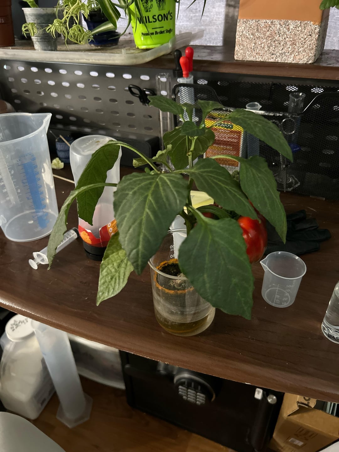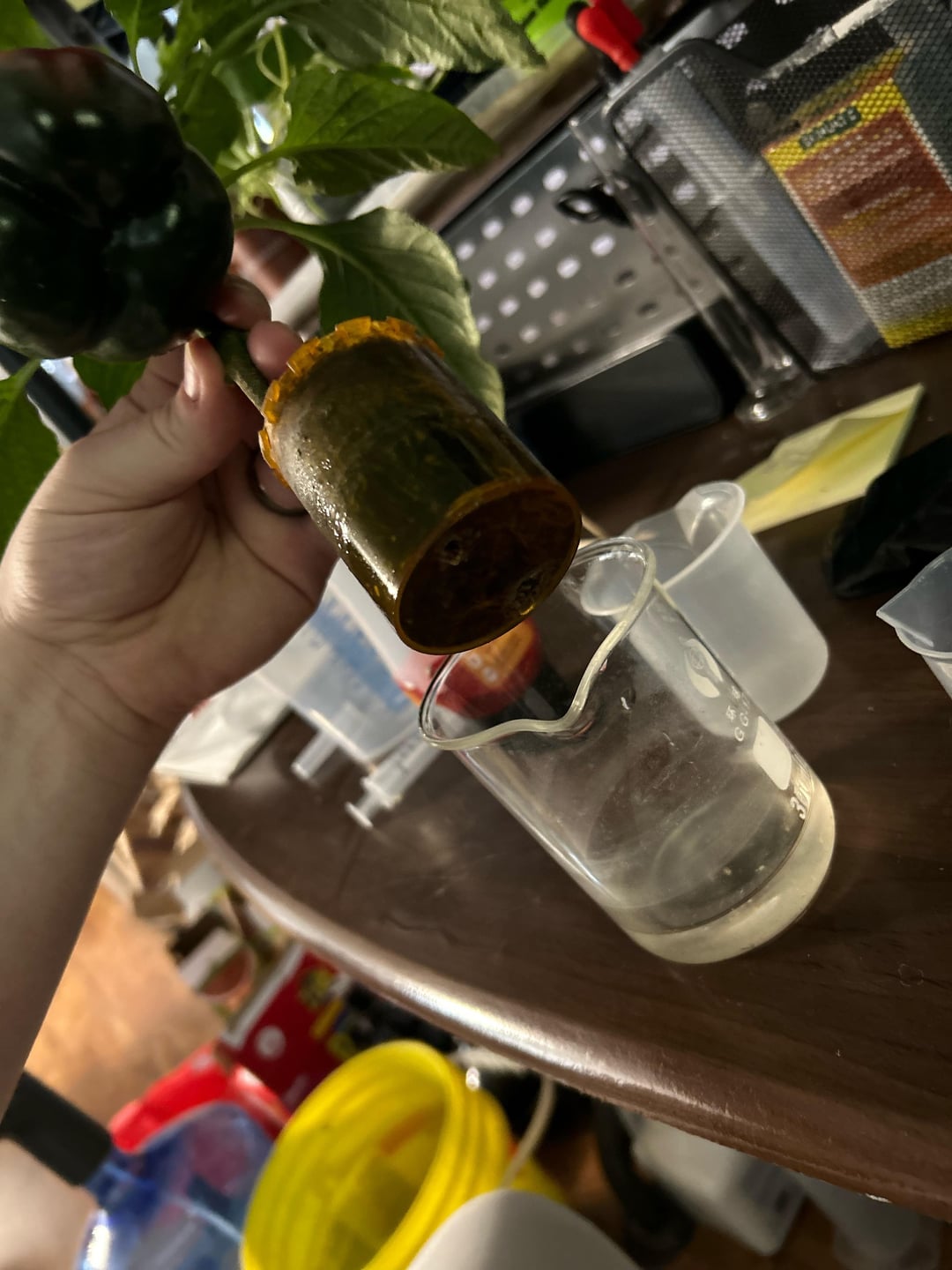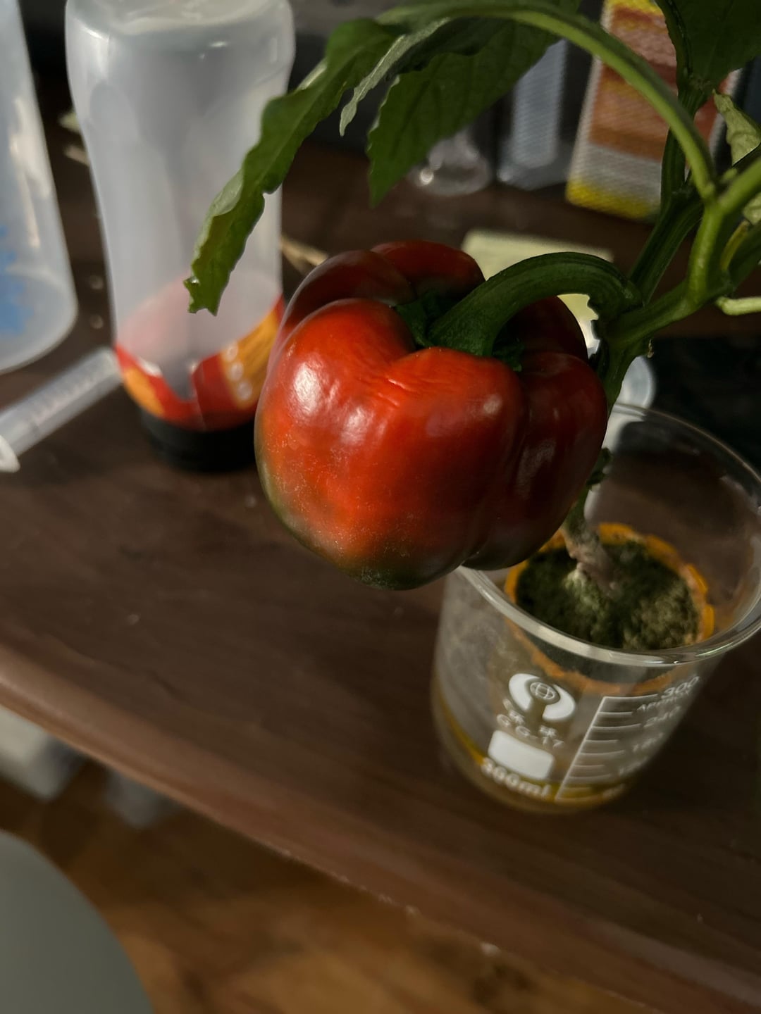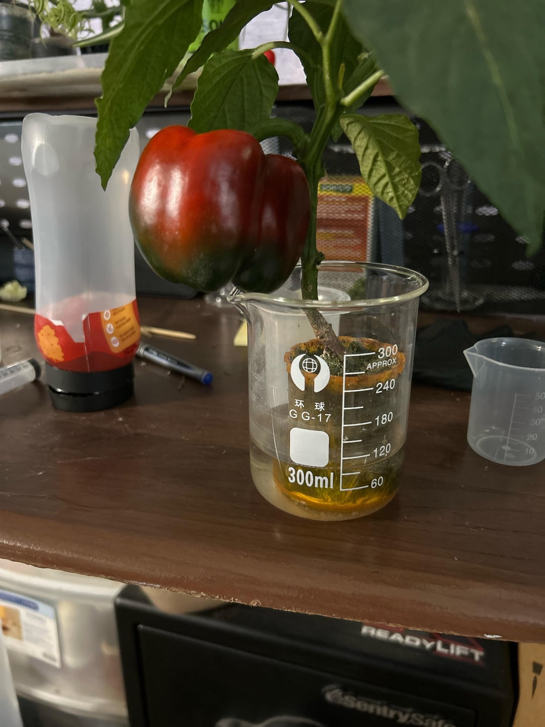 Ich habe diese Paprika ausschließlich in einer Tablettenfläschchen angebaut. Ich habe den Becher als Reservoir hinzugefügt, weil es nicht gut war, ihn 5x am Tag zu gießen. Ich bin wirklich froh, dass es tatsächlich reif ist, und es war ein lustiges Experiment. Traurig, dass es vorbei ist, aber es schafft Platz für ein anderes Projekt.
