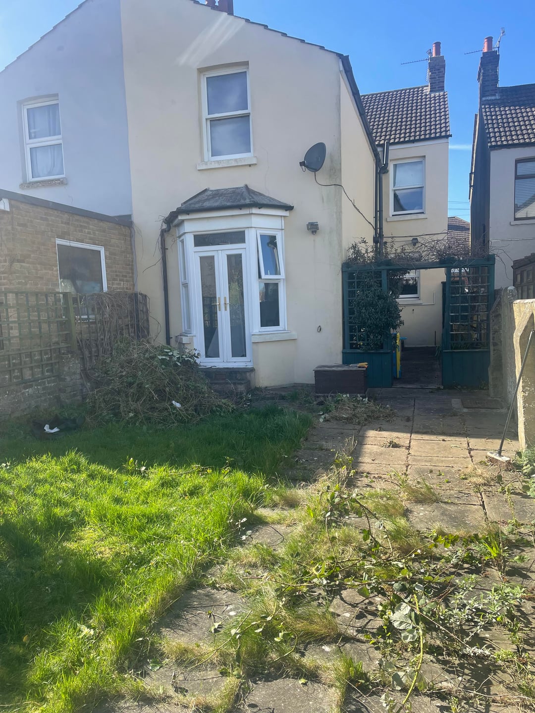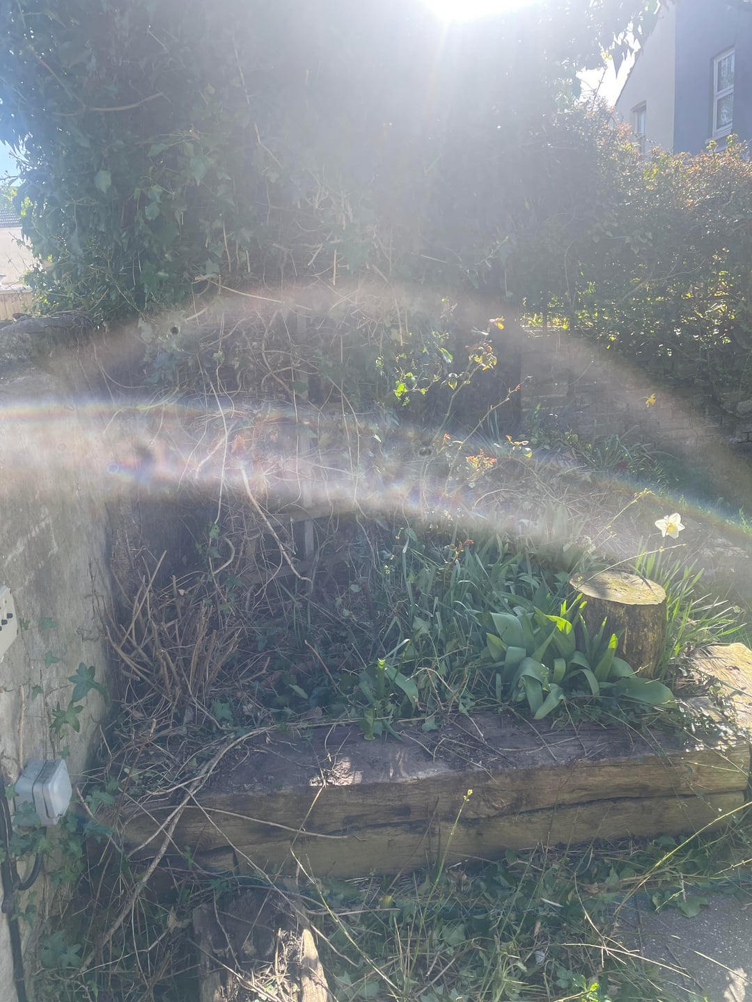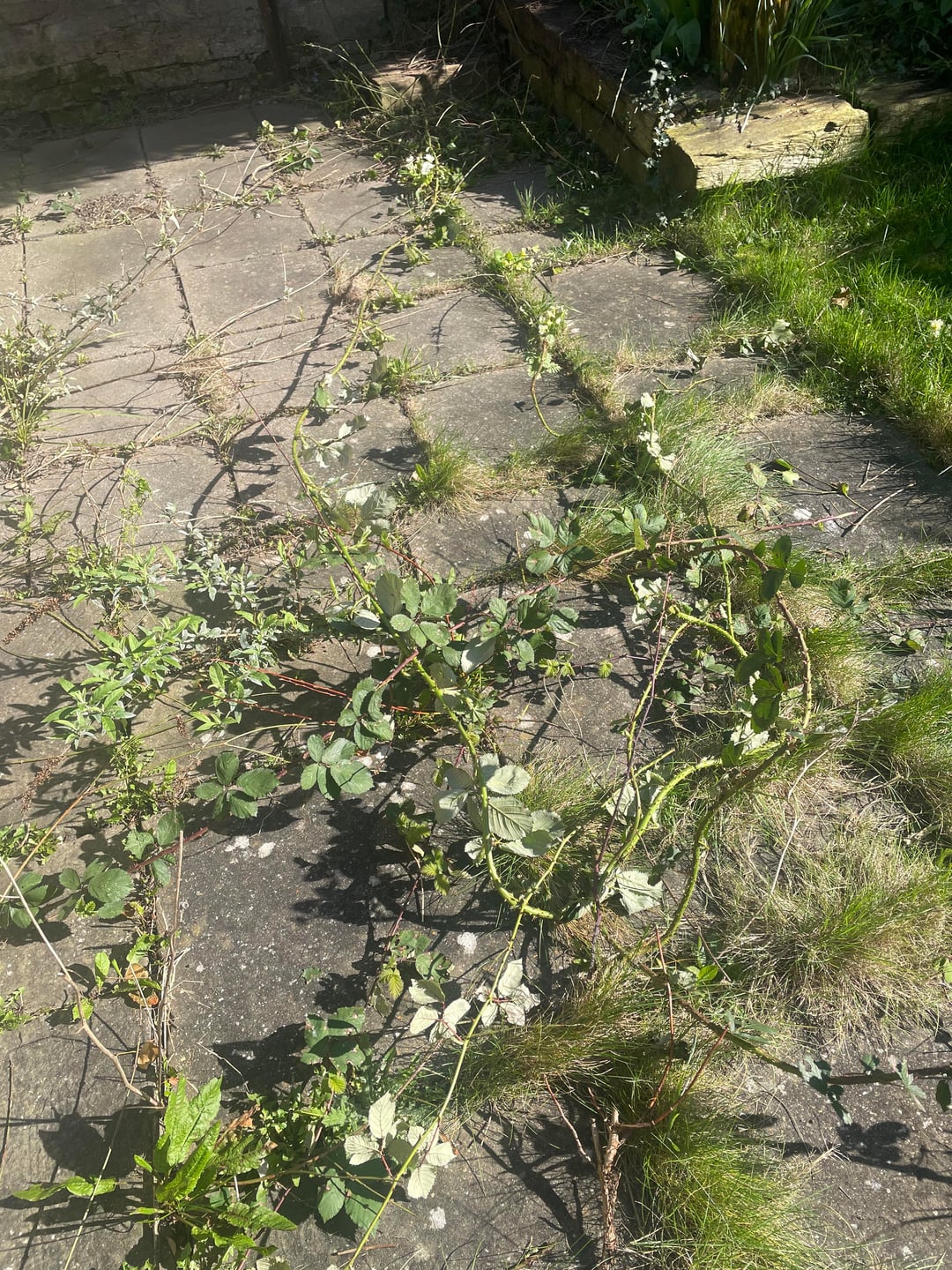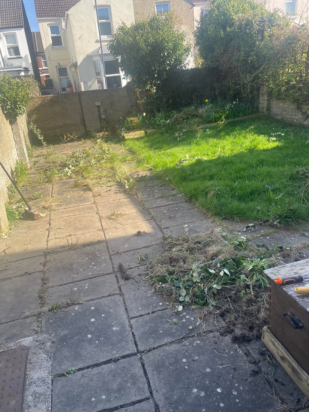Die Vorbesitzer haben überhaupt nichts mit dem Garten gemacht und ihn die letzten 5 Jahre in Ruhe gelassen. Ich habe damit begonnen, das überwucherte Unkraut von der Terrasse zu entfernen, und ich möchte das Gras mähen, etwas für den rechten Zaun tun und eventuellen Schutt entfernen. Mir ist bewusst, dass ich irgendwann die Terrasse umbauen muss, aber ich werde im August mein Kind zur Welt bringen und auch ein Kleinkind bekommen. Deshalb werde ich versuchen, einen Spielbereich für sie und einen Sitzbereich für meinen Partner und mich zu schaffen.
