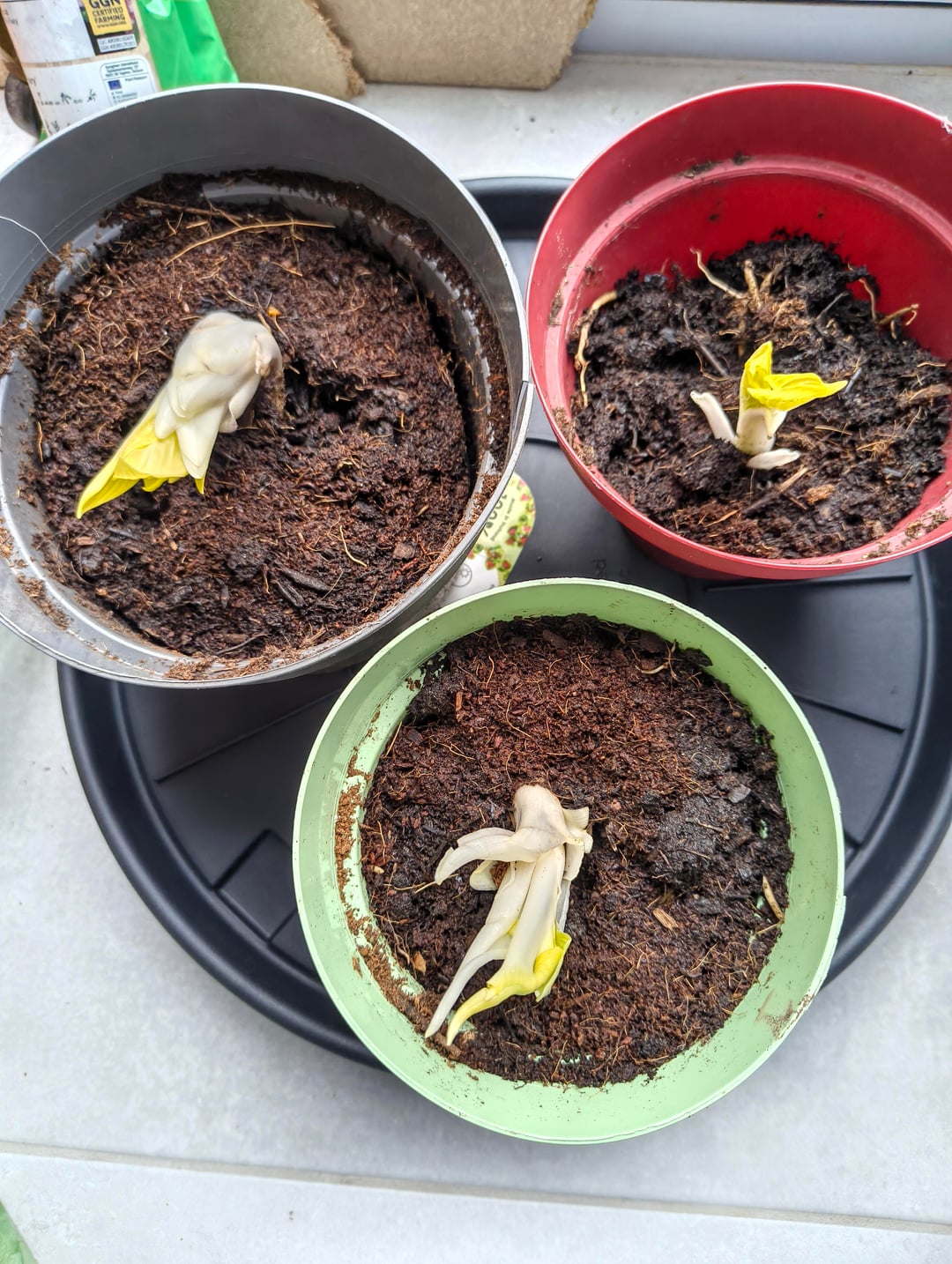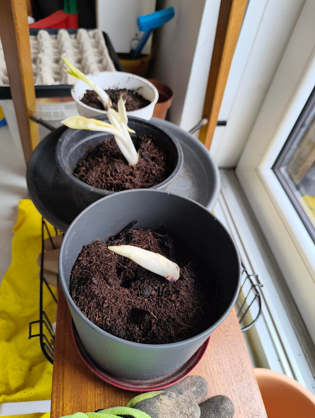 In der Tüte befanden sich 6 Wurzelballen, die alle durcheinander waren, und es wurde nicht angegeben, welcher Wurzelballen welcher ist … Ich weiß nicht, ob es jeweils 6 verschiedene Sorten sind oder zwei von drei verschiedenen oder was auch immer. Geheimnisvolle Funkien! Sie haben begonnen, in der Tüte zu wachsen, und stehen etwas schief, in der Hoffnung, dass sie sich besser entwickeln können, wenn man sie drinnen in Töpfe pflanzt, während man darauf wartet, dass das Wetter etwas wärmer wird, bevor man sie in ein Blumenbeet pflanzt (Zone 8a, Europa, derzeit Nachtfrost und Hagel).