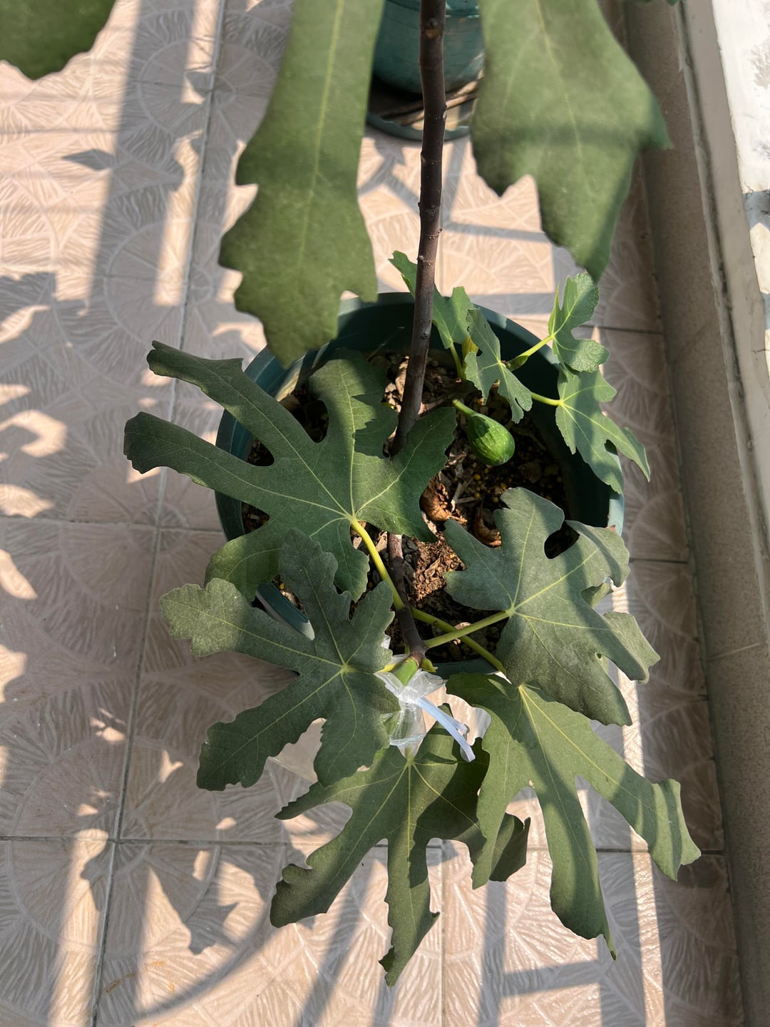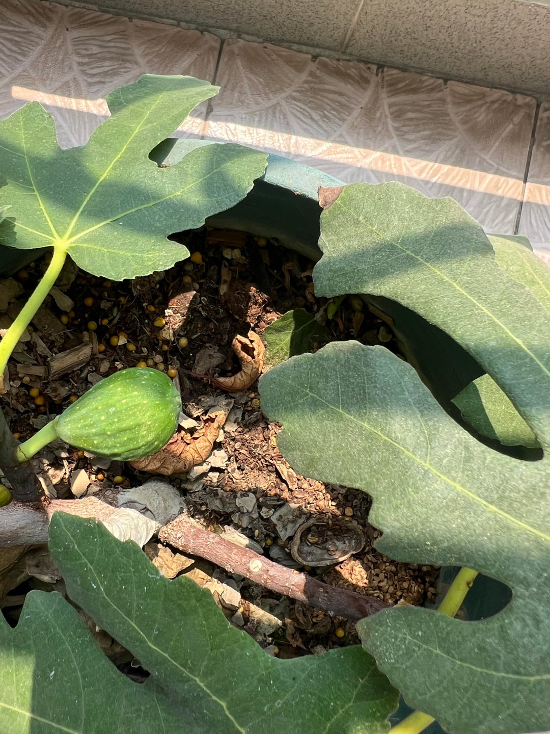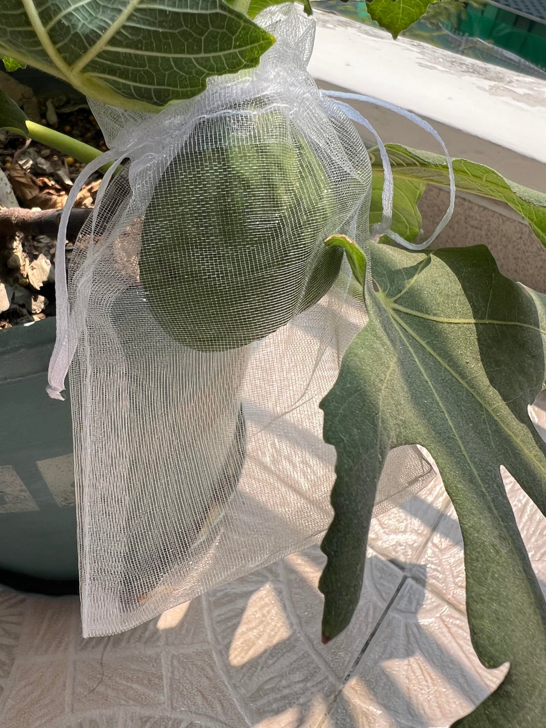 Wir haben einen kleinen Feigenbaum in einem Topf auf dem Balkon gepflanzt. Letztes Jahr trug es eine einzige Frucht; Bemerkenswerterweise hat es in diesem Jahr vier Exemplare gegeben! Eine der Feigen ist bereits reif, wir haben sie gegessen, obwohl ich bedauere, vergessen zu haben, ein Foto zu machen. Und nun warten wir gespannt auf die Reife der restlichen drei!