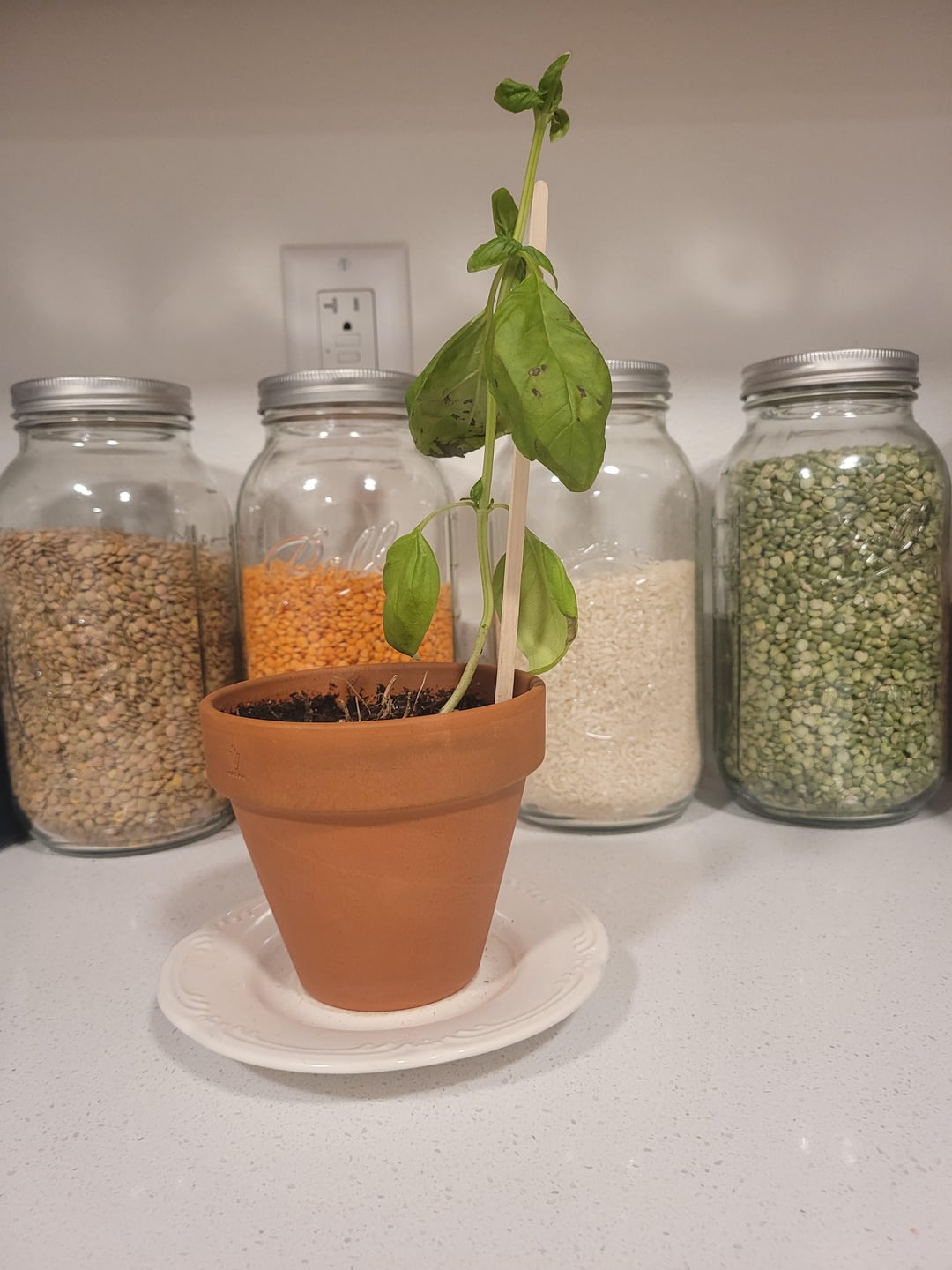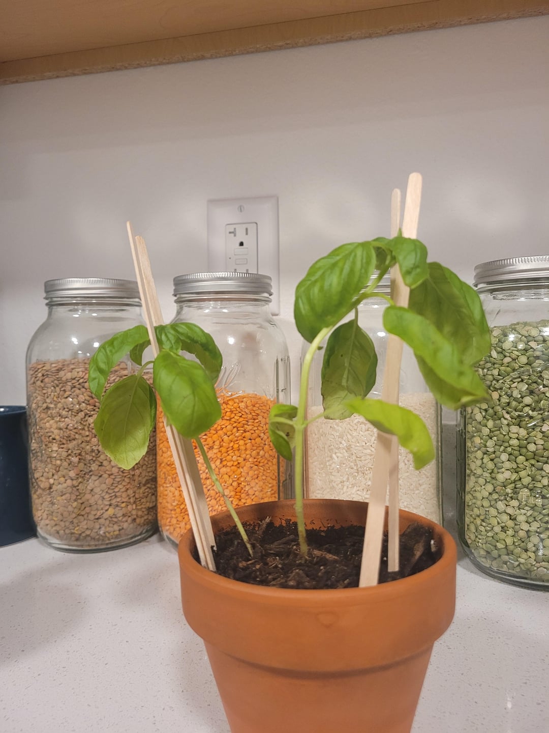 Ich habe vor etwa zwei Wochen eine Basilikumpflanze gekauft. Abgesehen von Wasser und Sonne habe ich es so gut wie in Ruhe gelassen. Letzte Woche habe ich umgetopft, einige Wurzeln abgetrennt und diejenigen entfernt, von denen ich dachte, dass sie es nicht schaffen würden. Ich habe nachts gegossen, außerdem habe ich einen Becher Wasser darunter gestellt und ihn tagsüber auf die Fensterbank gestellt, damit die Sonne scheint. Bisher scheinen sie okay zu sein? Das kleinste Exemplar ist allerdings nicht sehr stabil, es war nach unten gebogen und brauchte einen Stock, um es aufrecht zu halten (3. Bild links)