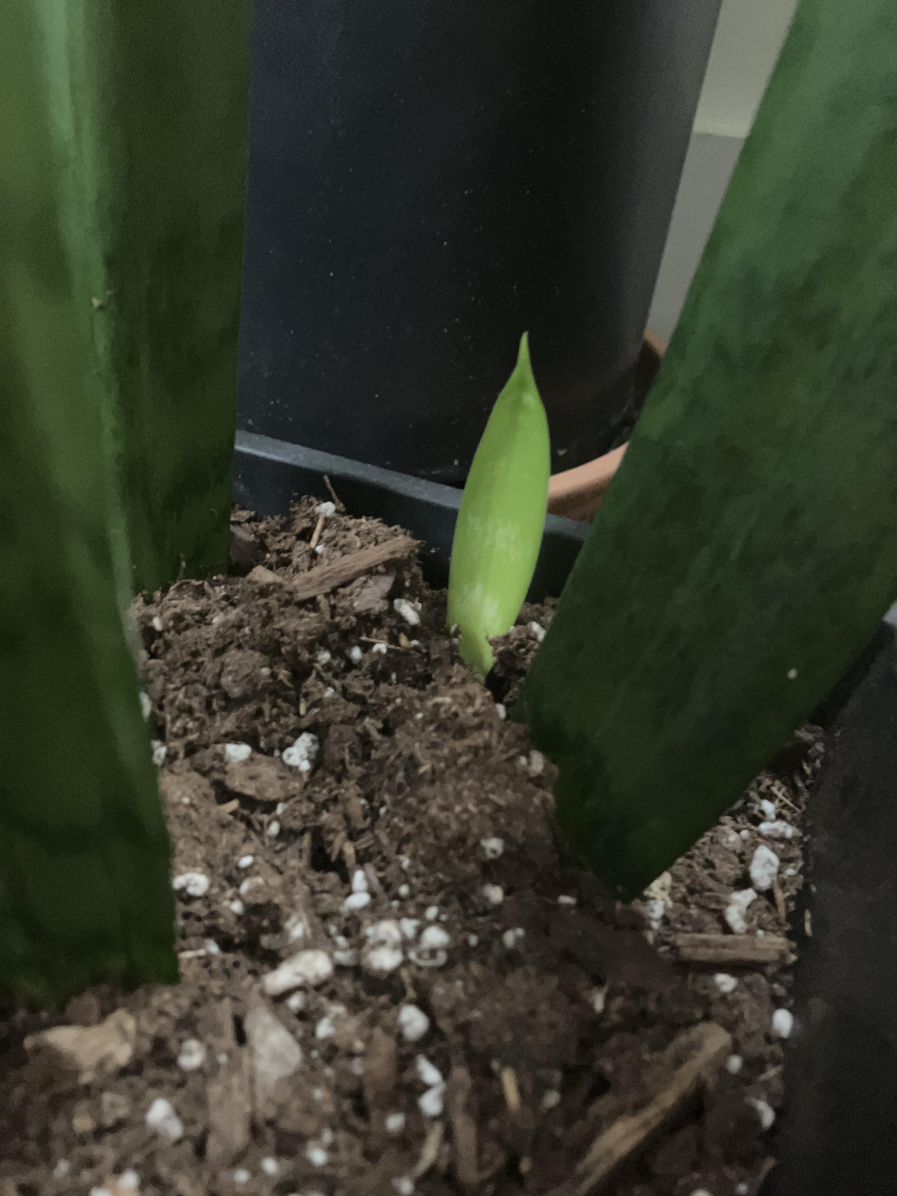 Einige Monate später konnte ich bei allen einzelnen Topfpflanzen keine Veränderungen feststellen. Ich beschloss, sie alle zu nehmen und sie in dem abgebildeten Plastiktopf wieder zusammenzusetzen, um die ursprüngliche Pflanze, die ich getötet hatte, wieder zusammenzusetzen. Noch ein paar Monate später und es gibt einen kleinen Spross! Ich bin froh, dass meine Schlangenpflanze endlich neues Wachstum erzielen konnte.