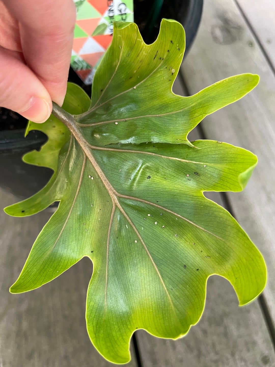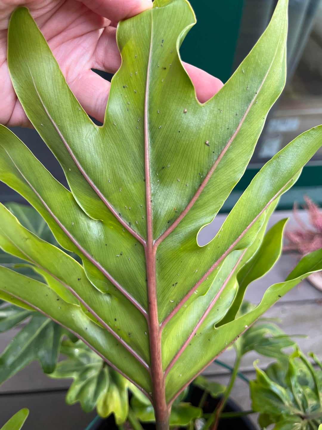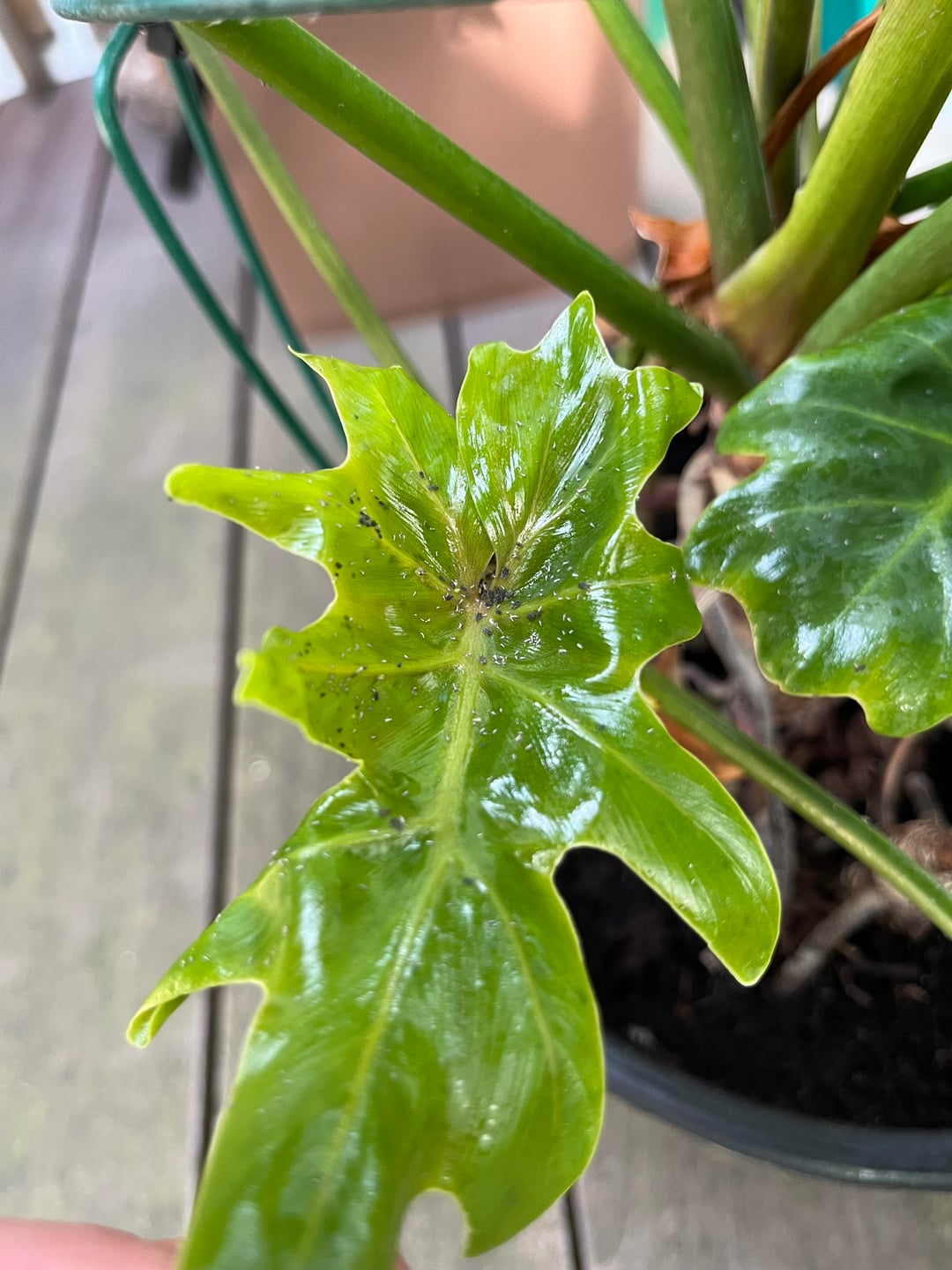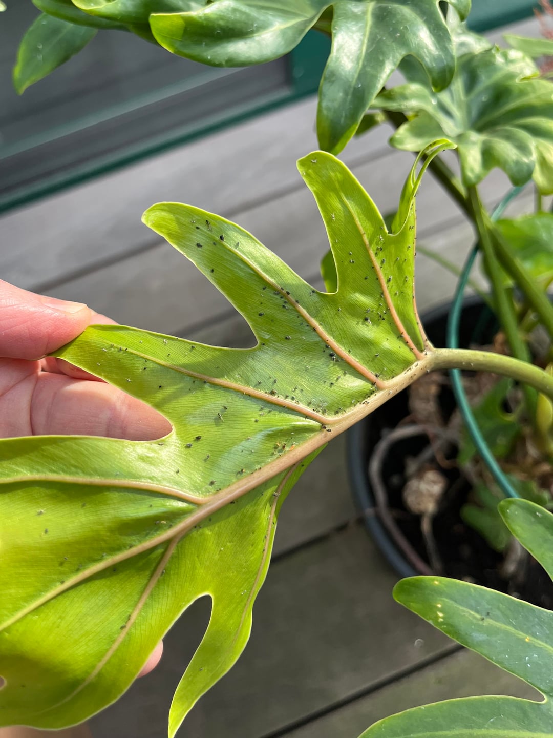 Ich kaufte diese Philodendron-Pflanze, um eine örtliche Schule zu unterstützen, und bemerkte die kleinen Drecksäcke erst, als ich schon zu Hause war. Die schwarzen Punkte befinden sich nur auf der Unterseite der großen Blätter und auf den kleinen unten. Sie sind überall.