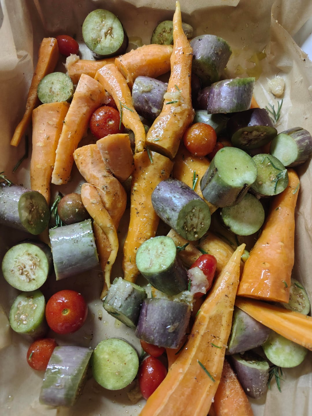 Hat vielleicht die ganze Saison gedauert, aber ich habe heute Abend ein paar große Exemplare zum Abendessen bekommen, mit meinen selbst angebauten Tomaten, Auberginen und Rosmarin, mit etwas zusätzlichem Knoblauch, Honig, Salz und Pfeffer.