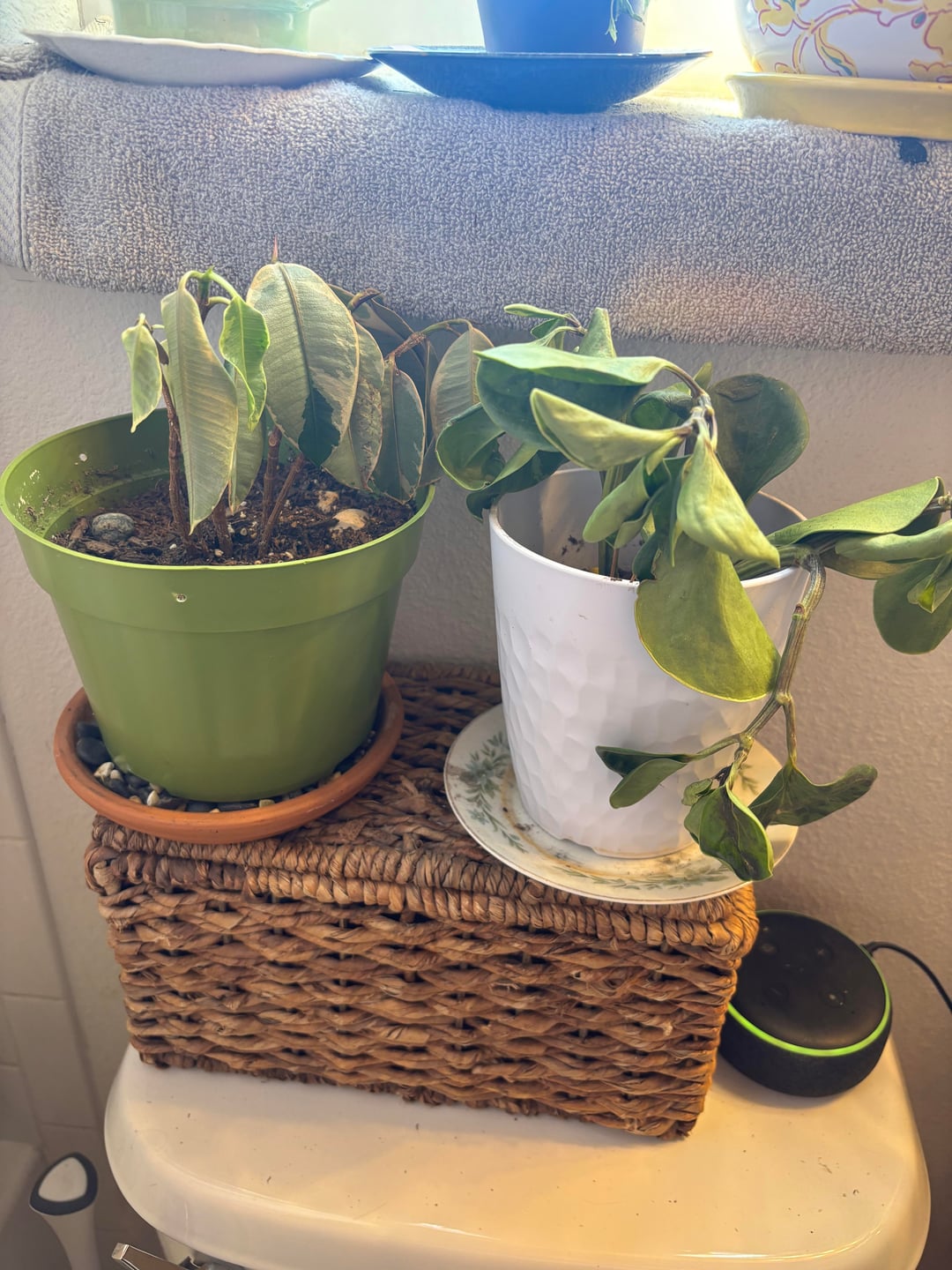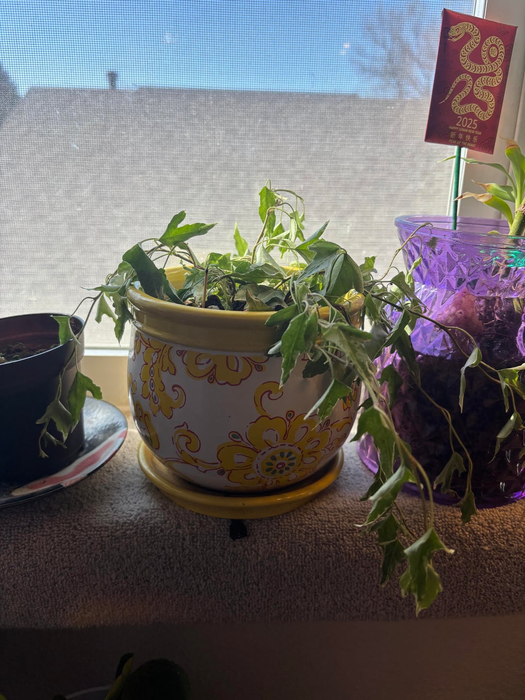 Hallo zusammen! Ich habe diese drei Pflanzen, die in einem nach Süden ausgerichteten Fenster stehen. Normalerweise steht der Efeu im Westen, aber er begann zu hängen. Also habe ich es für ein paar Tage verschoben. Ich frage mich nur, ob mir jemand sagen kann, was los ist. Ich habe Angst vor dem Gießen, falls es kein Bewässerungsproblem ist? Brauchen sie mehr Licht? weniger?
