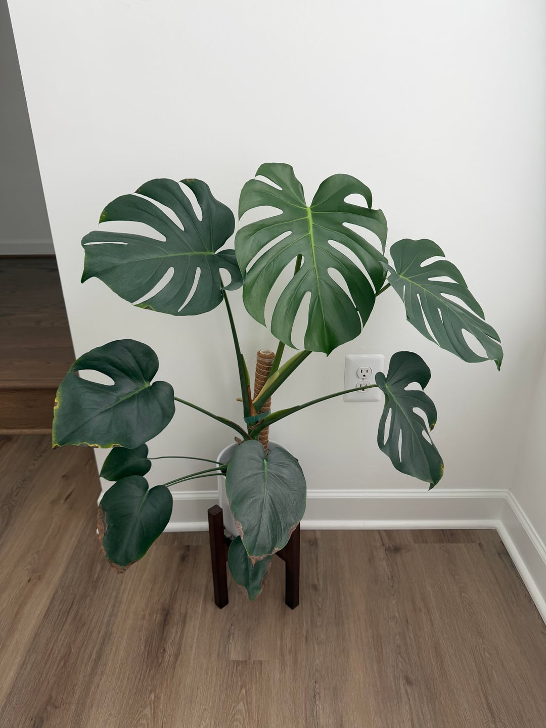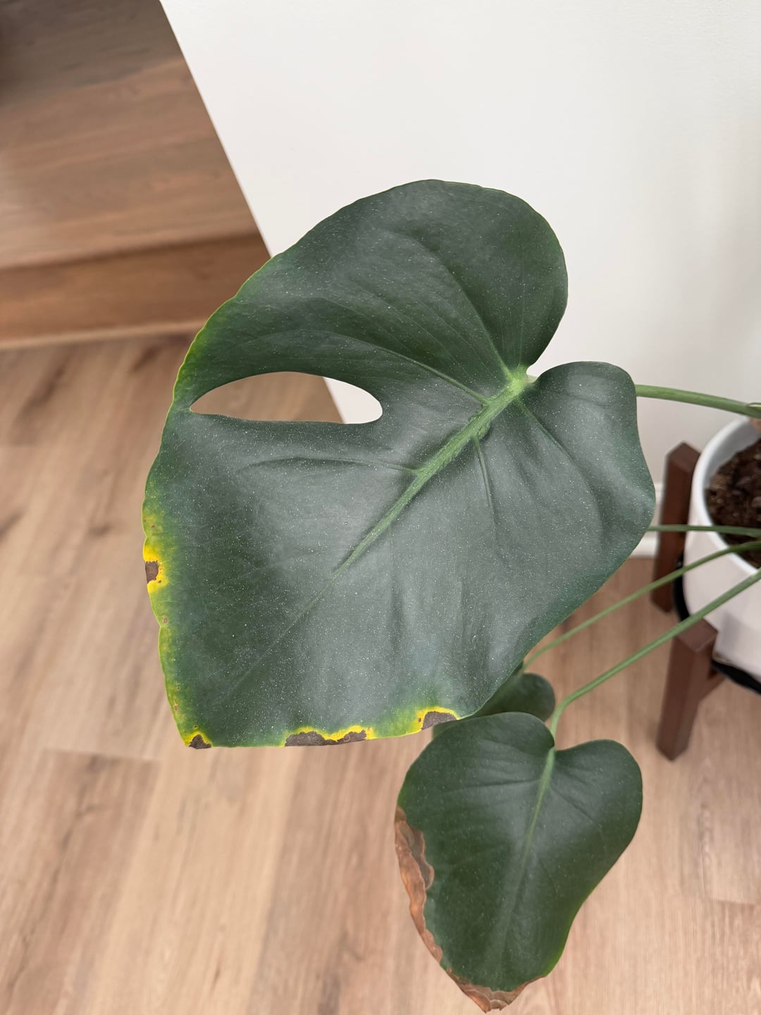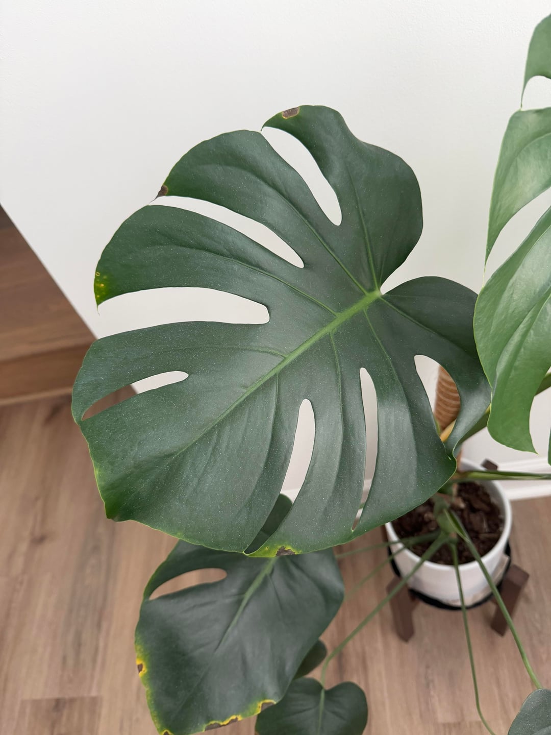 Es gibt ein Abflussloch, also habe ich es einmal pro Woche so lange gegossen, bis es aus dem Boden herausfließt. Da ich aber testen wollte, ob ich zu viel gieße, habe ich es 1,5 Wochen stehen lassen und auch nicht zu viel gegossen. Aber es scheint, dass es mehr braune/gelbe Ränder gibt 🥲 könnte es unter Wasser liegen?! Es befindet sich in der Nähe eines nach Osten ausgerichteten Fensters. Früher habe ich die Jalousien so gedreht, dass das Licht direkt darauf scheinen kann, aber jetzt drehe ich sie weg, für den Fall, dass sie die Blätter verbrennen. Es besteht aus einer Mischung aus tropischen, saftigen Kakteen und etwas Orchideenrinde. Ich weiß, dass es staubig ist 😂, aber ich habe keine Käfer unter den Blättern oder an den Blattstielen gesehen?