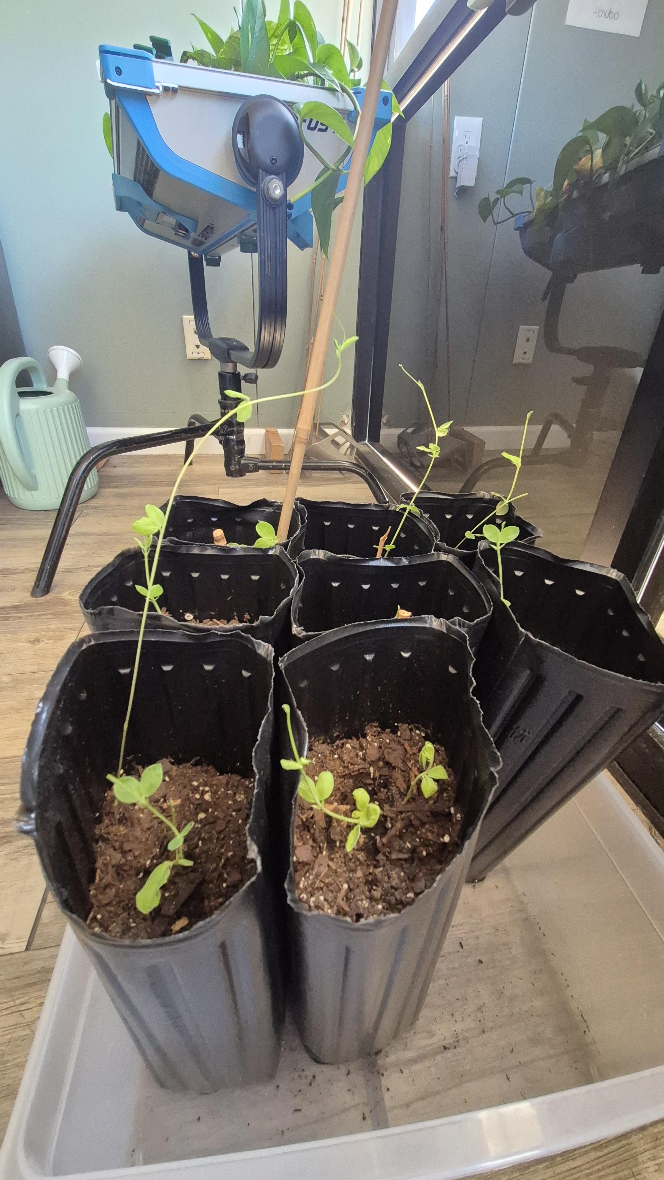 Ich habe diese süßen Erbsen angebaut. Ich gieße dann oft, vielleicht zwei- oder dreimal pro Woche, wenn sie gewachsen sind. Ich habe die Spitzen schon früh abgeschnitten und einige treiben sehr schnell aus. Ich bin mir nicht sicher, wann ich sie draußen in die Erde stecken soll.